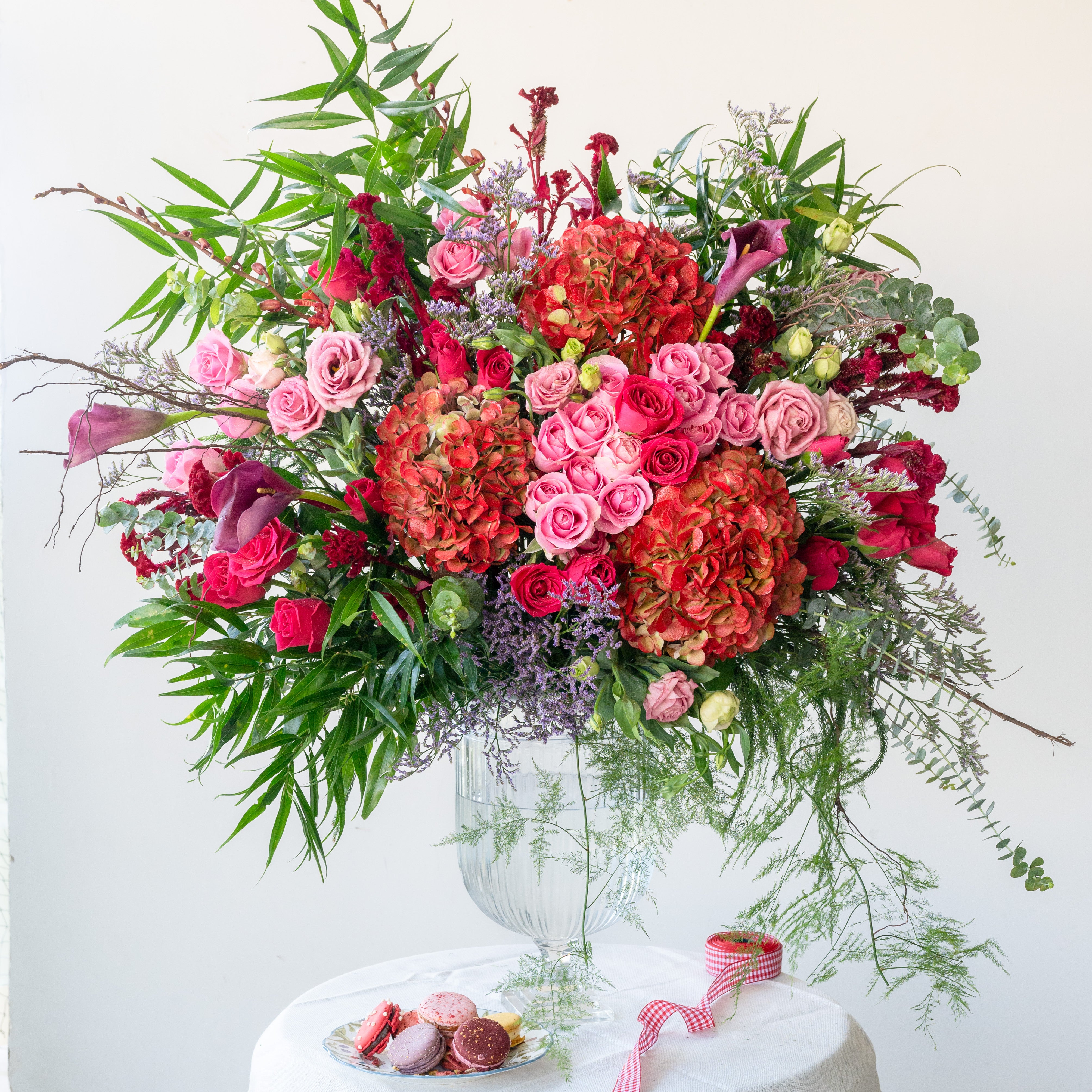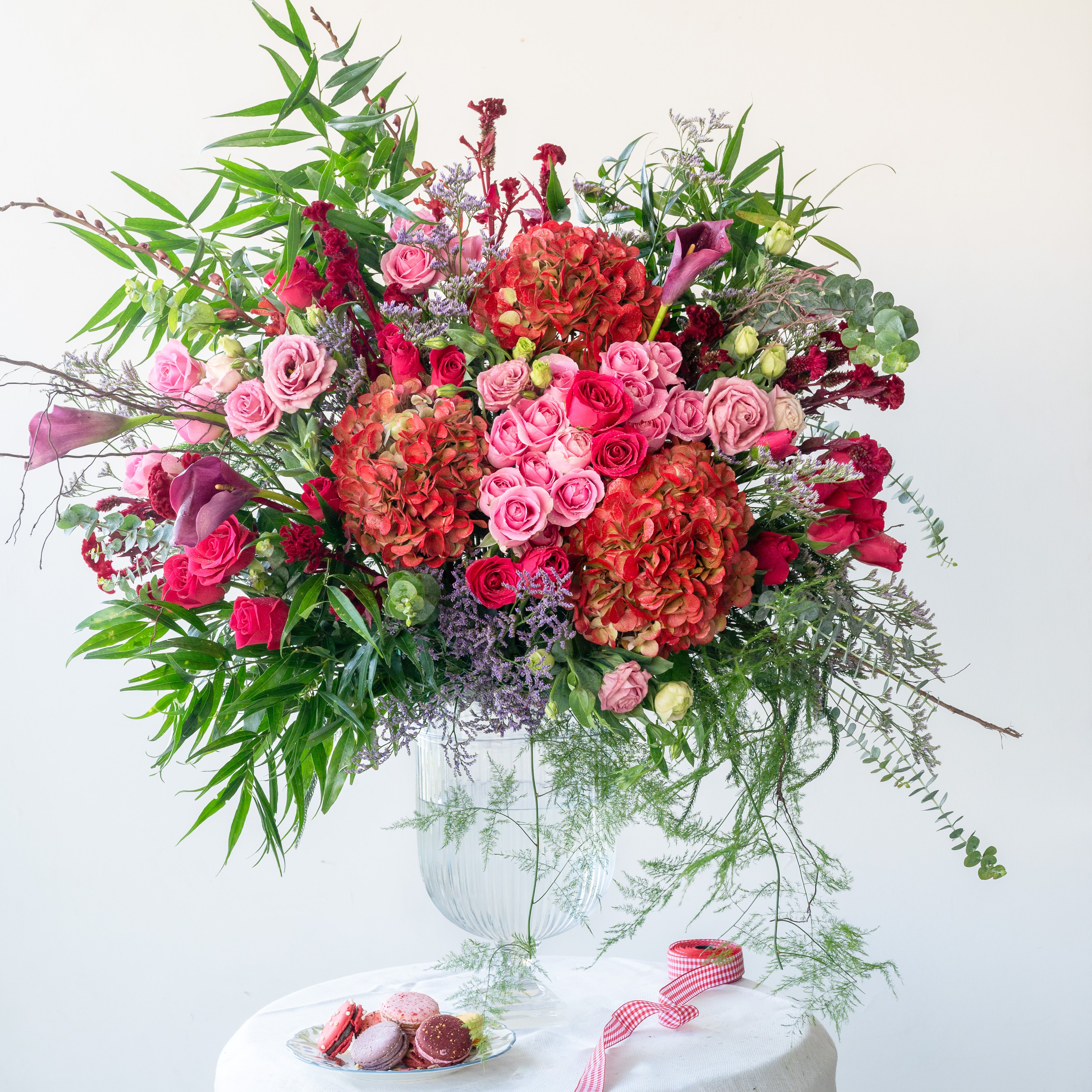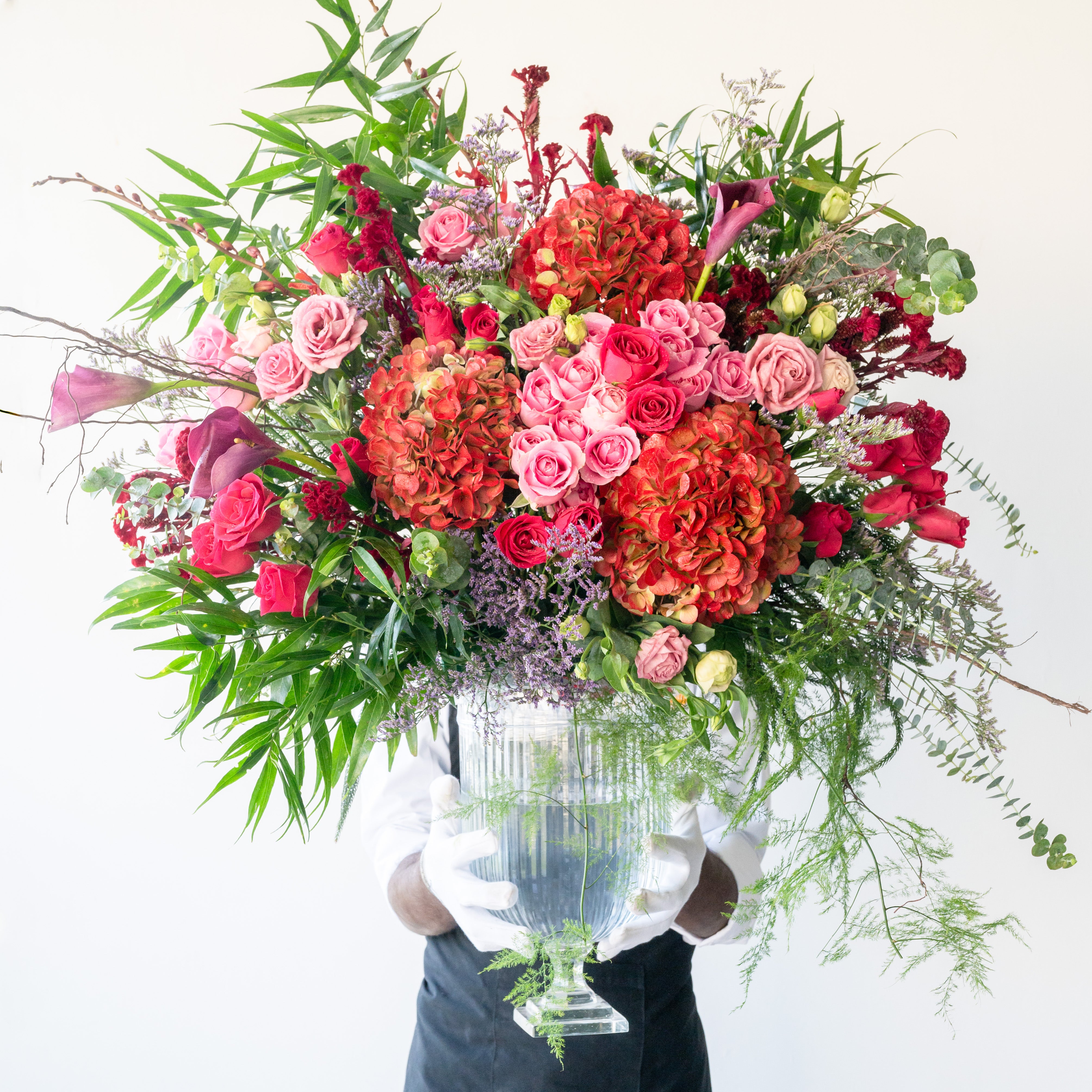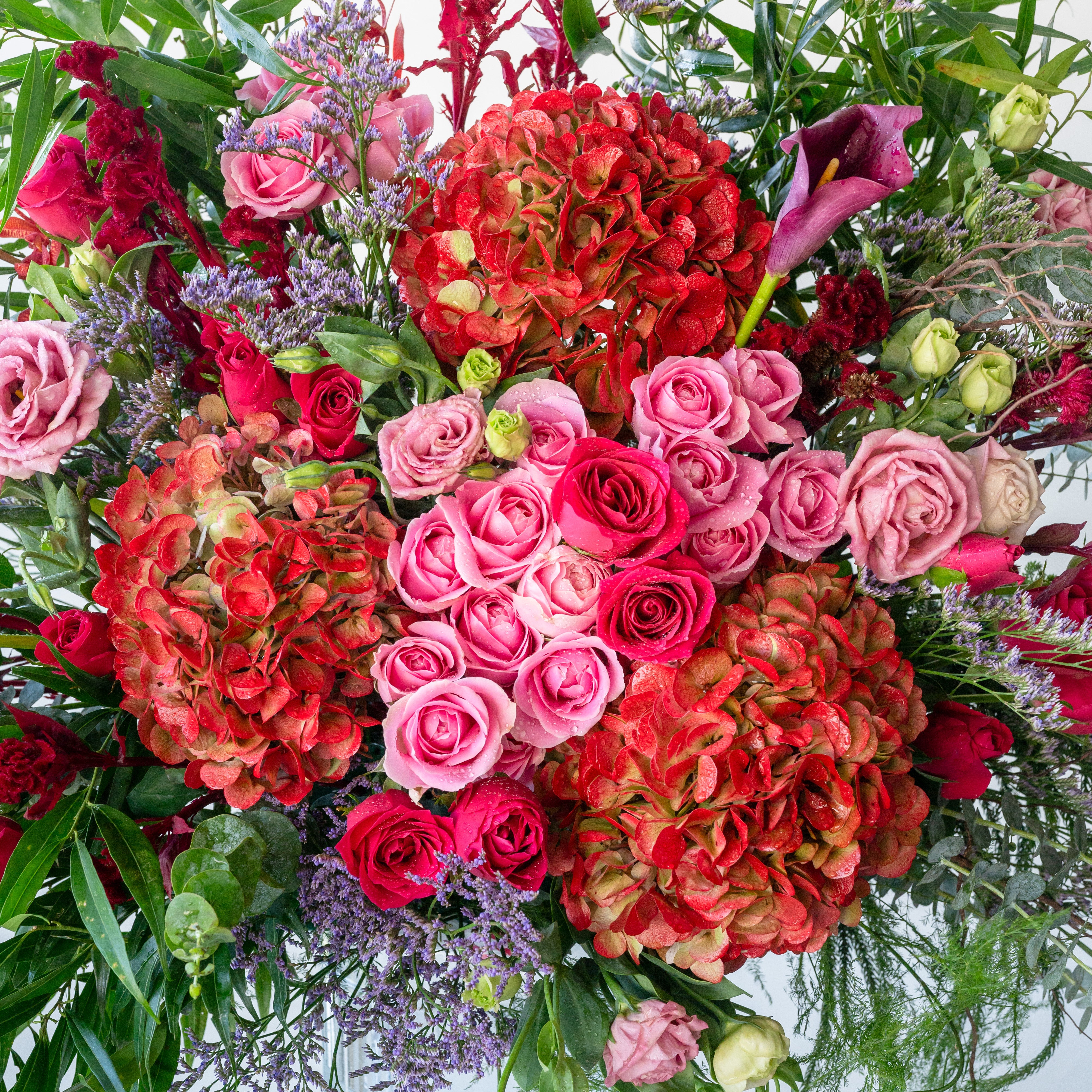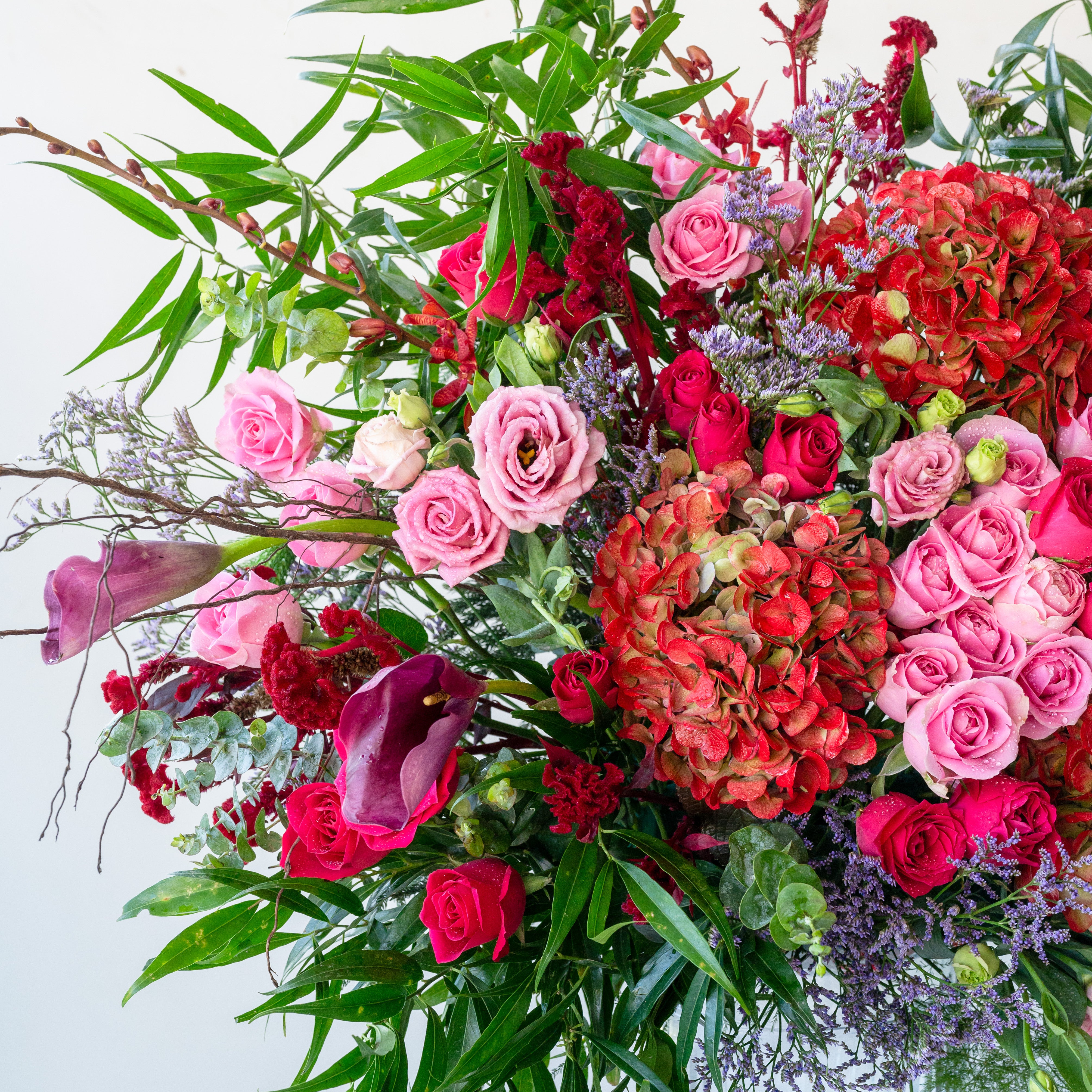 Flowers: Red Hydrangea, Dark Pink Roses, Pink Eustoma, Red Roses, Purple Calla Lily, Red Cockscomb, Red Spider Orchid, Eucalytpus, Limonium, Twigs & Natural Greens