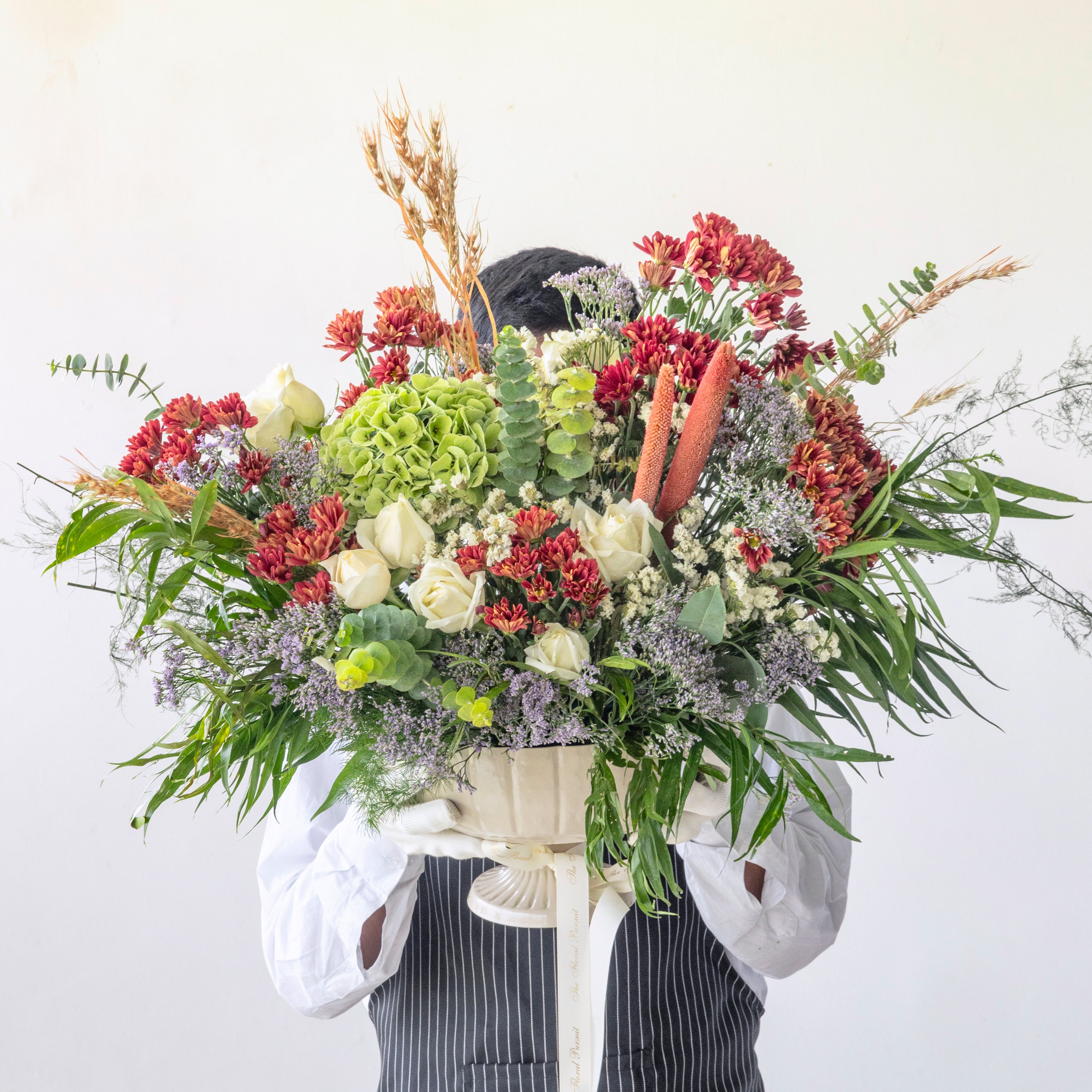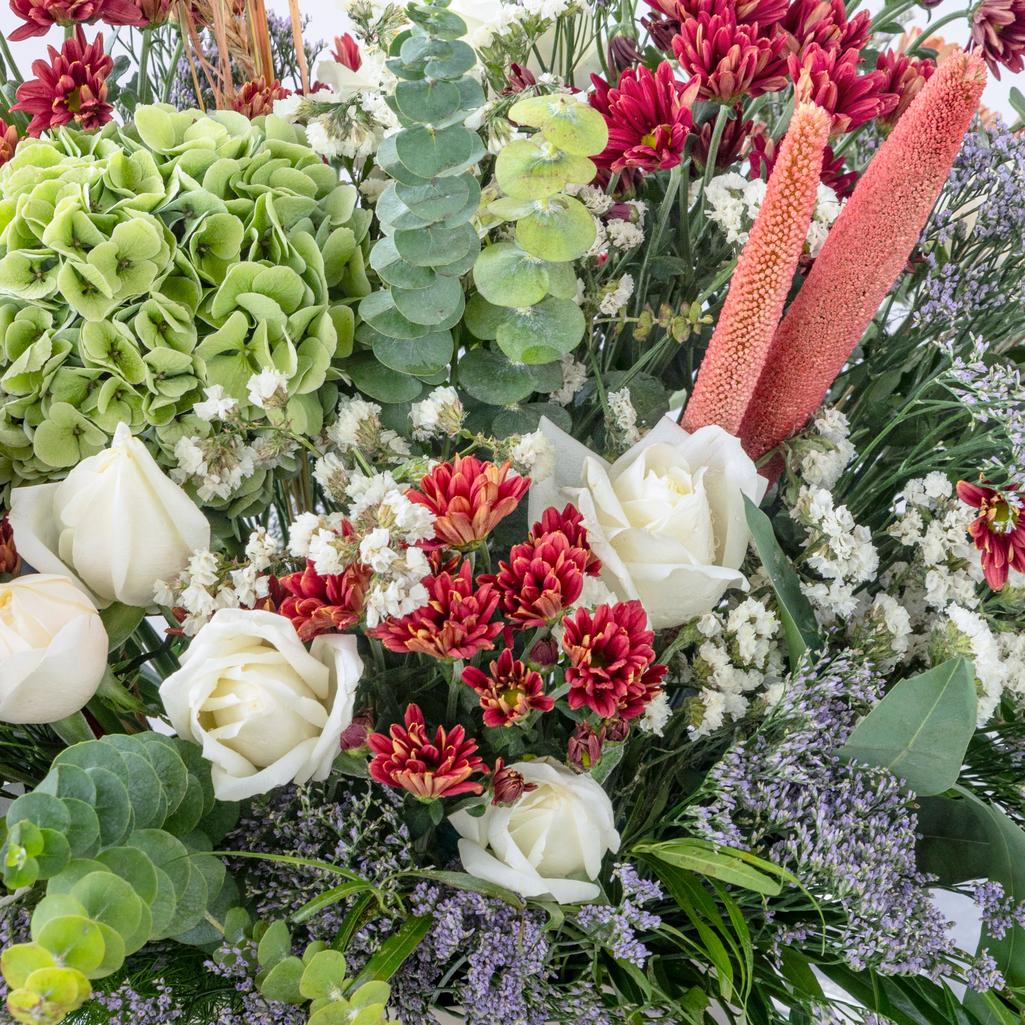 Flowers: Green Hydrangea, White Roses, Red Daisy, White Statice, Purple Limonium, Eucalyptus, Red Dry Bajra, Dry Wheat & Chilli Leaves