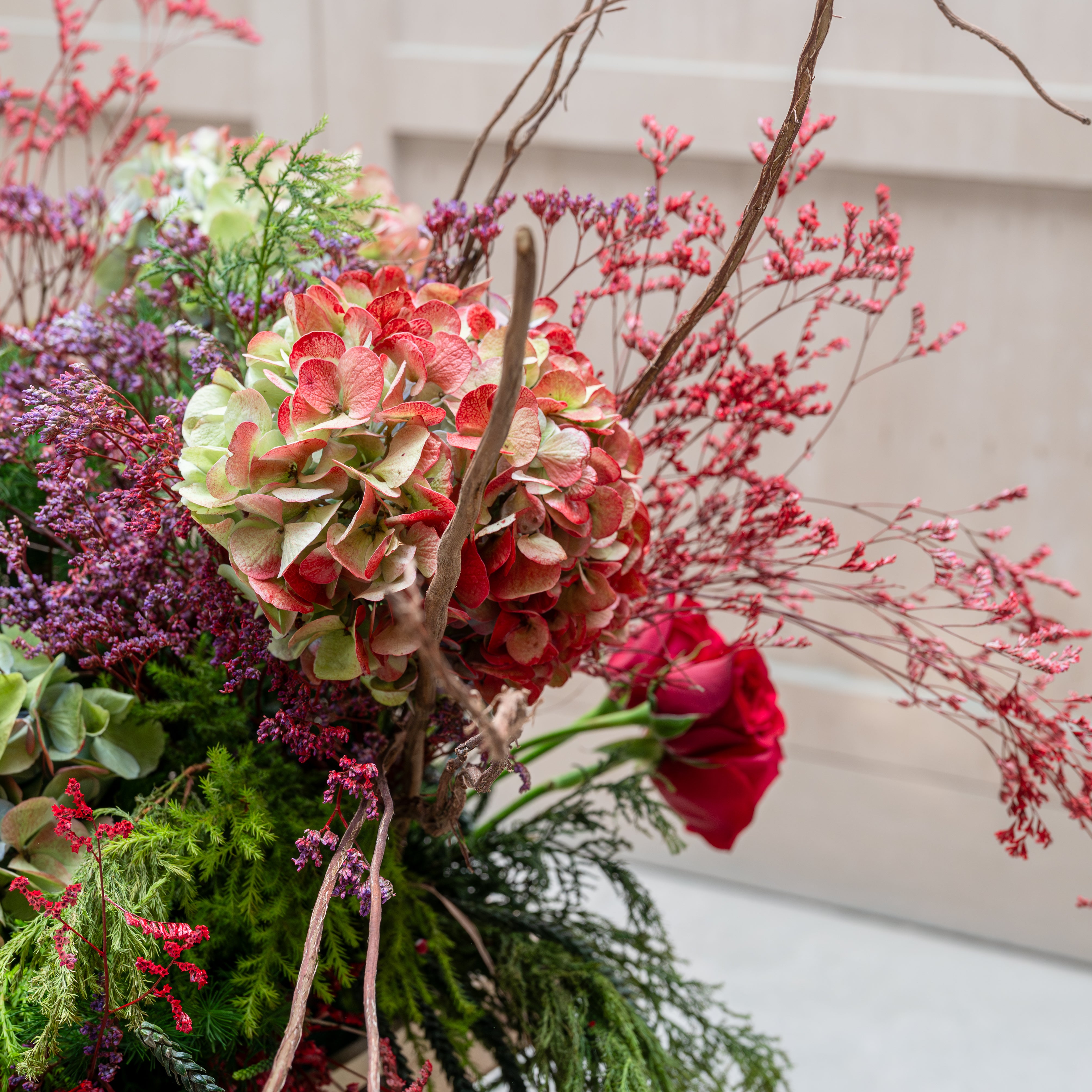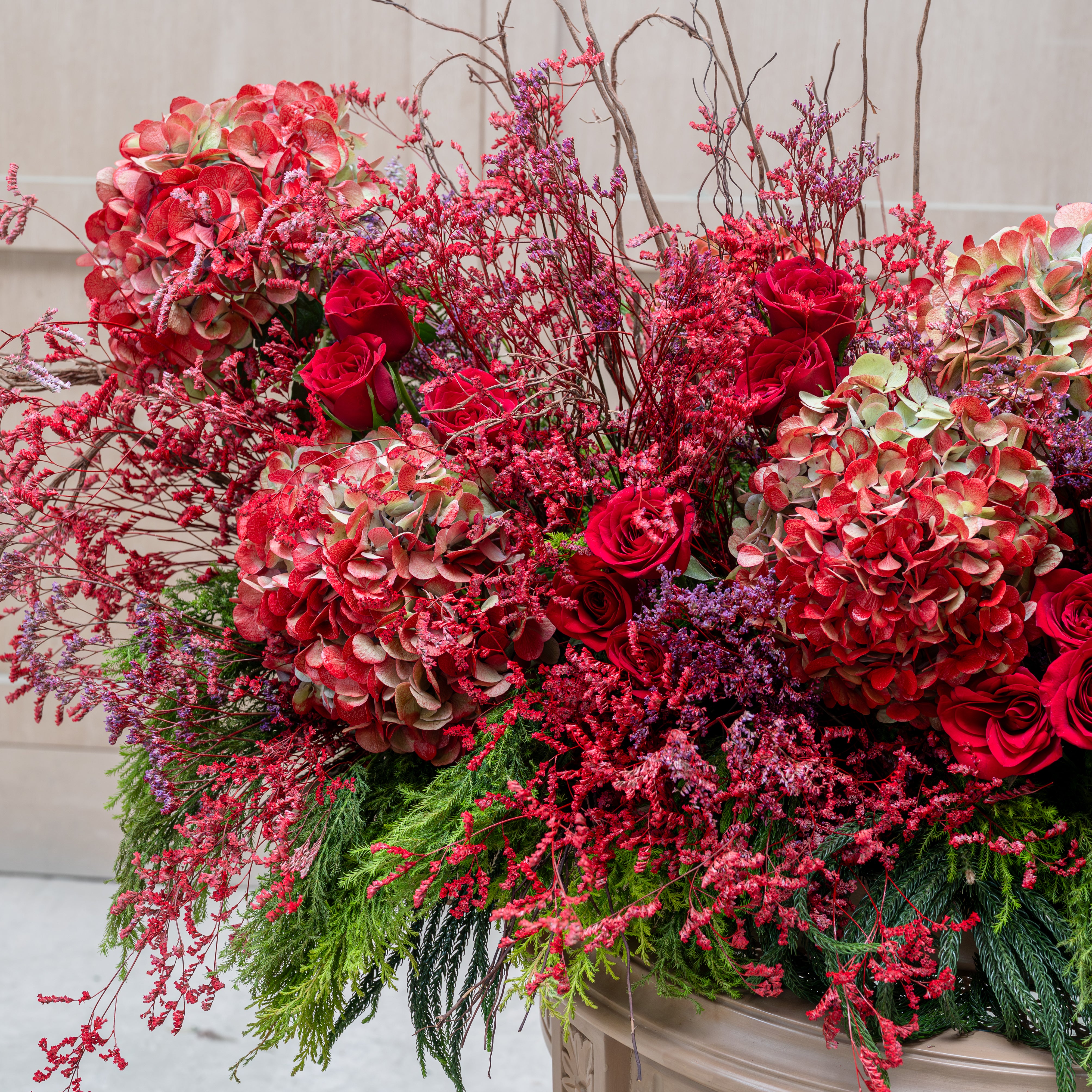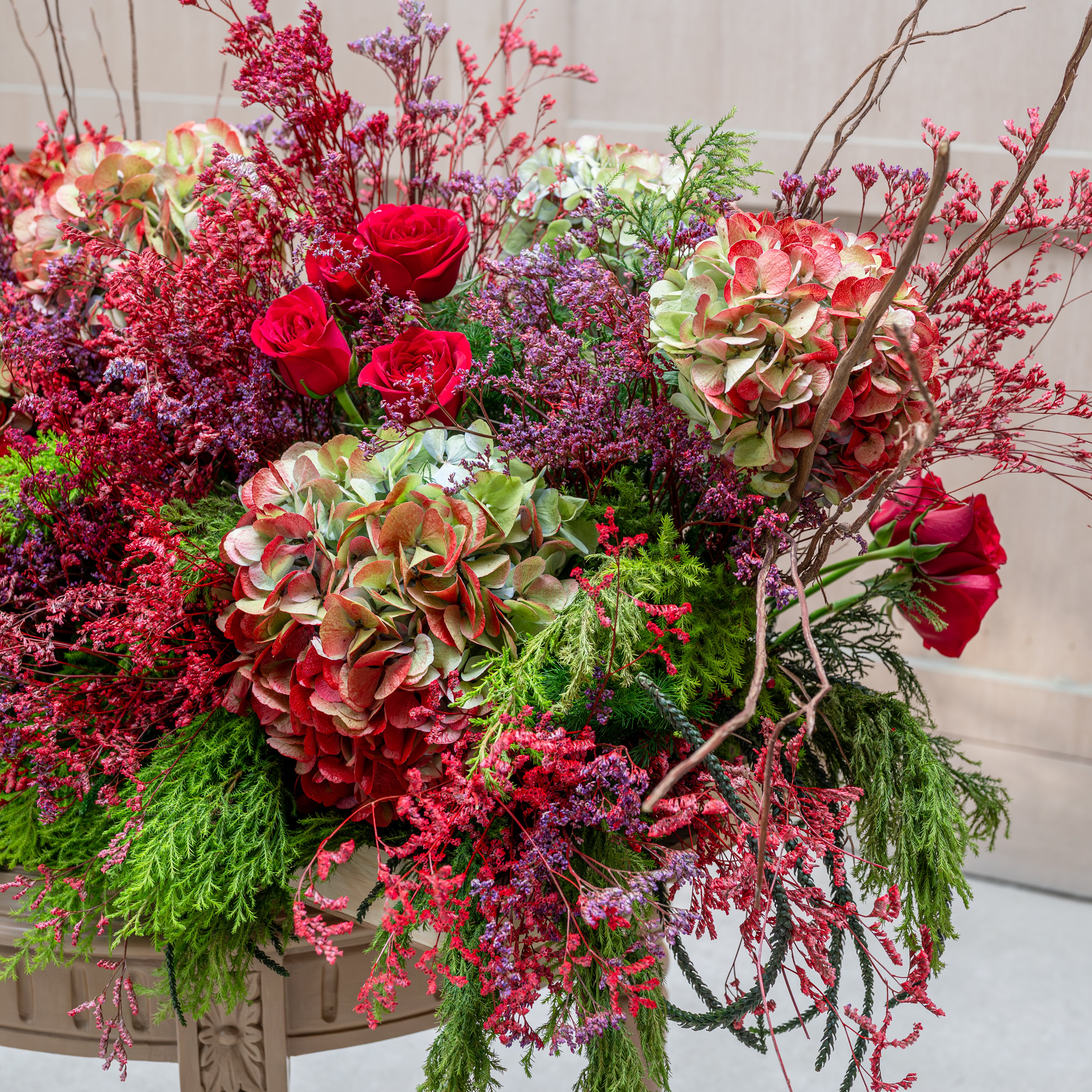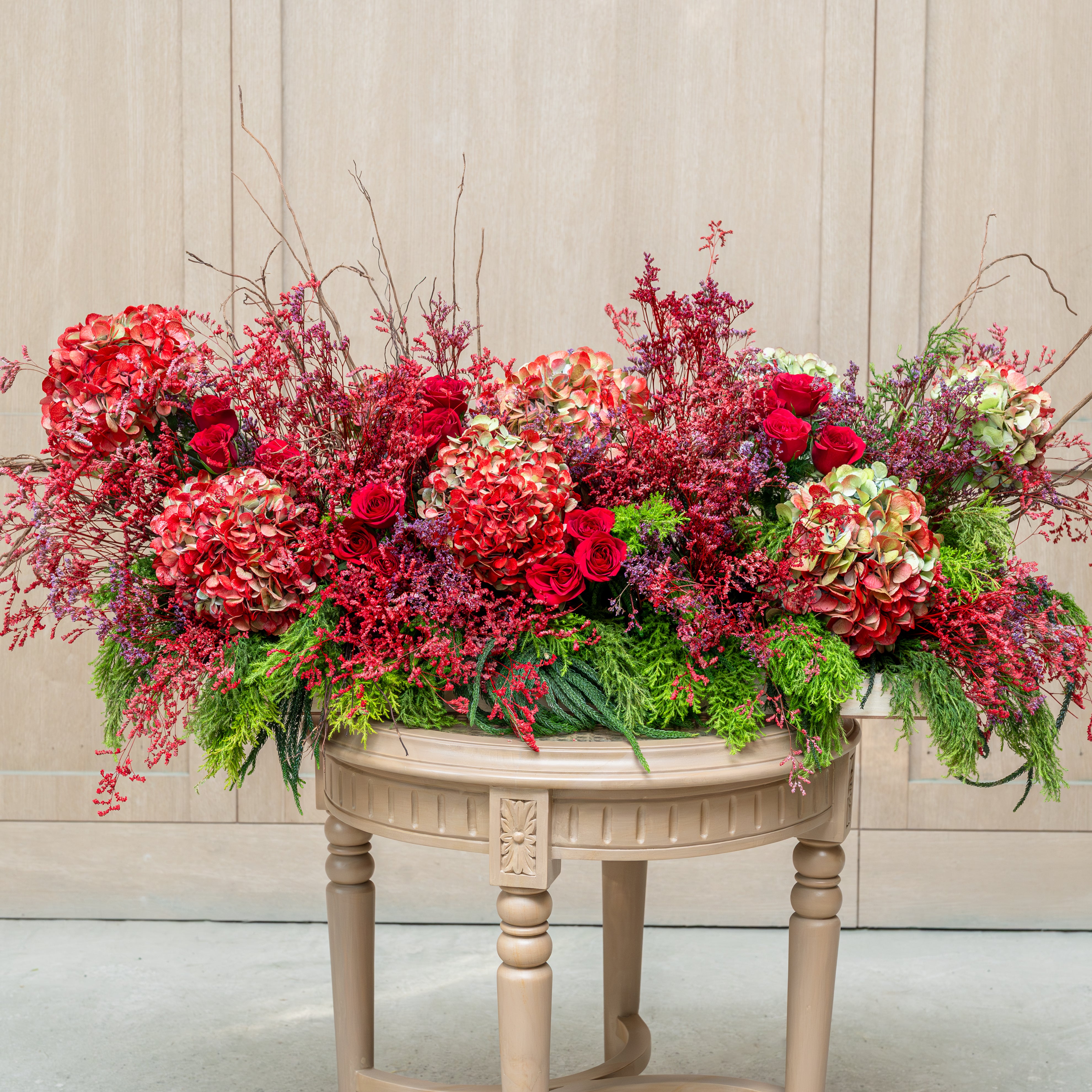 Flowers: Red Hydrangea, Red Roses, Faux Berries, Mixed Greens & Twigs