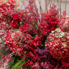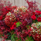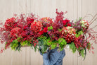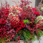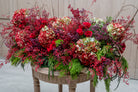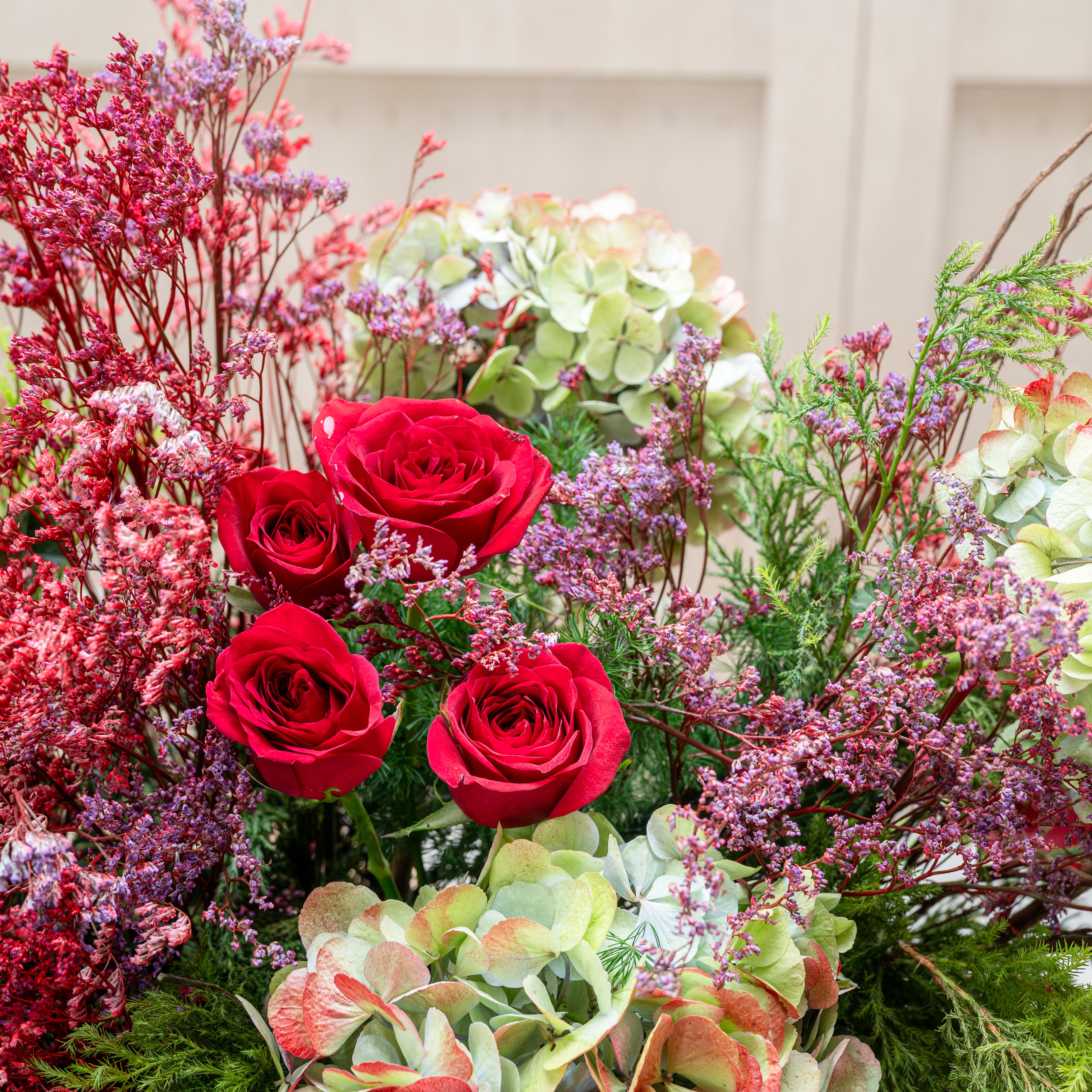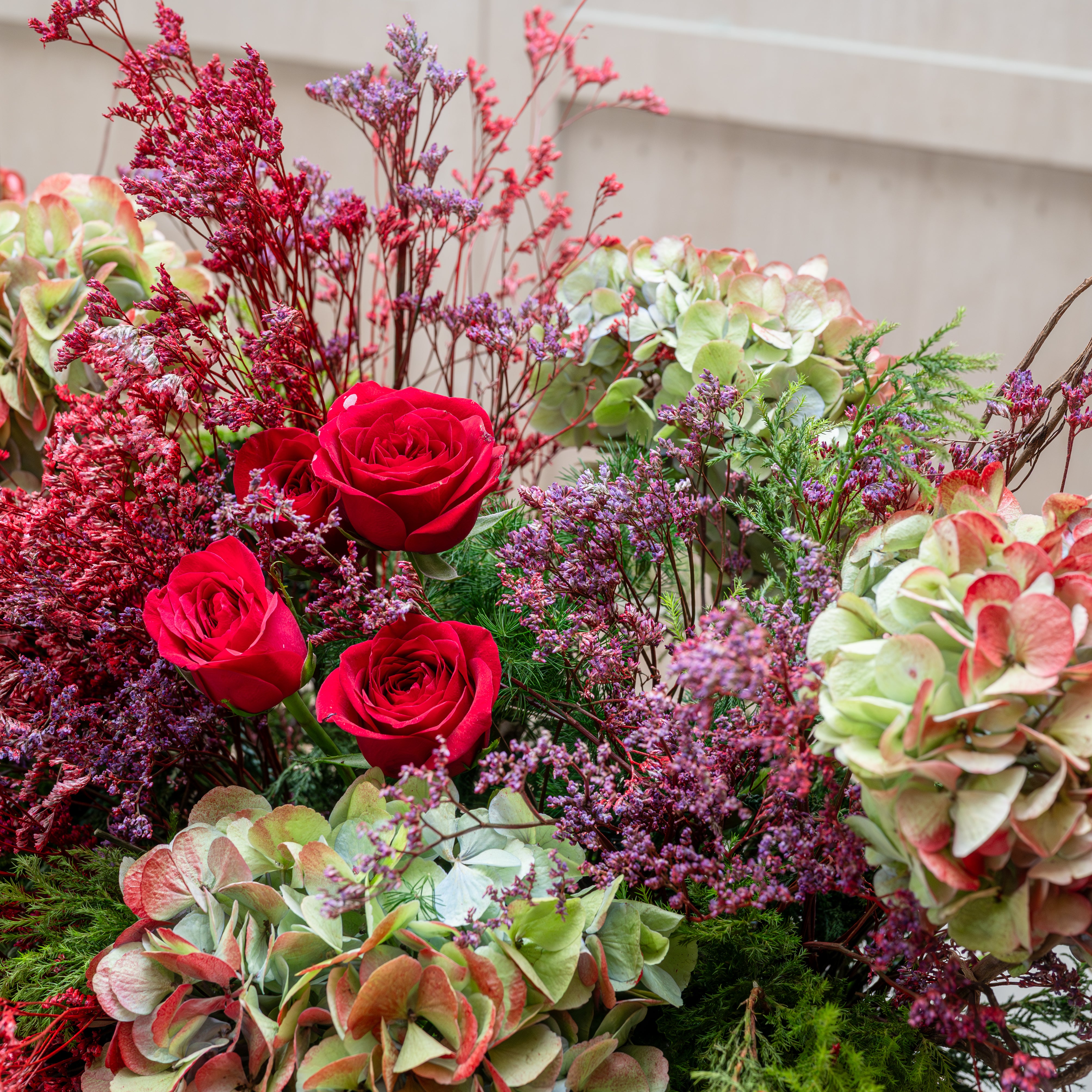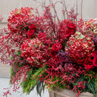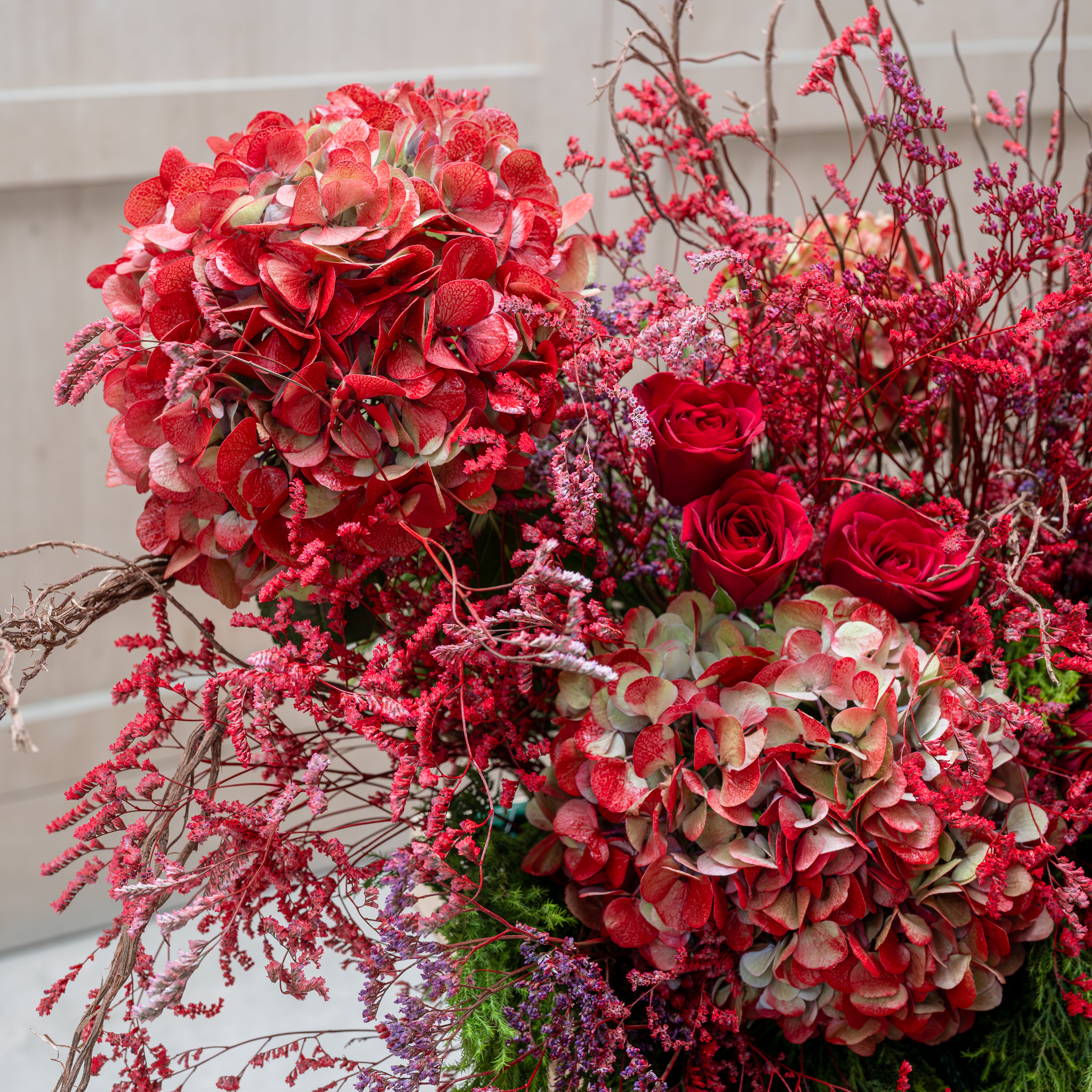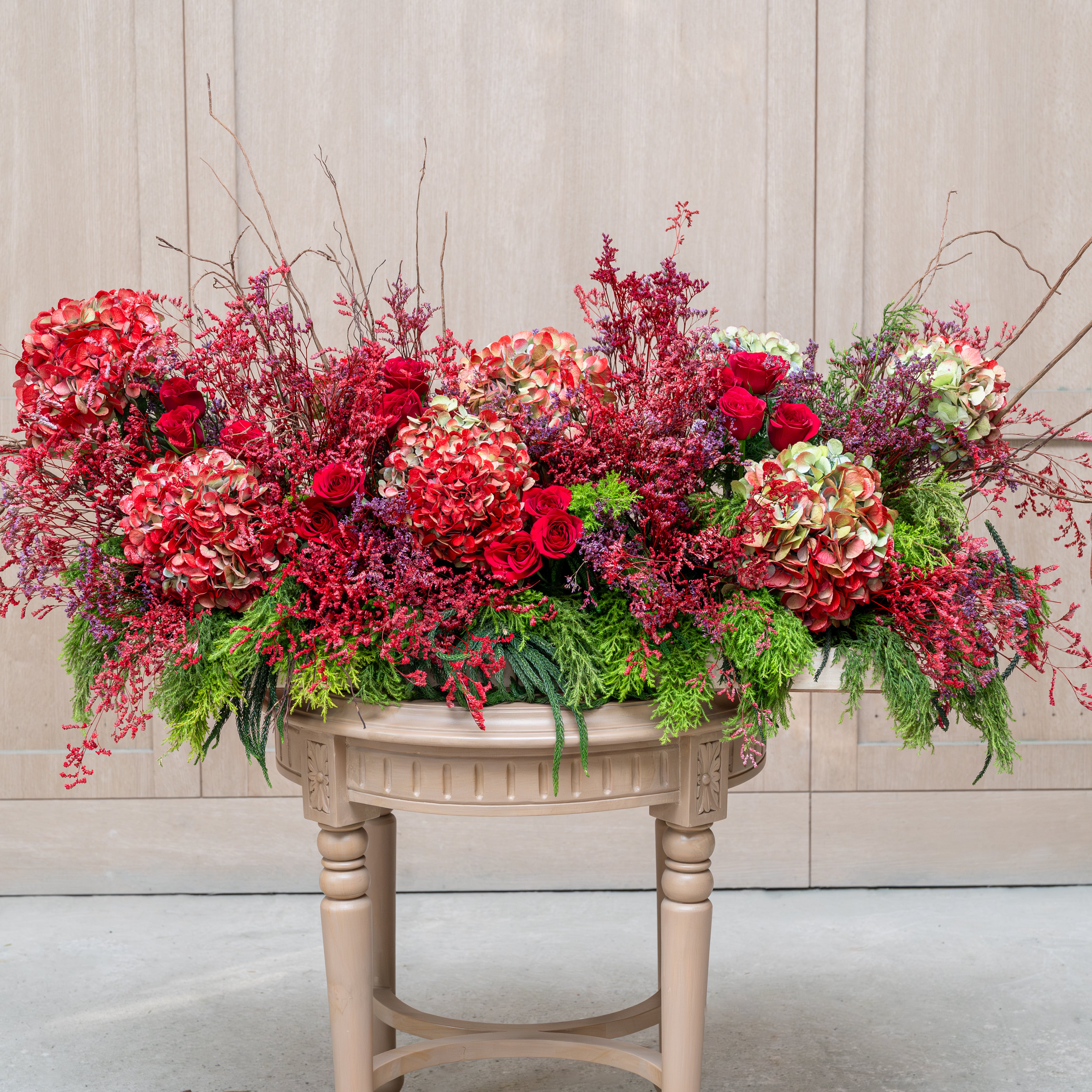 Flowers: Red Hydrangea, Red Roses, Faux Berries, Mixed Greens & Twigs