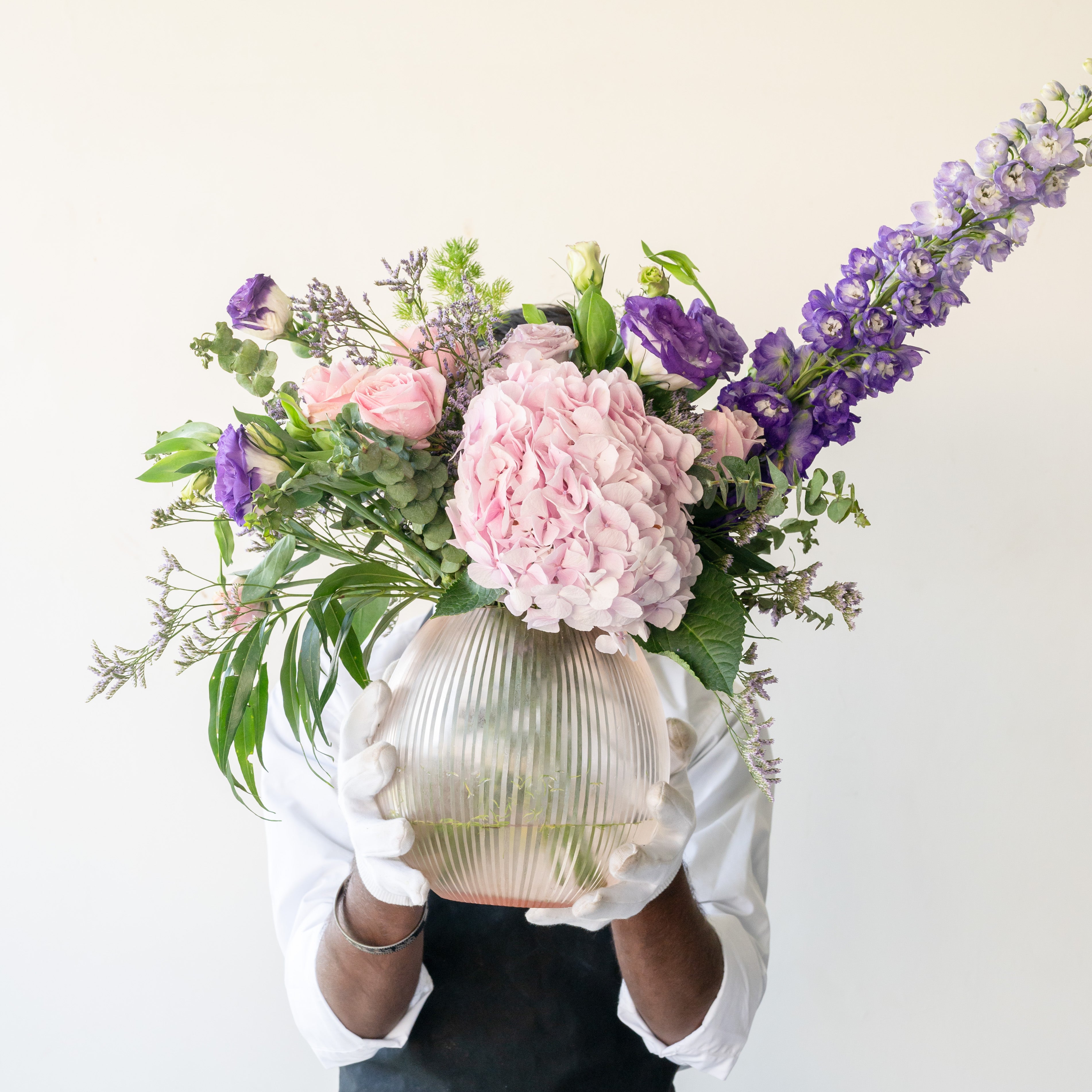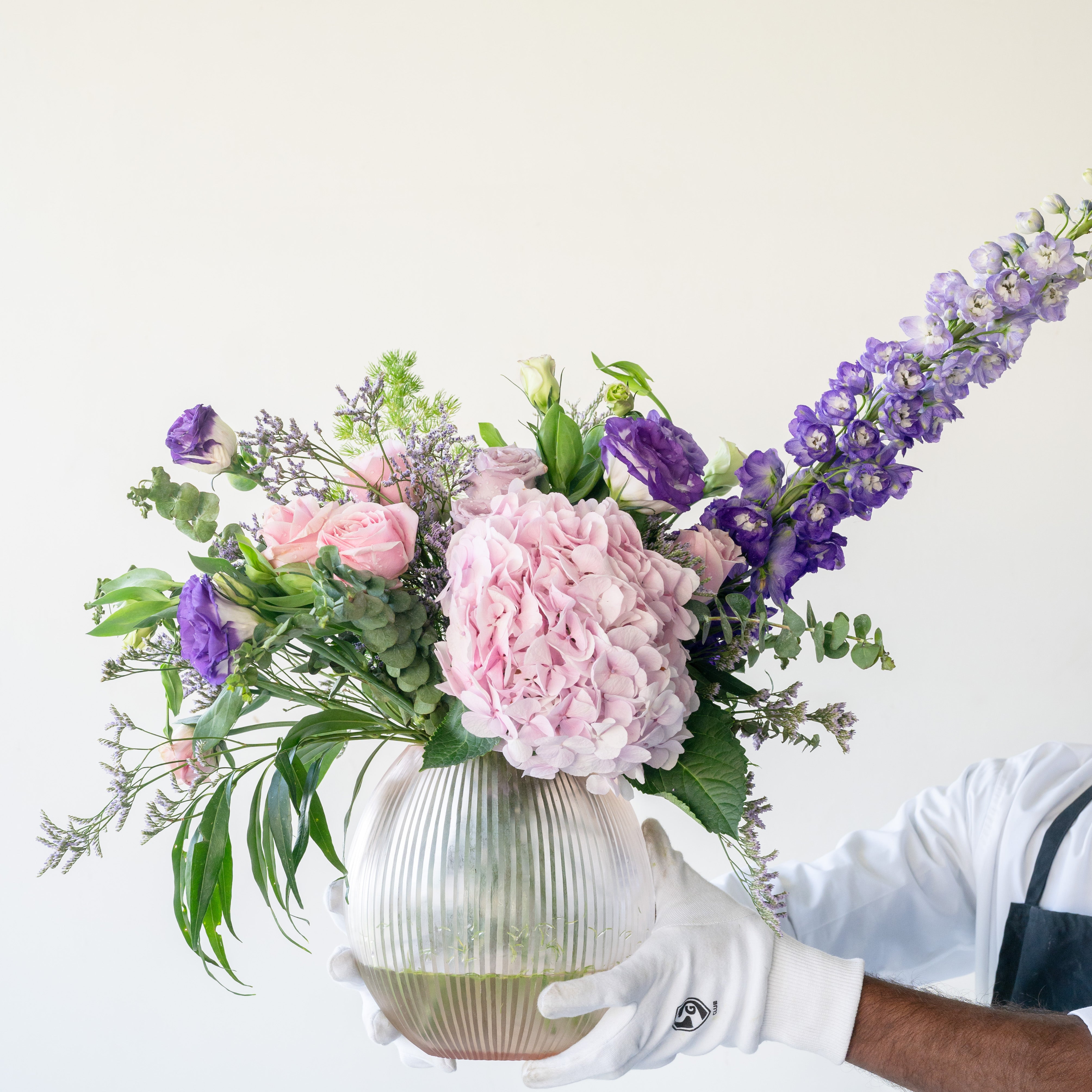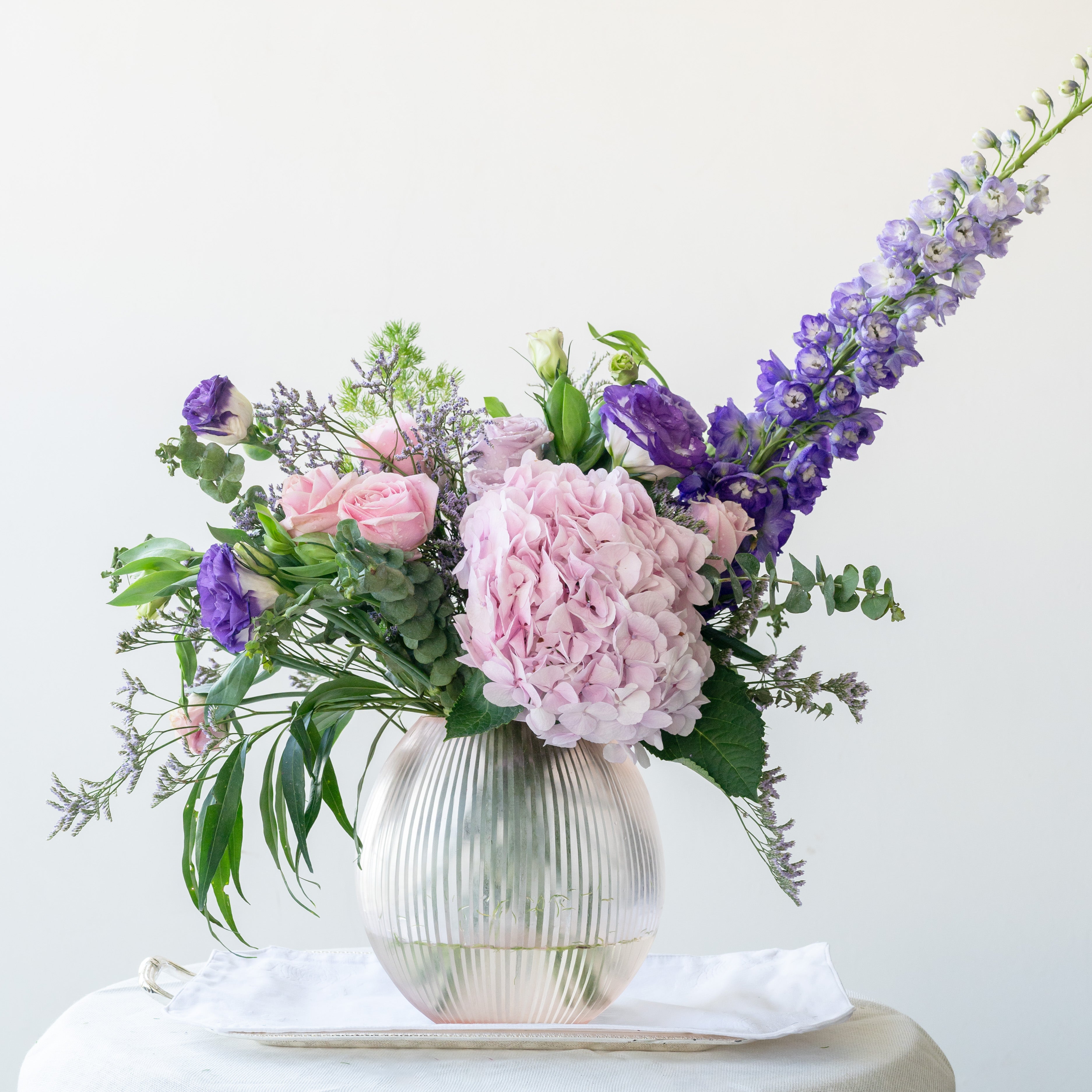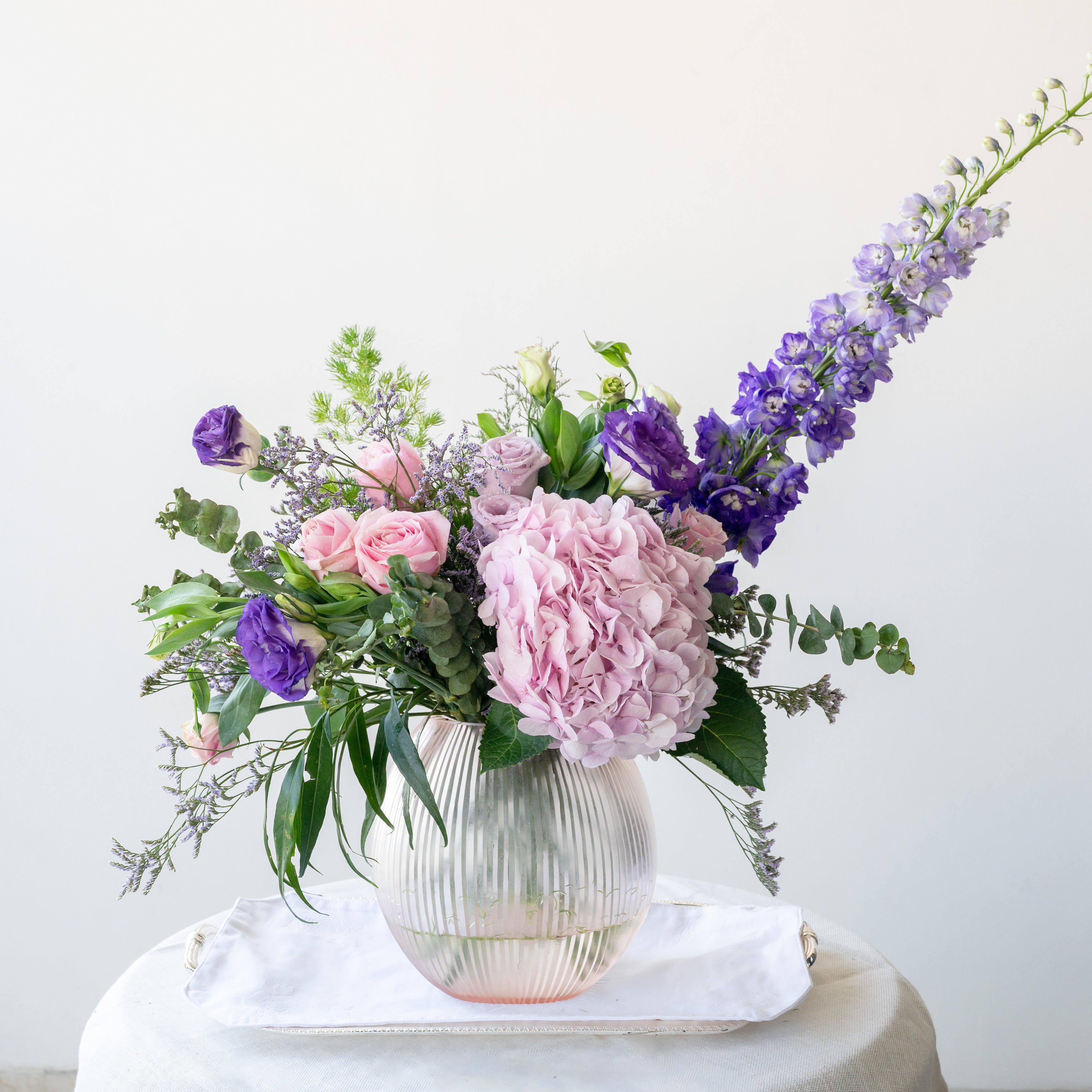 Flowers: Pink Hydrangea, Purple Delphinium, Sweet Pink Roses, Lavender Roses, Purple Eustomas, Limonium, Eucalyptus & Natural Greens