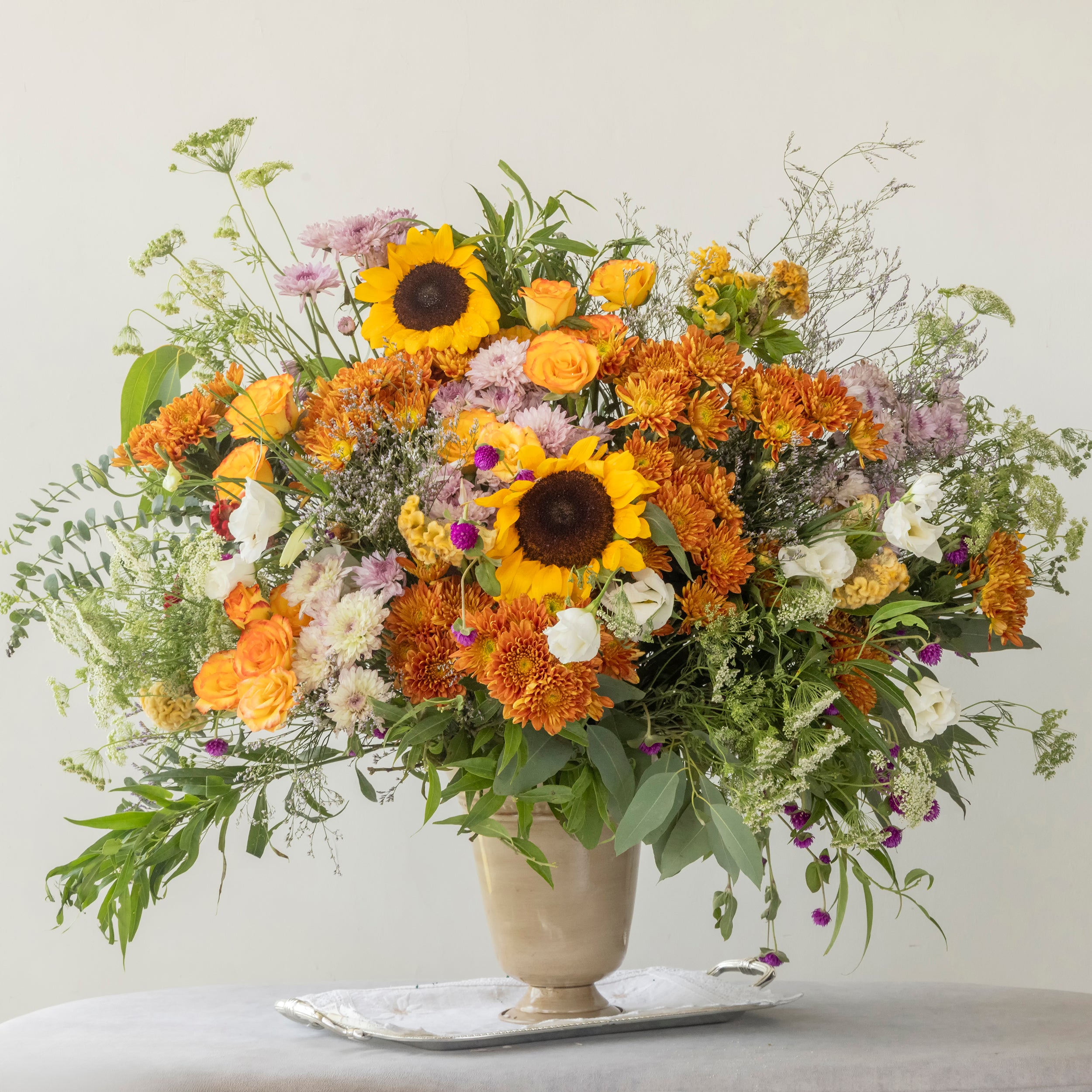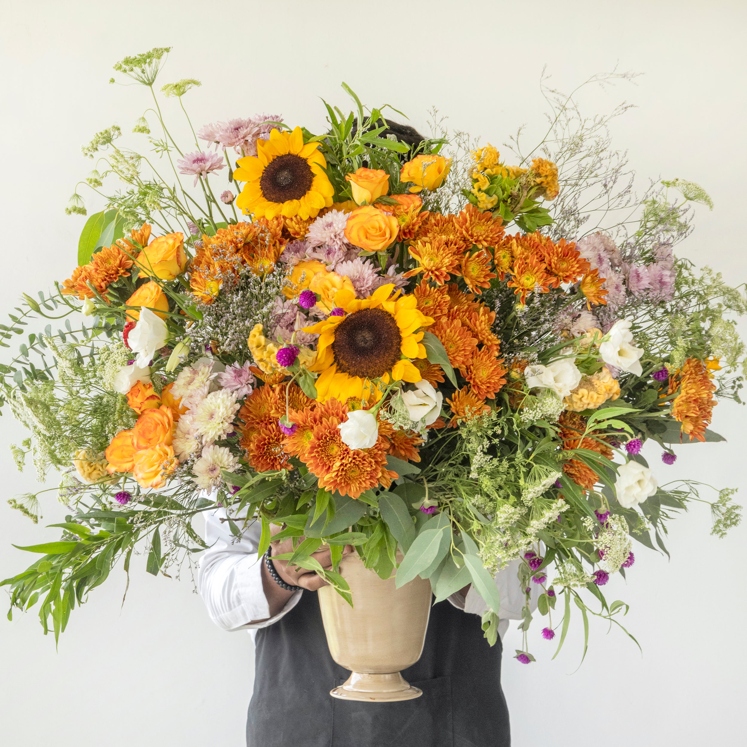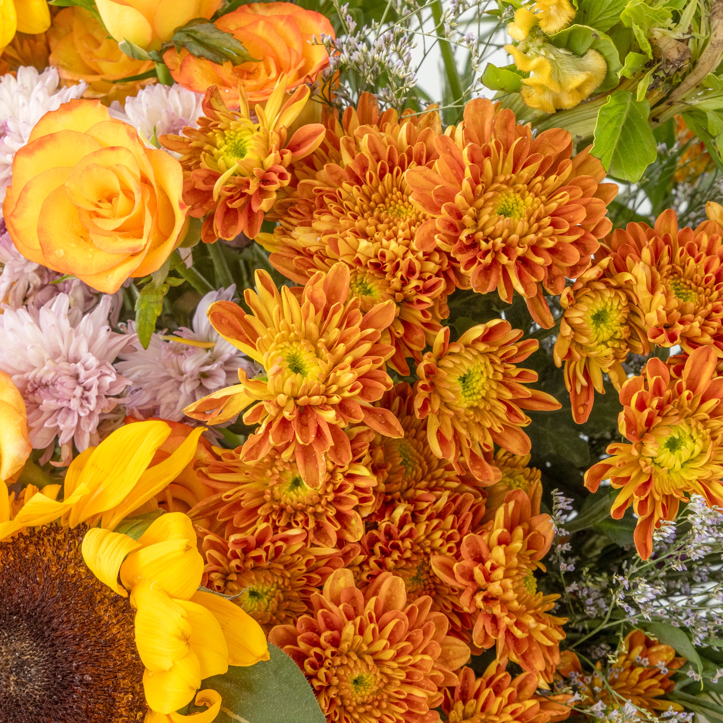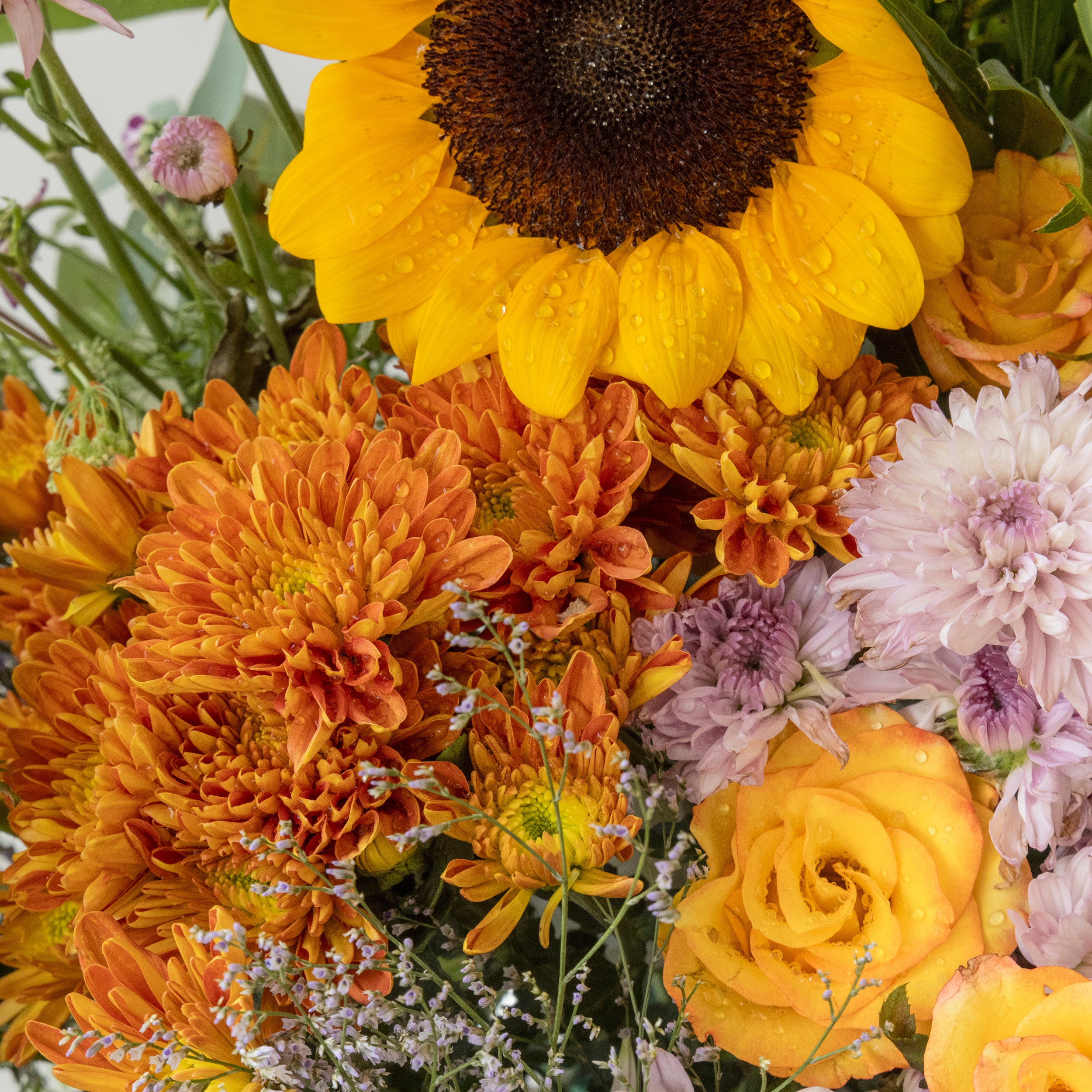 Flowers: Sunflower, Orange Daisy, Double Shaded Orange Roses, Pink Daisy, White Eustma, Yellow Cockscomb, Gomphrena, Lady Lux, Eucalyptus, Limonium & Mixed Greens
