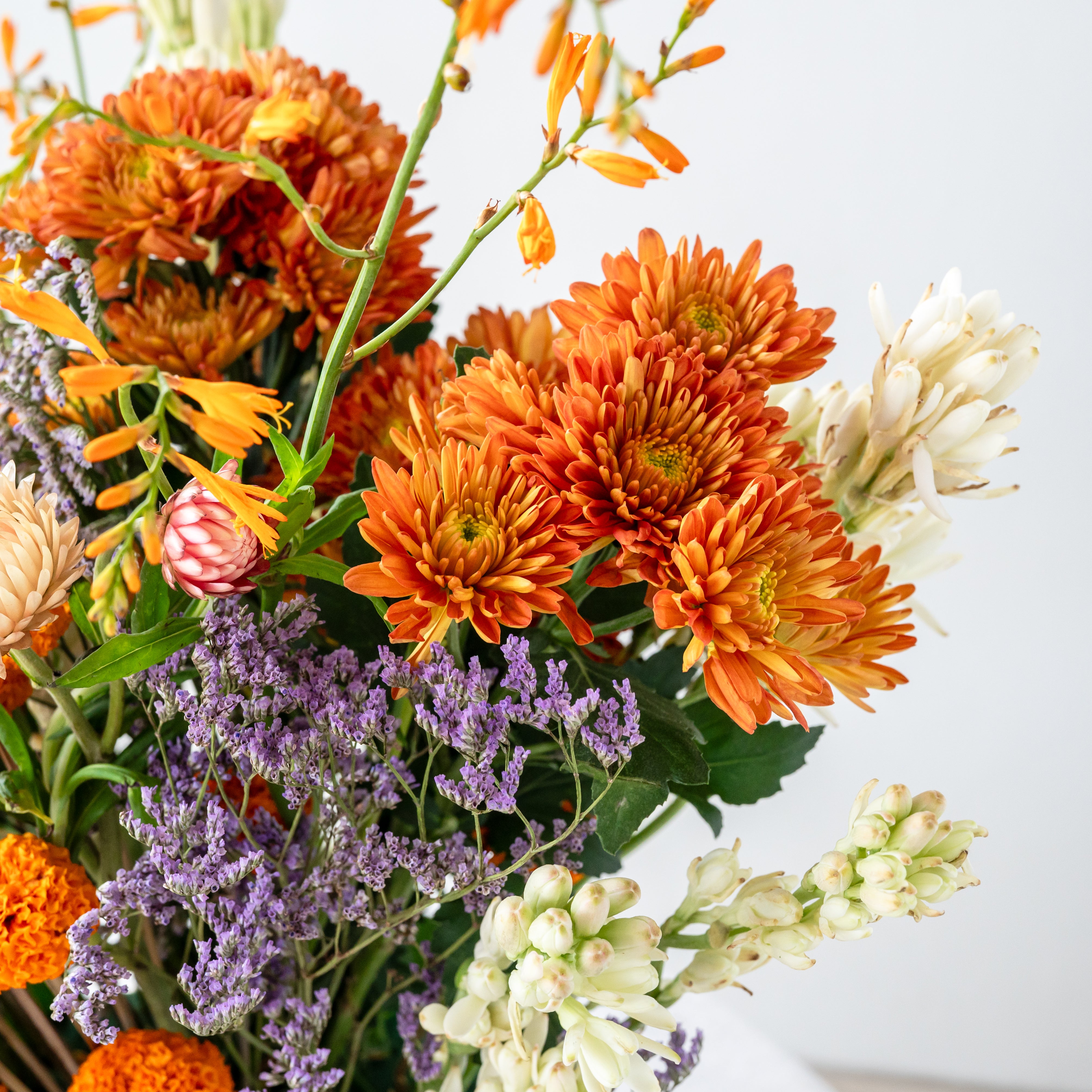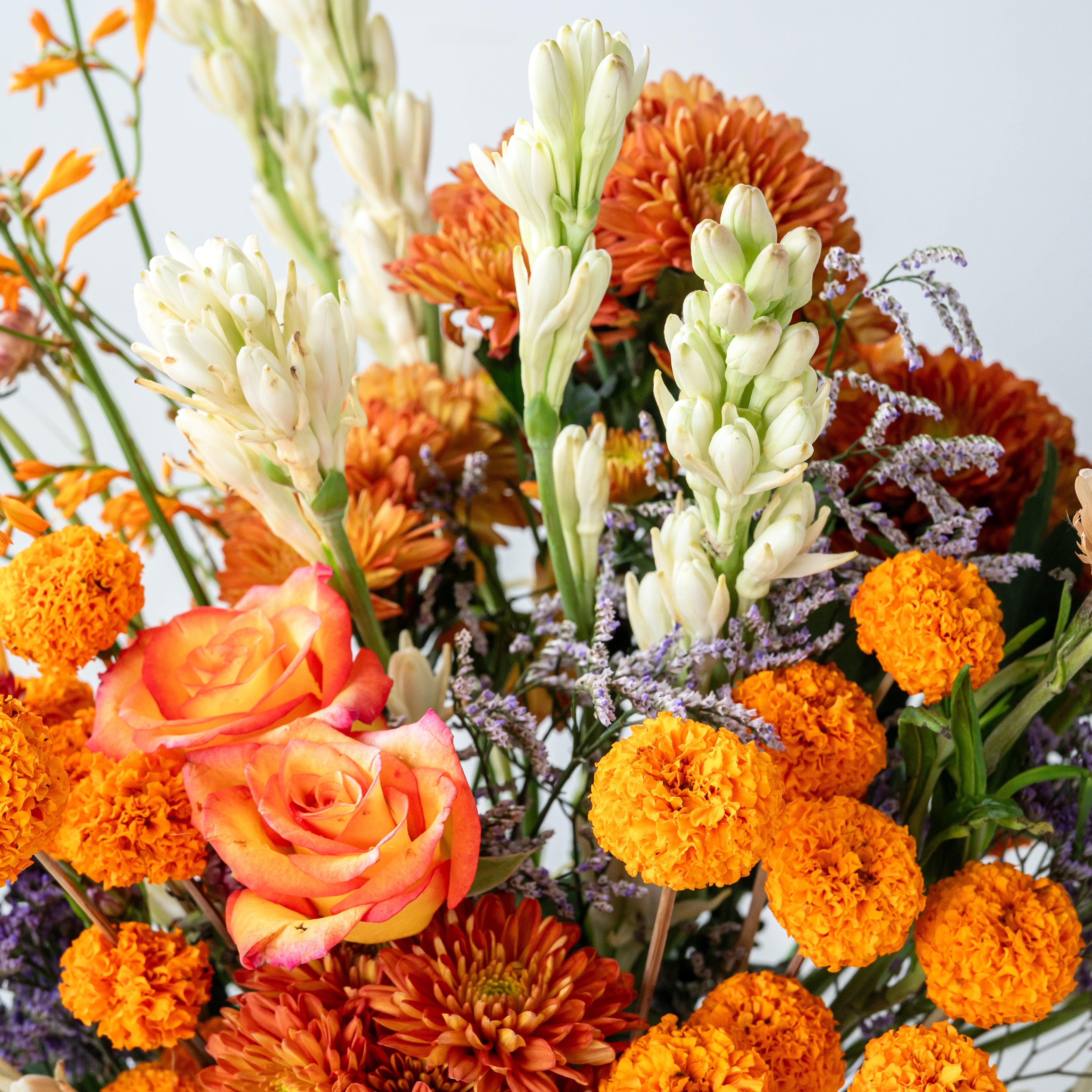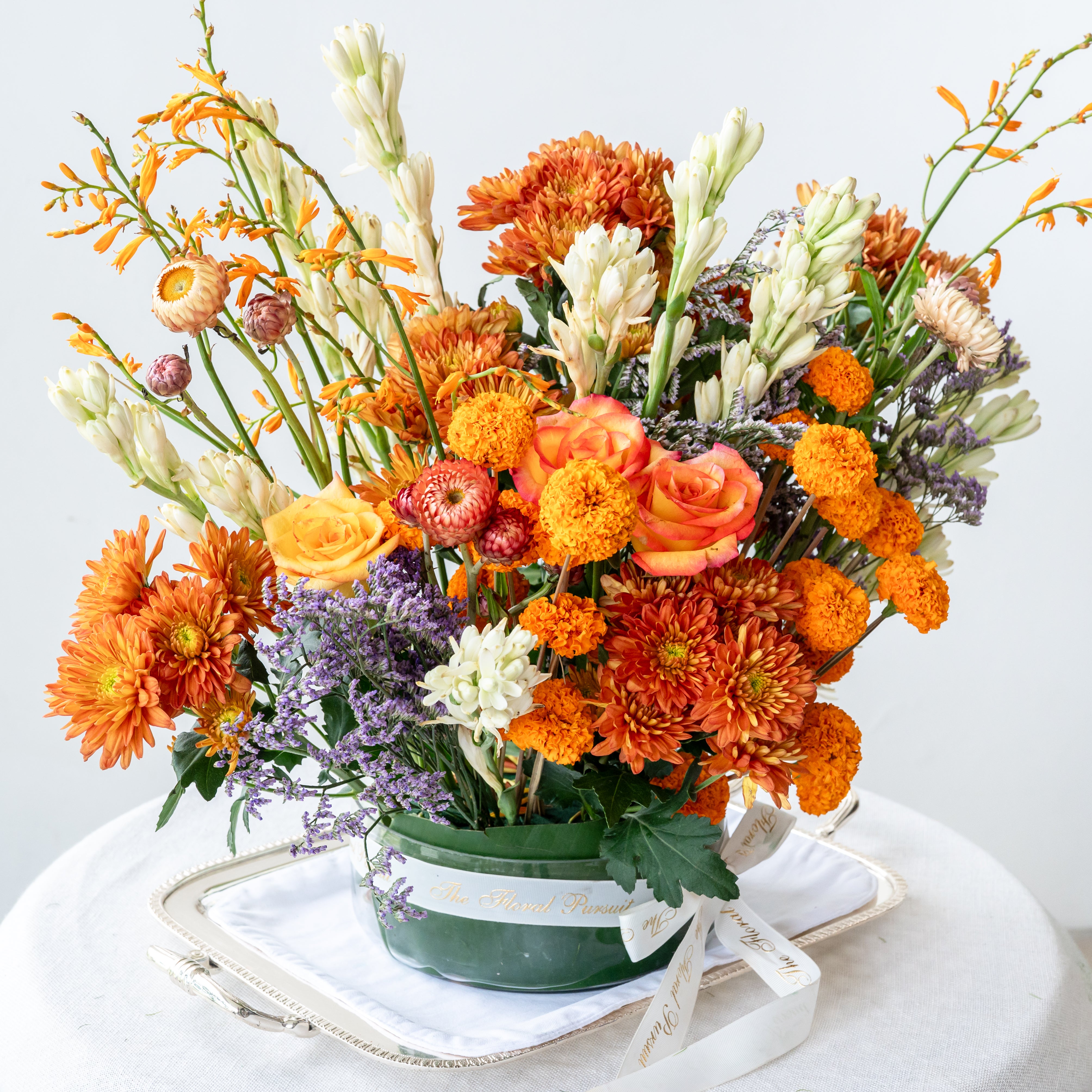 Flowers: Montbretia, Paper flower, Orange Daisy, Ranigandha, Limonium, Orange Roses, Marigold, Limonium