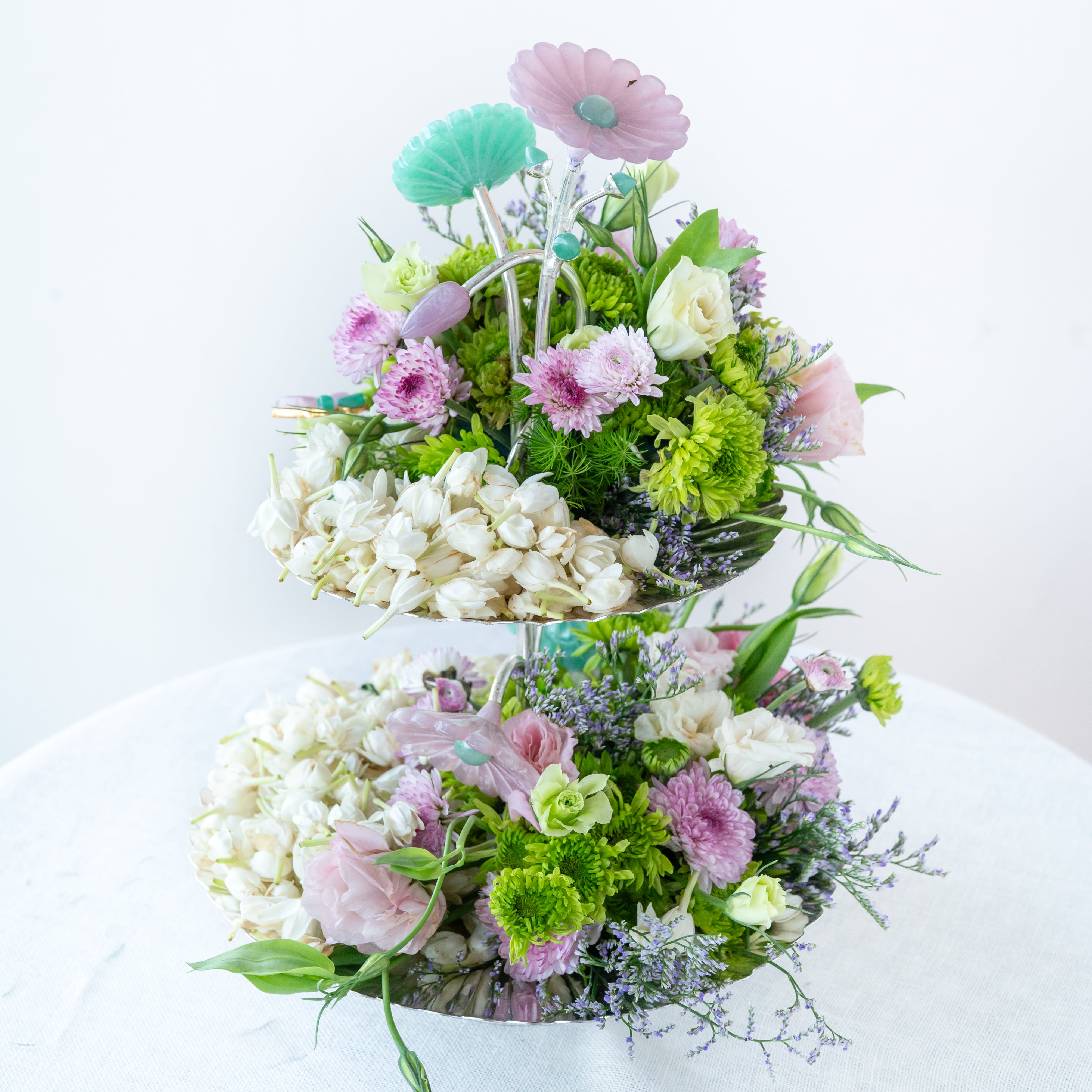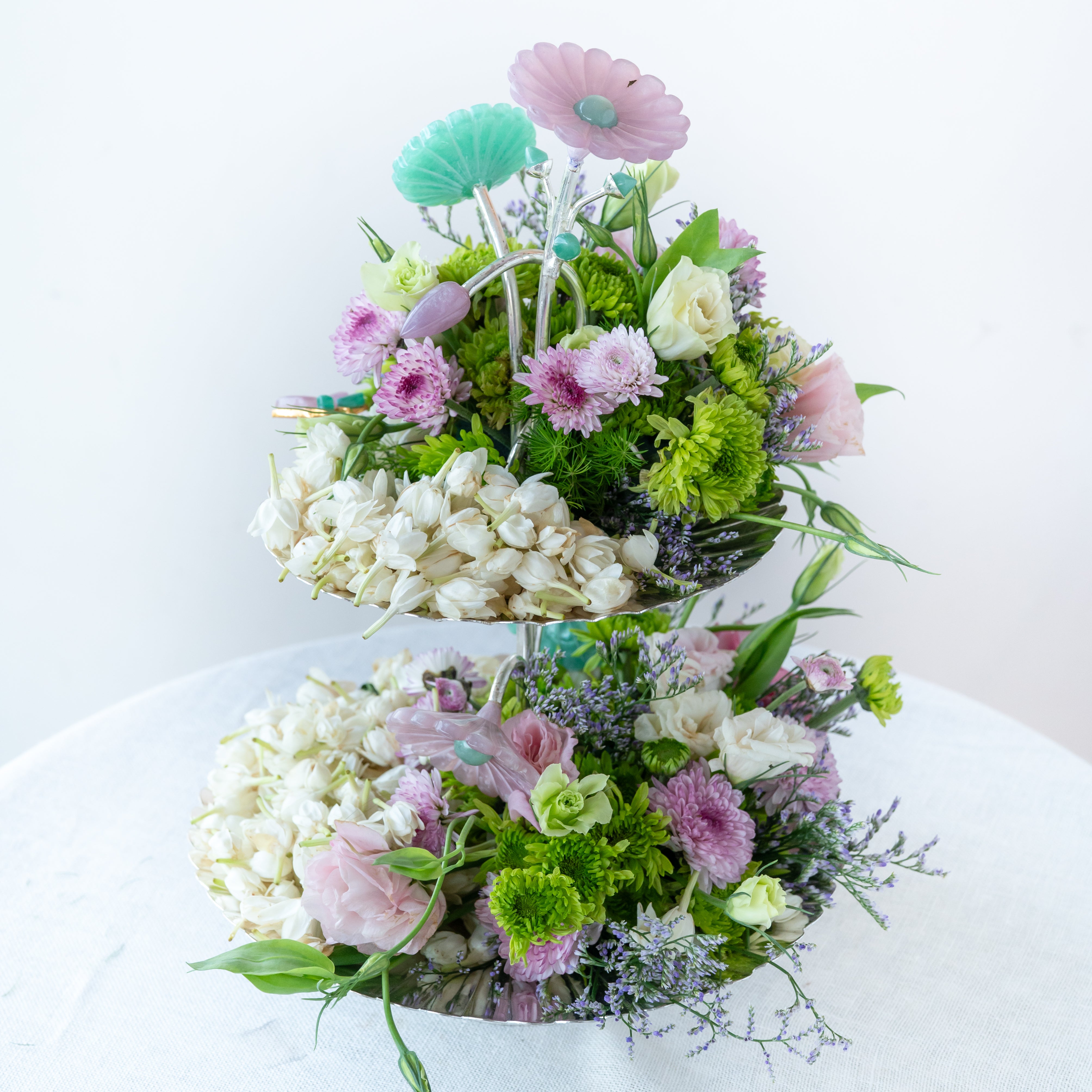 A stunning two-tier cake stand transformed into a breathtaking floral arrangement — an elegant blend of freshness and creativity. Adorned with delicate blooms in soft pastel shades of pink, white, green, and lavender, this piece beautifully combines charm and sophistication.
