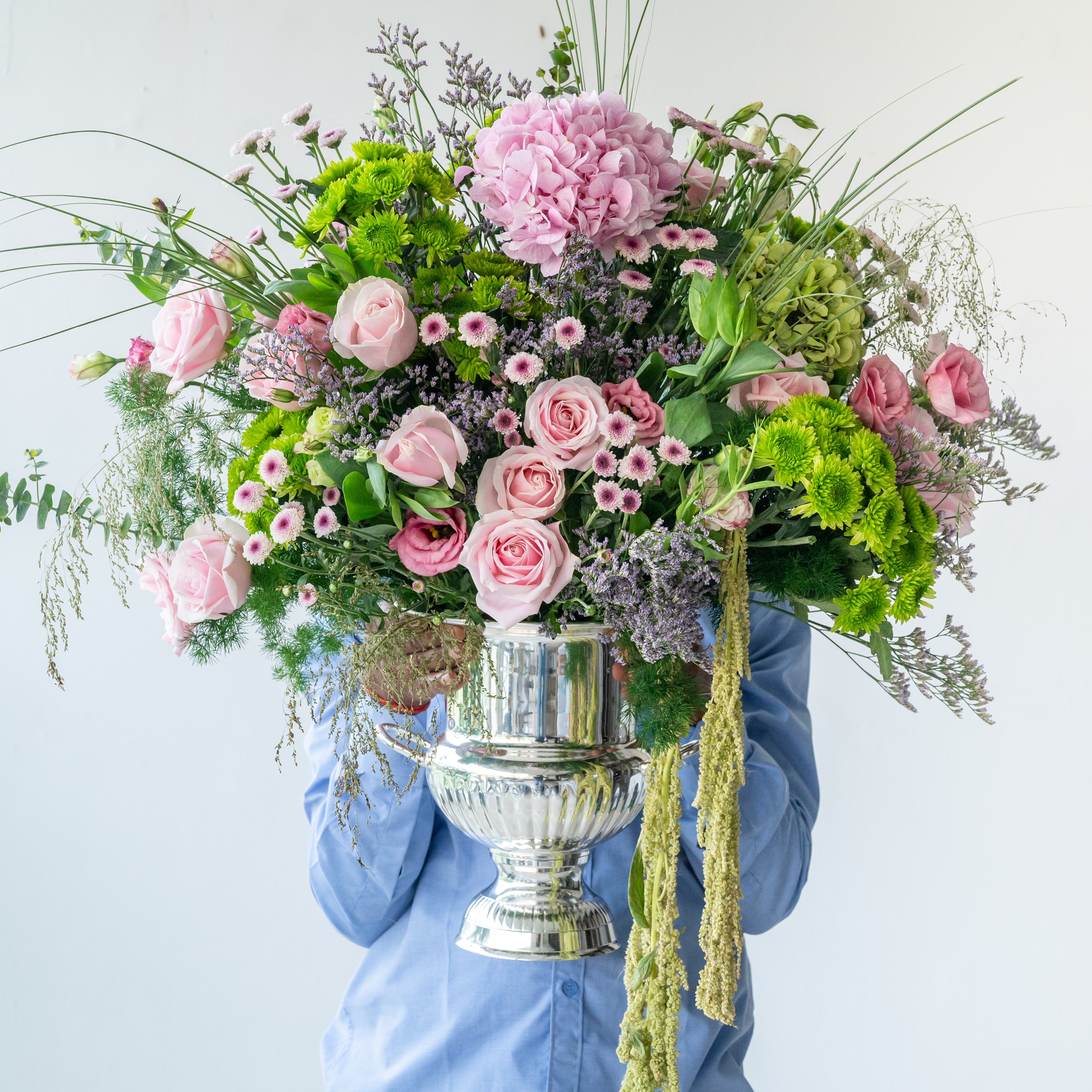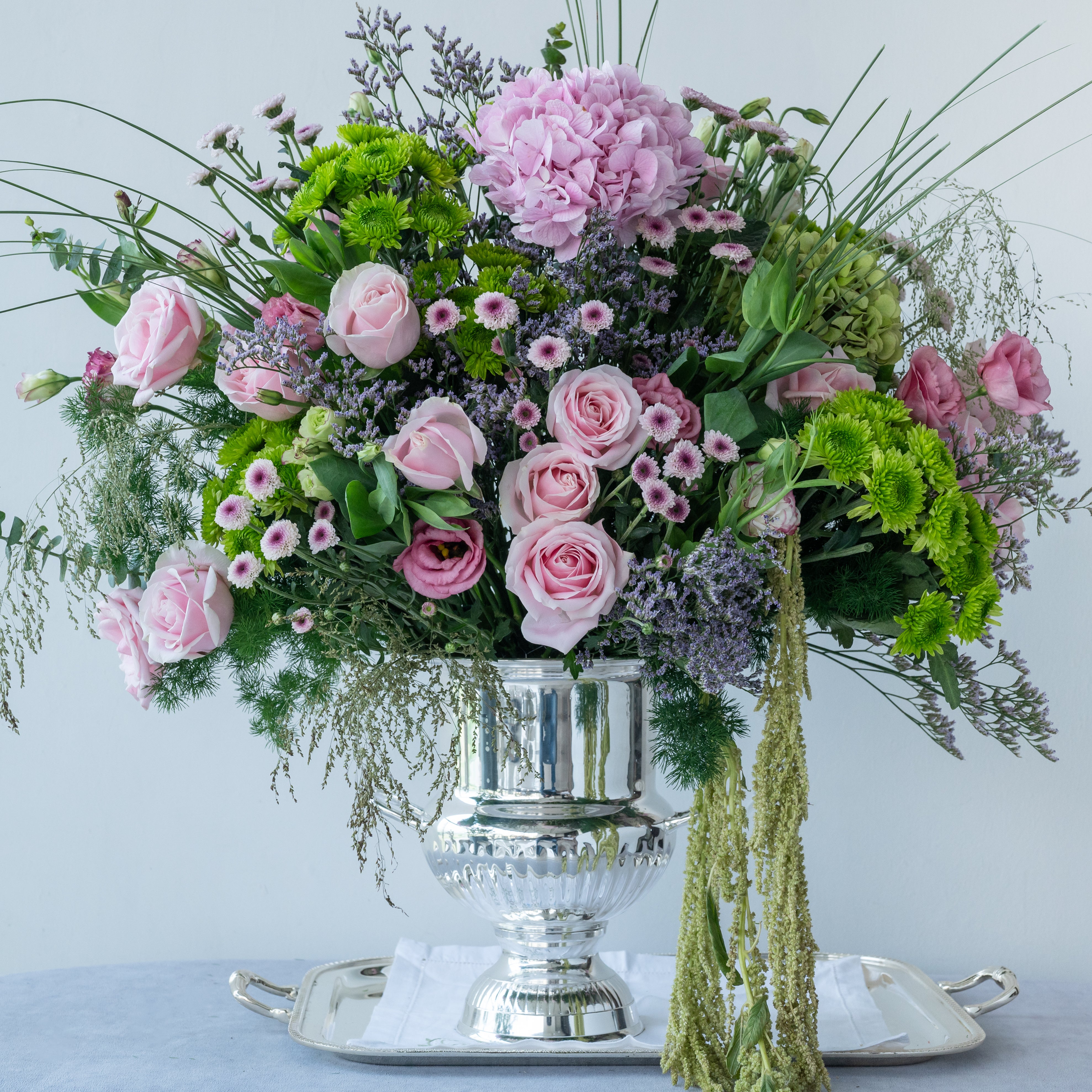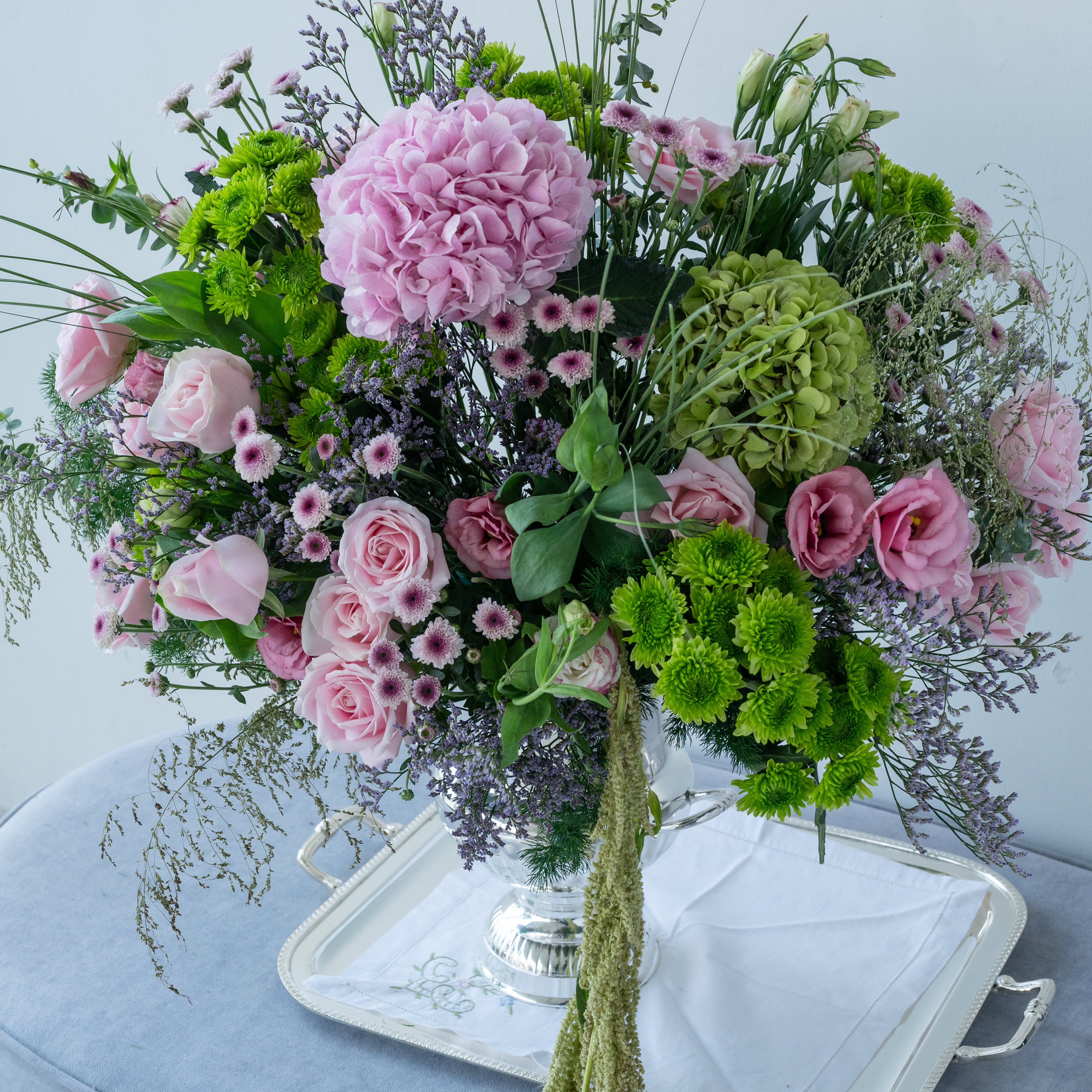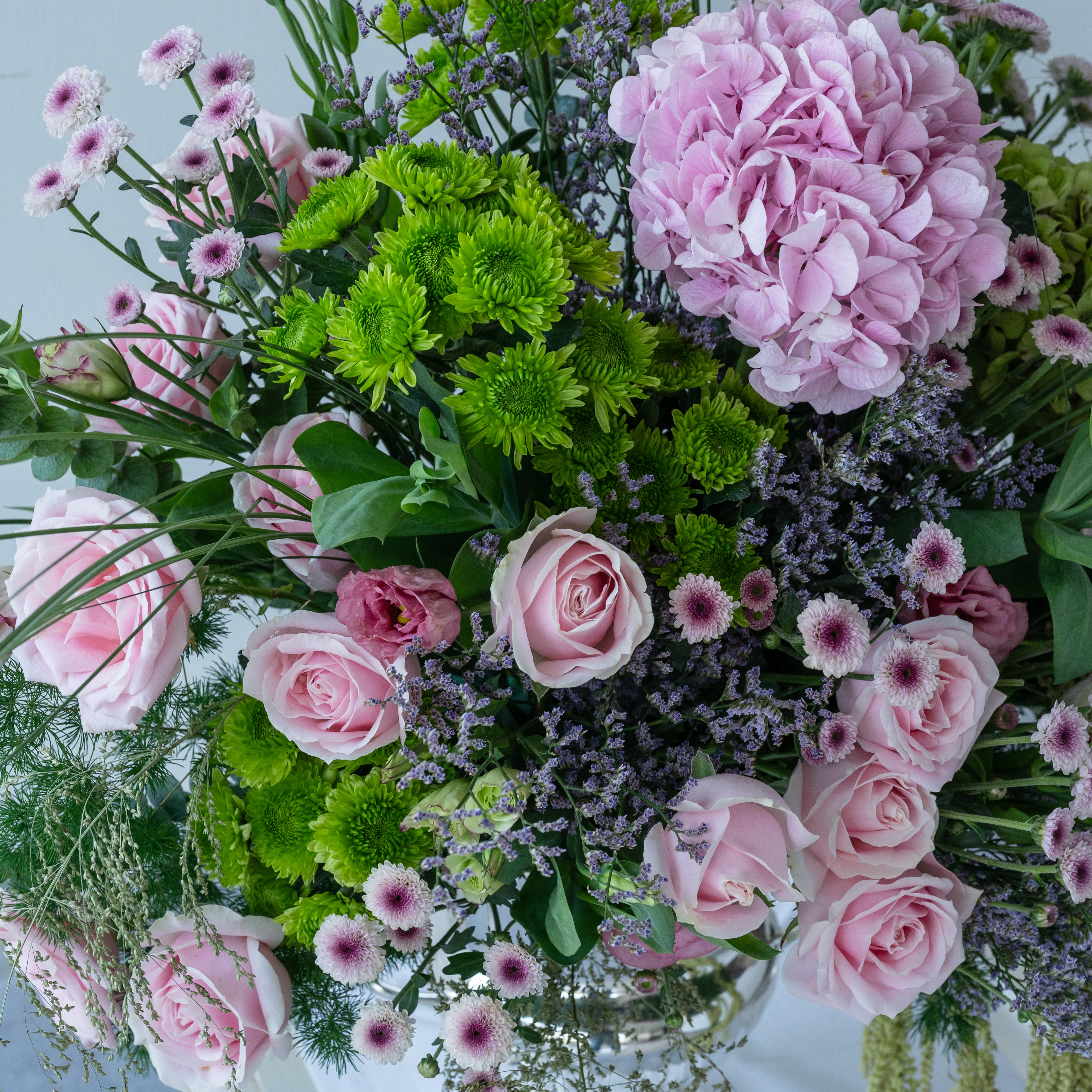 Flowers: Pink Hydrangea, Green Hydrangea, Green Daisies, Pink Daisy Button, Pink Eustomas, Sweet Pink Roses, Limonium, Eucalyptus & Green Amaranthus