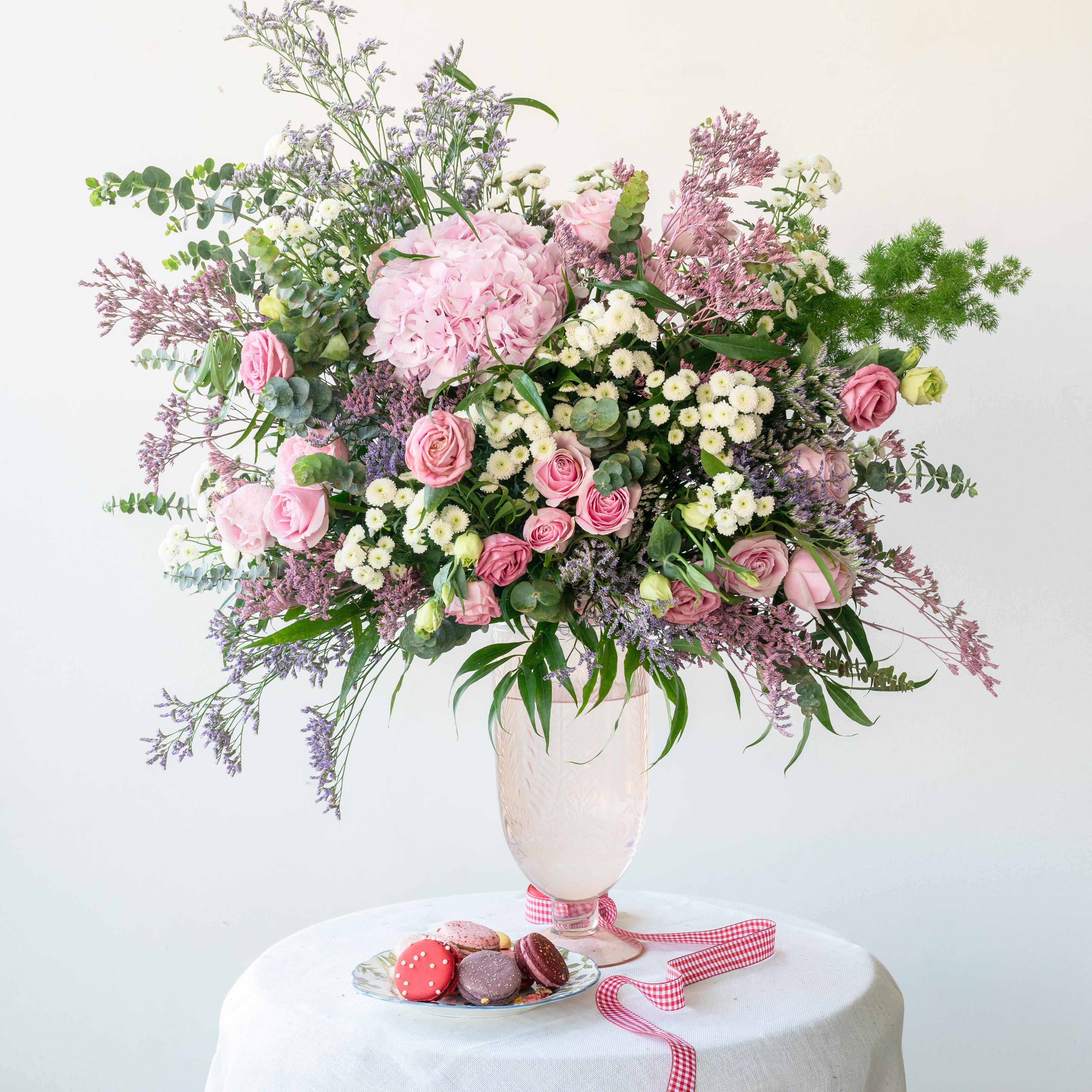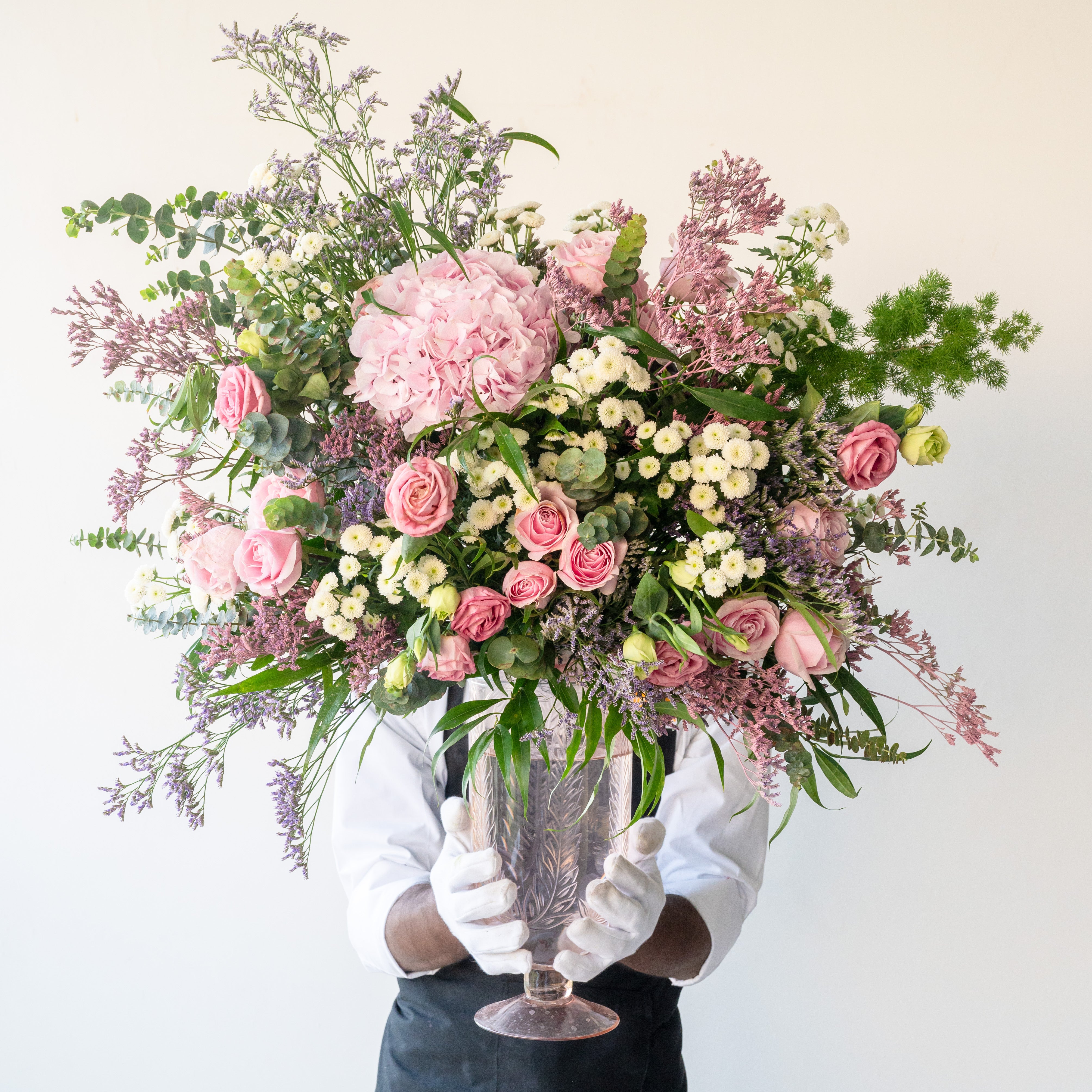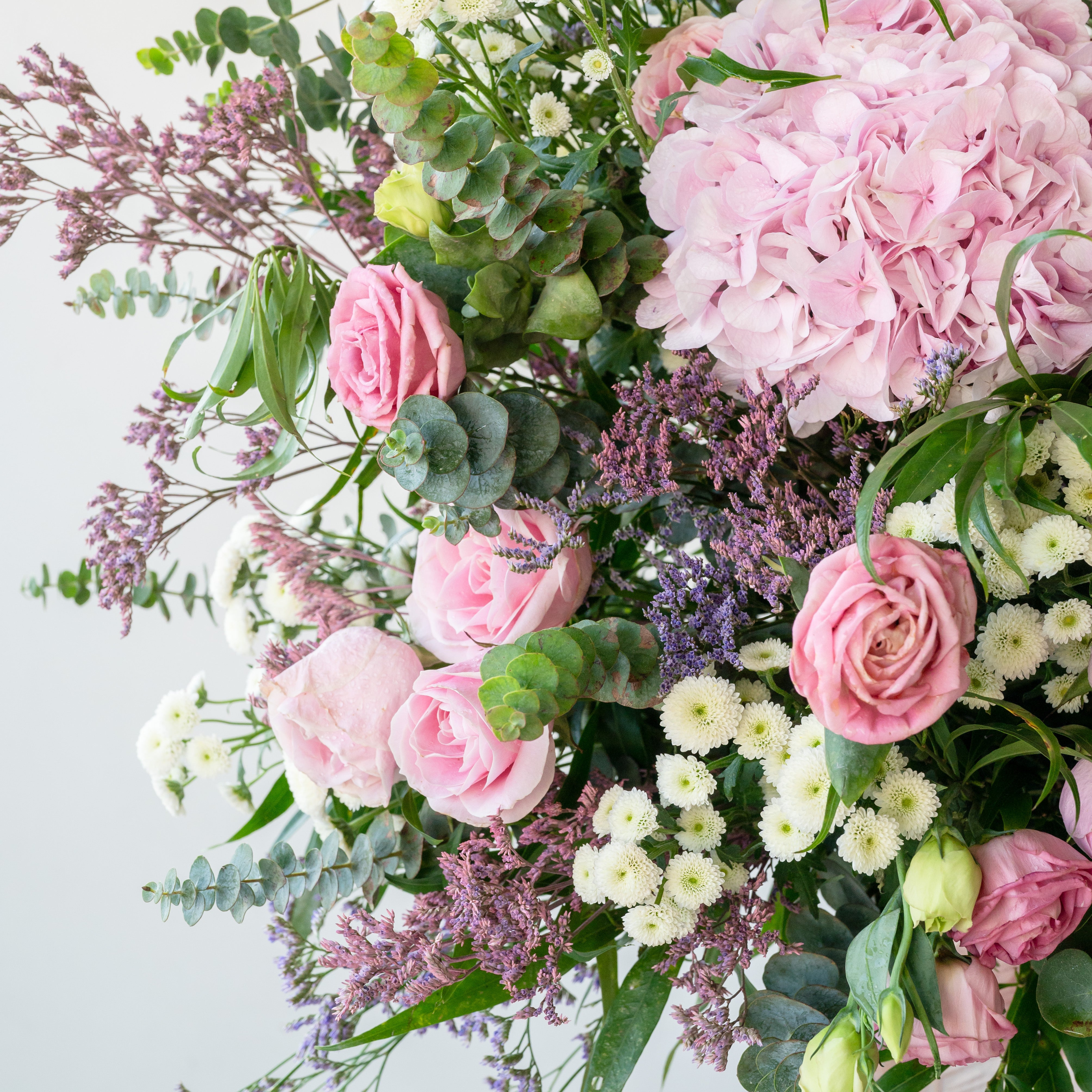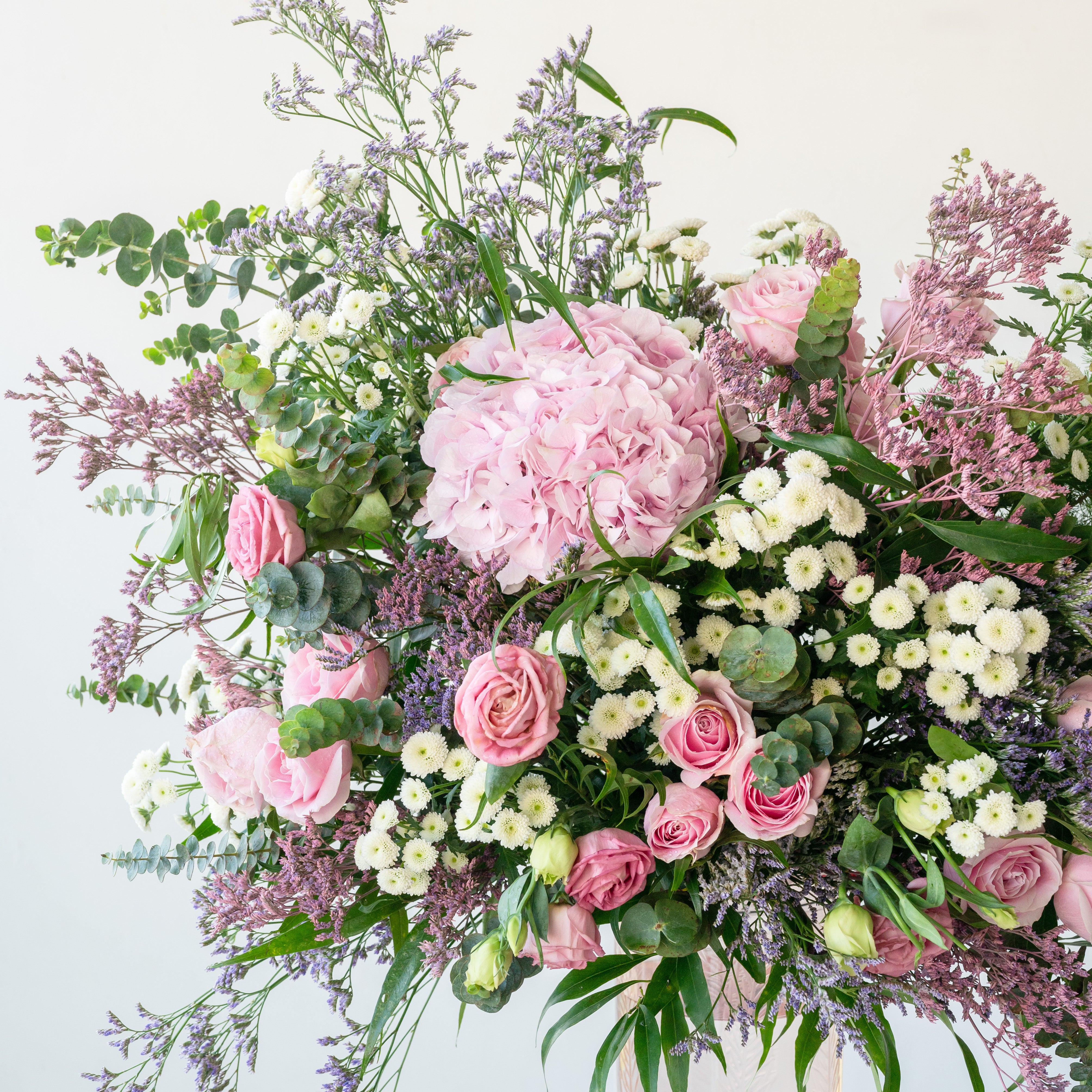 Flowers: Pink Hydrangea, Pink Roses, White Button Daisy, Eucalyptus, Limonium, Pink Eustoma, Natural Greens