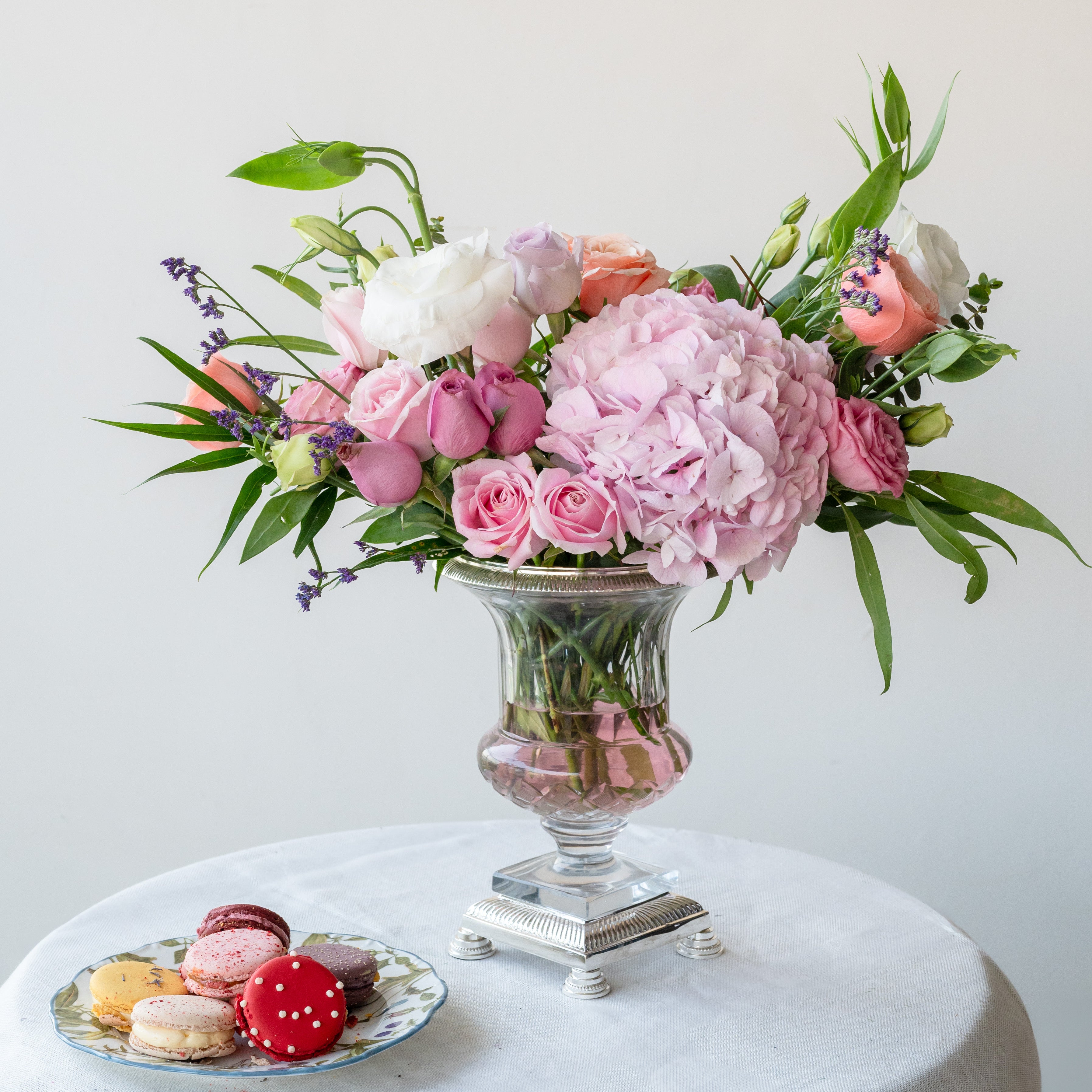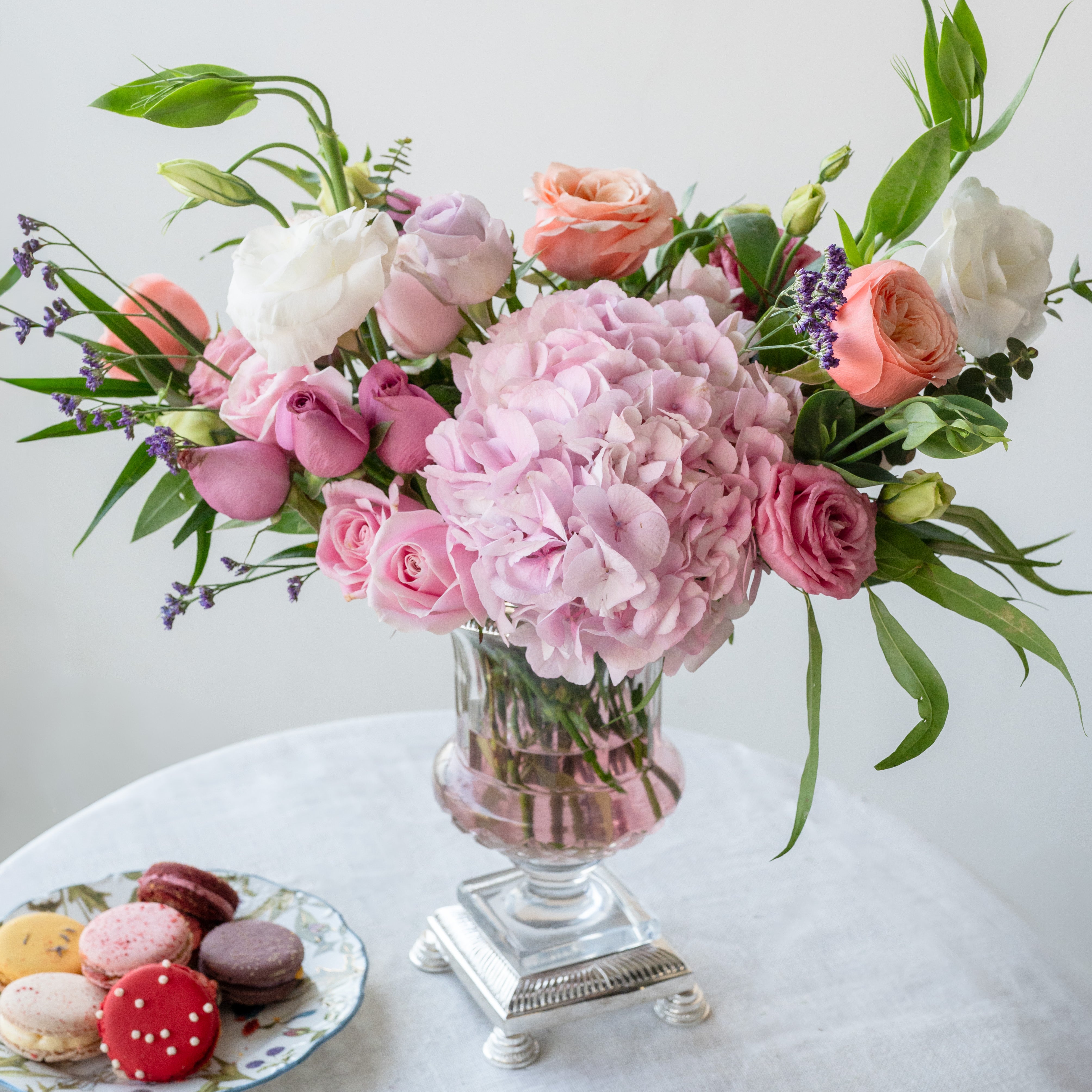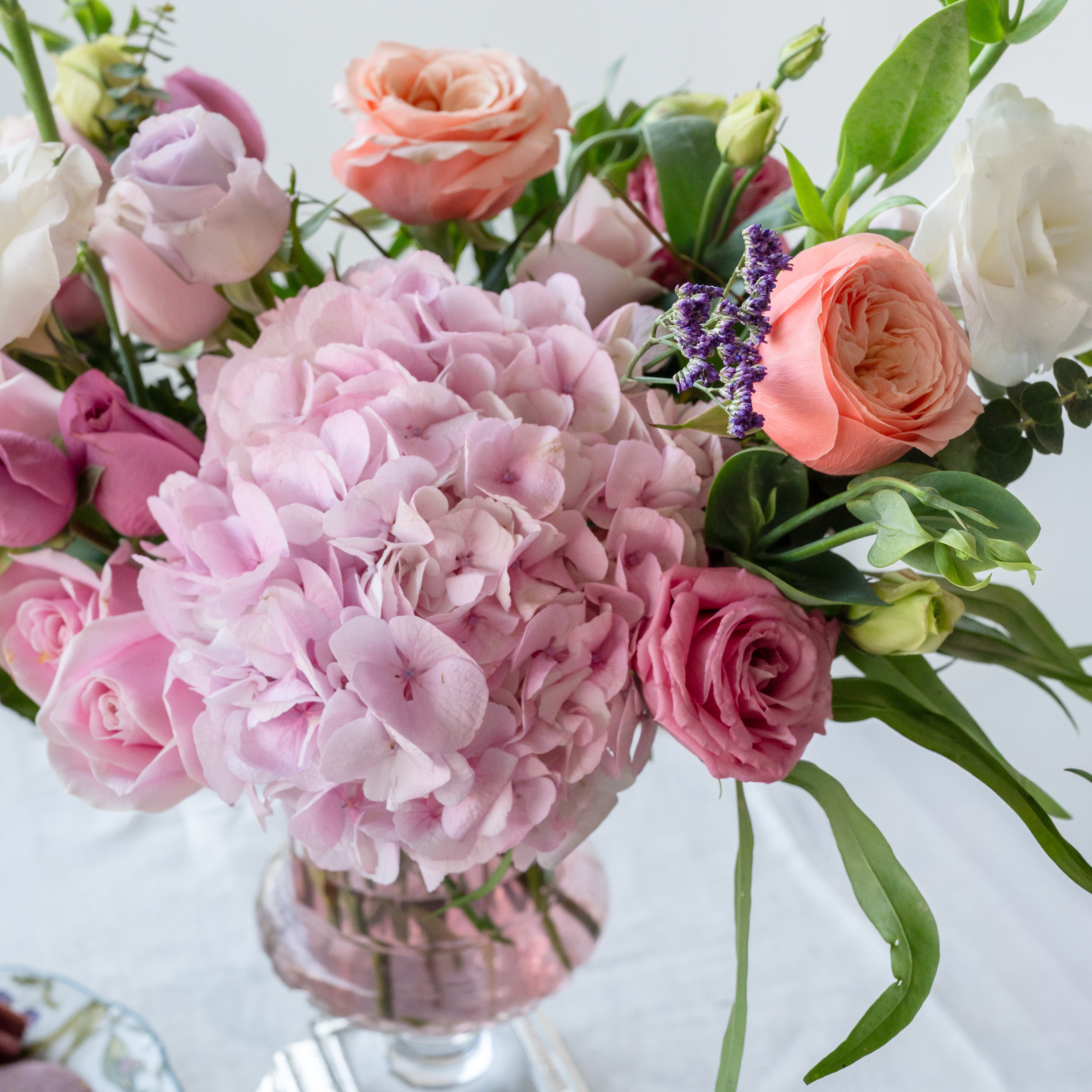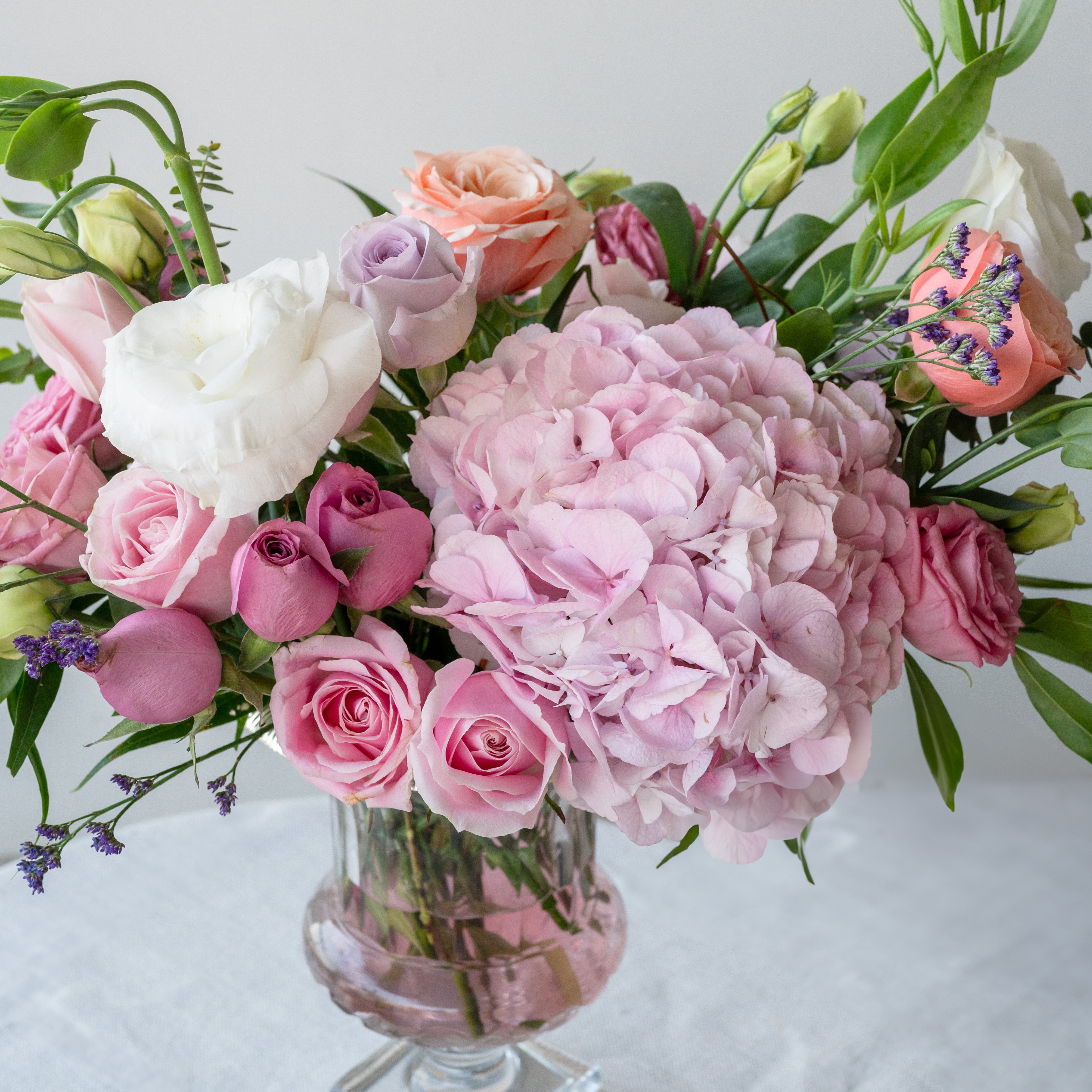 Flowers: Pink Hydrangea, White Eustoma, Sweet Pink Roses, Pink Eustoma, Dark Purple Roses, Lavender Roses, Cabbage Roses, Limonium, Eucalyptus & Natural Greens