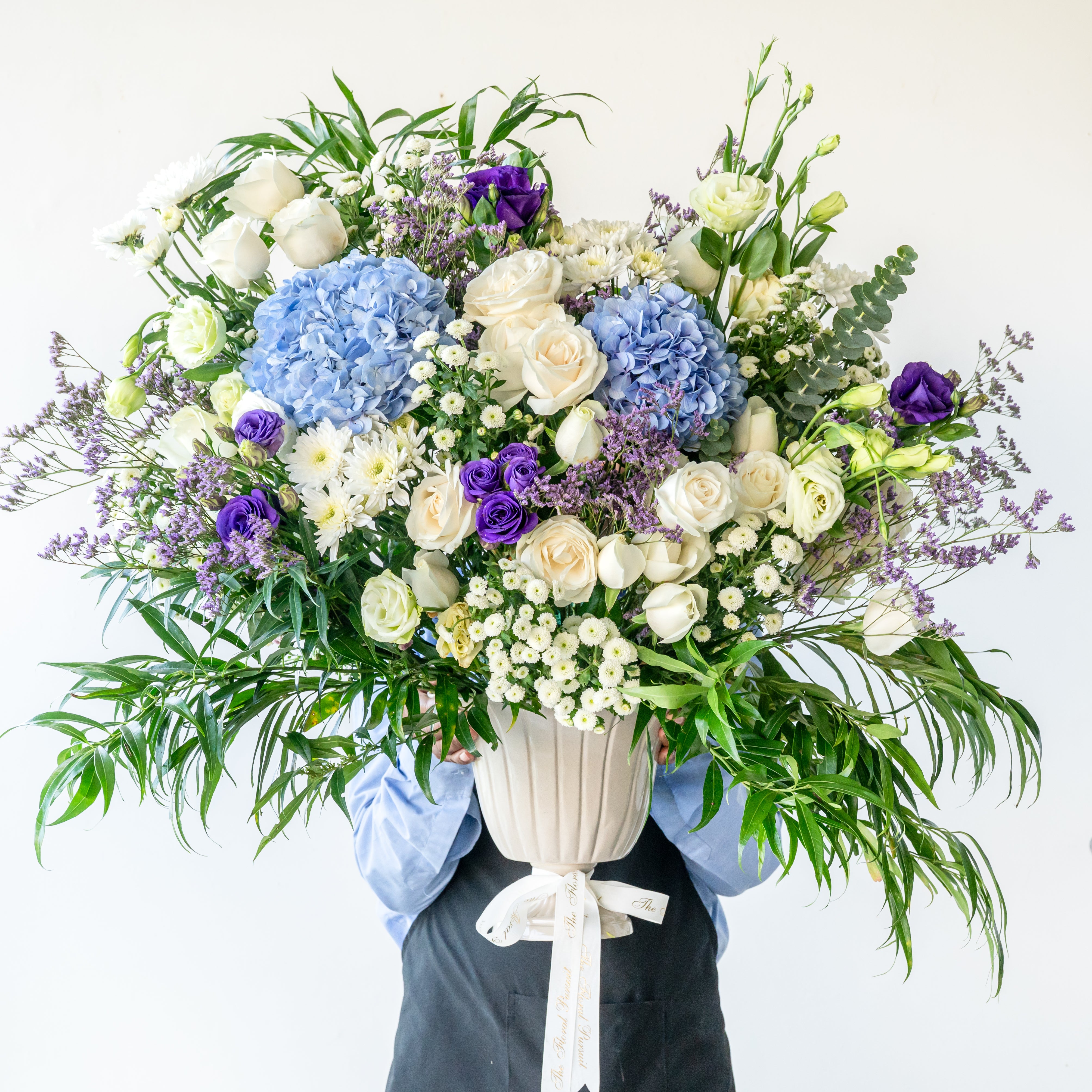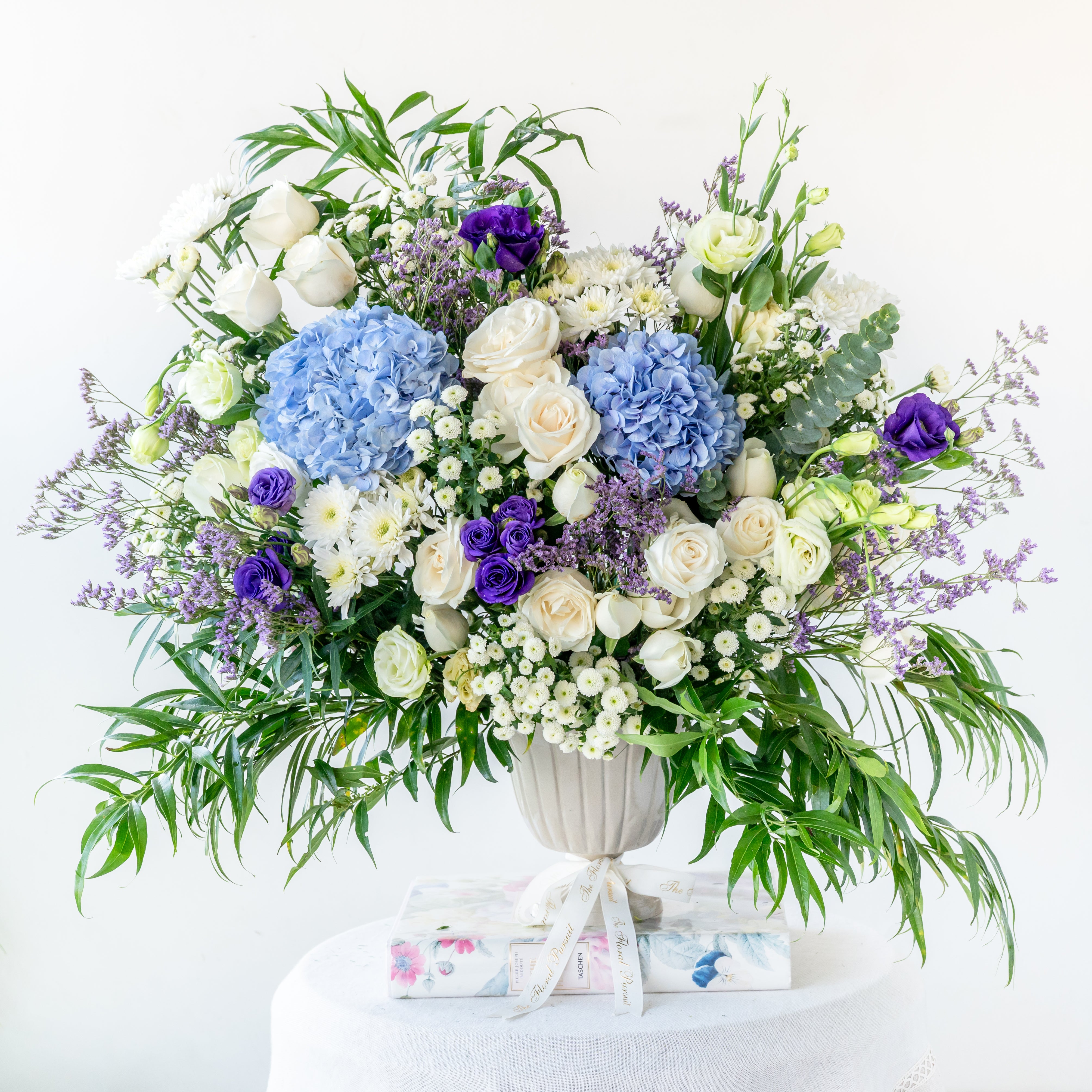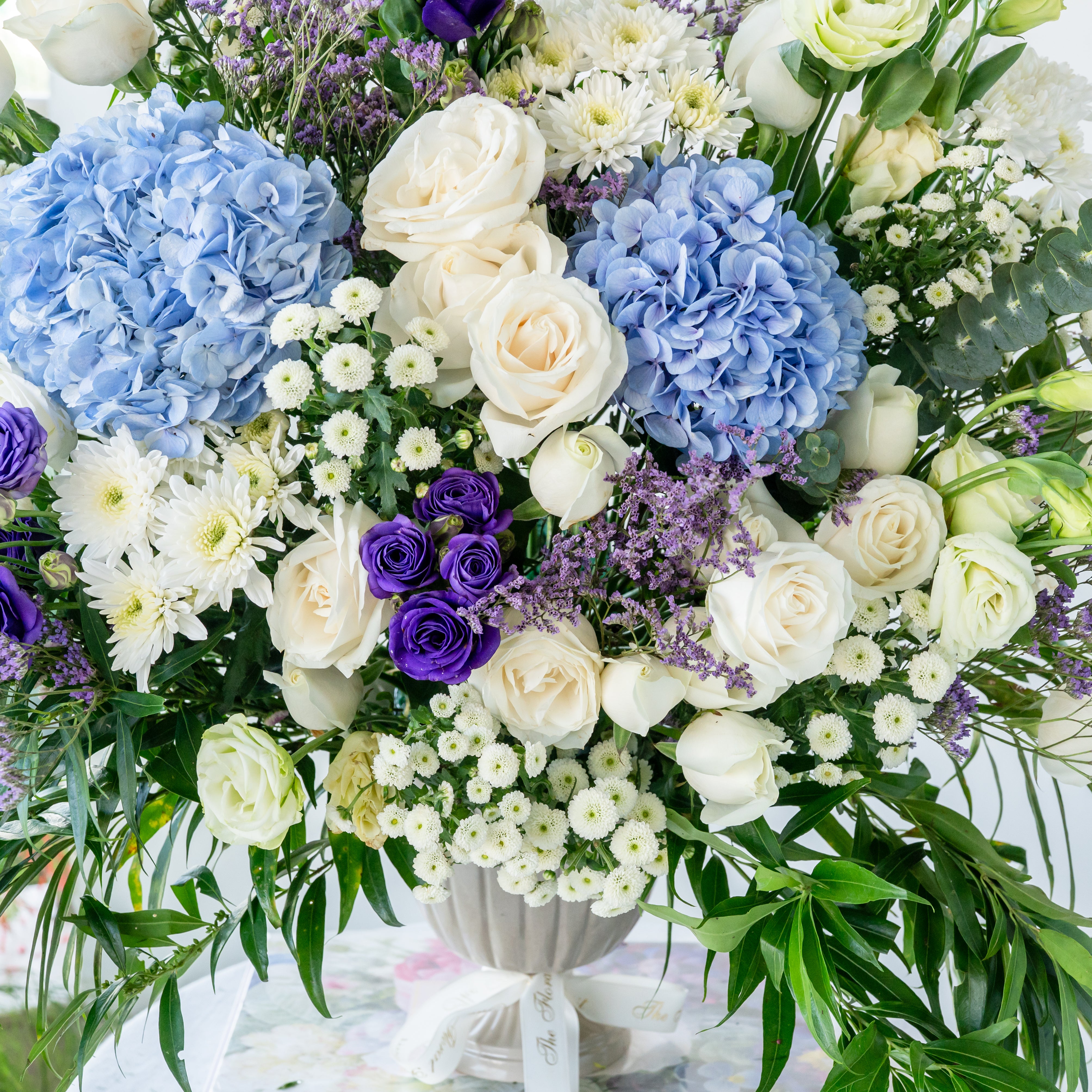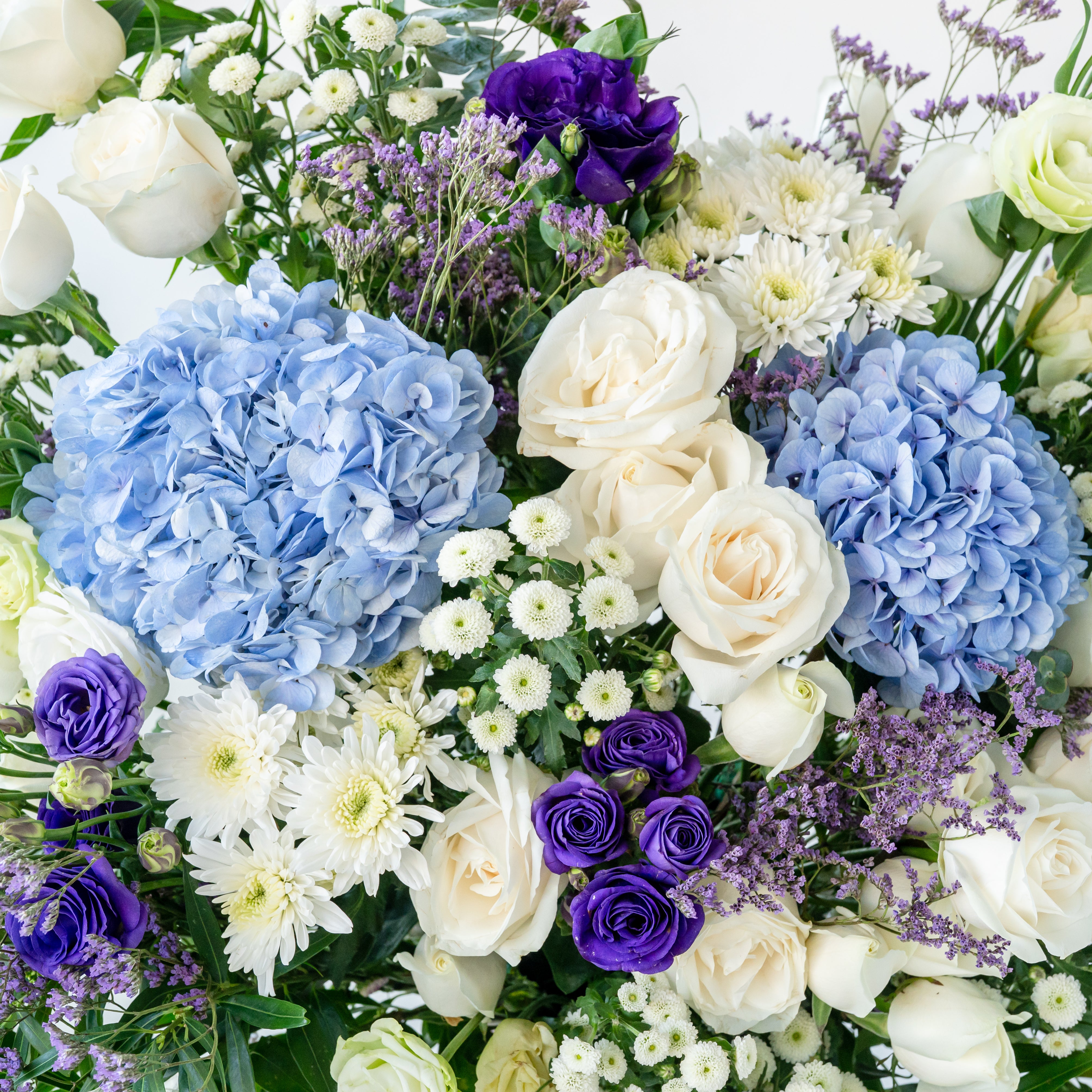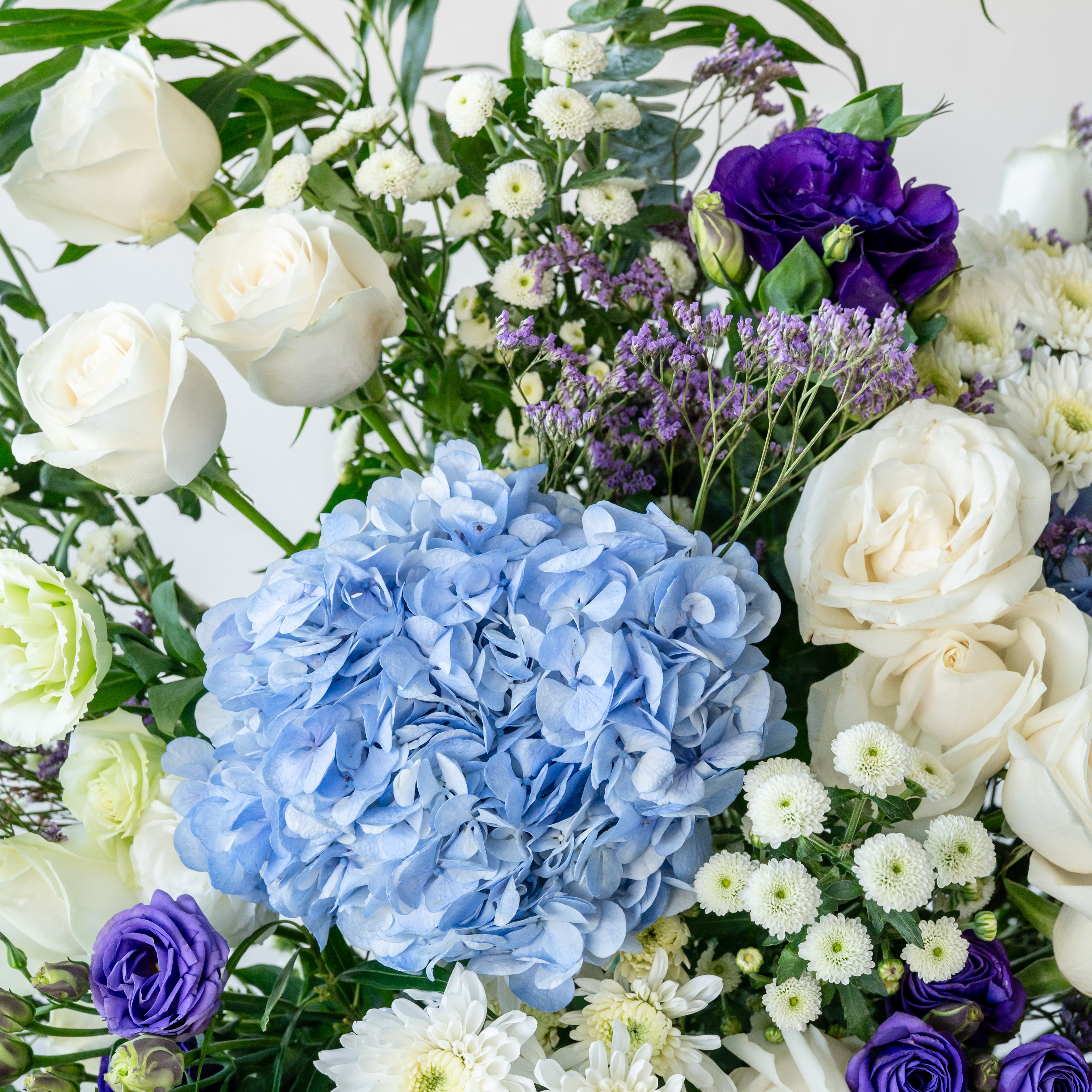 Flowers: Hydrangea, roses , Eustomas , limonium and mixed leaves