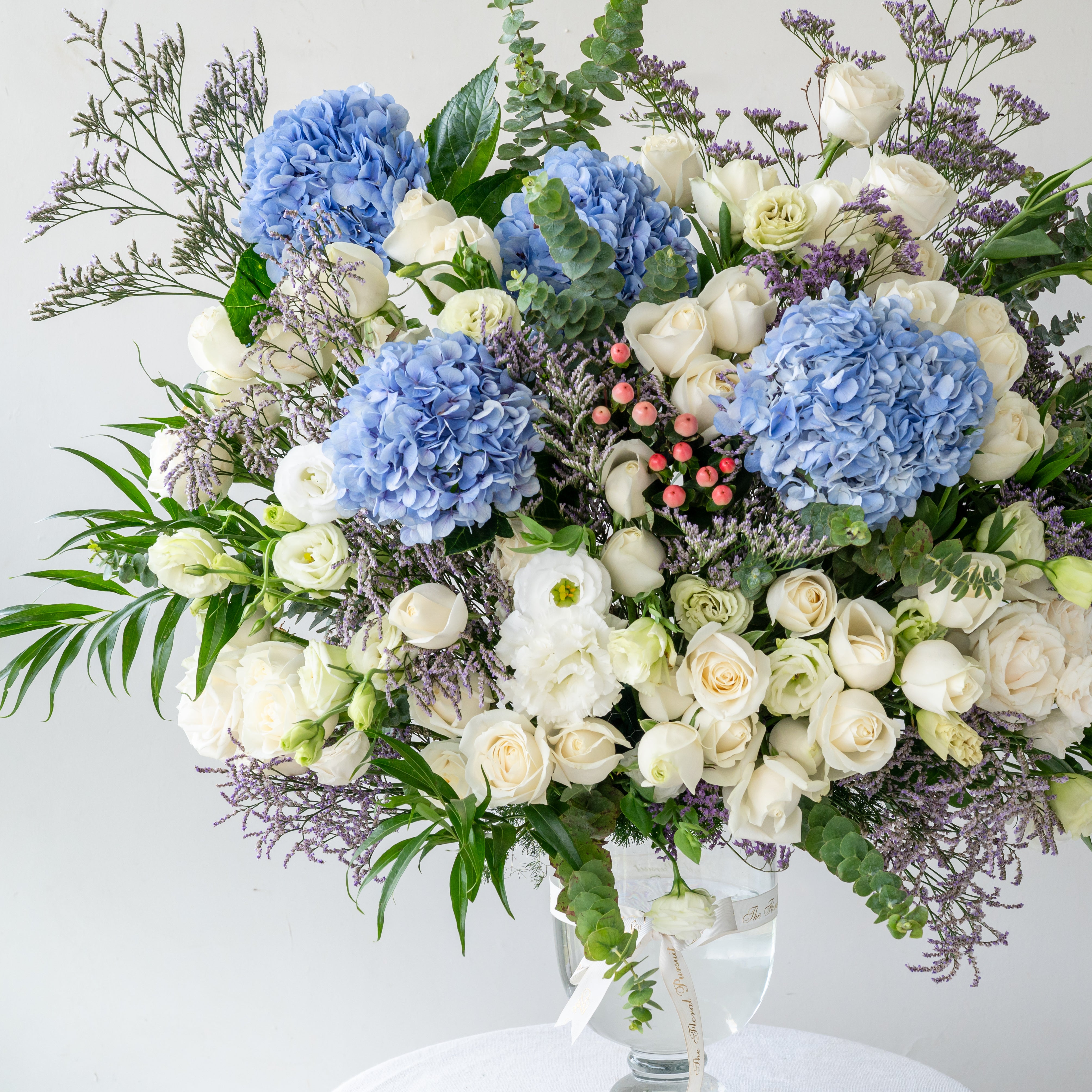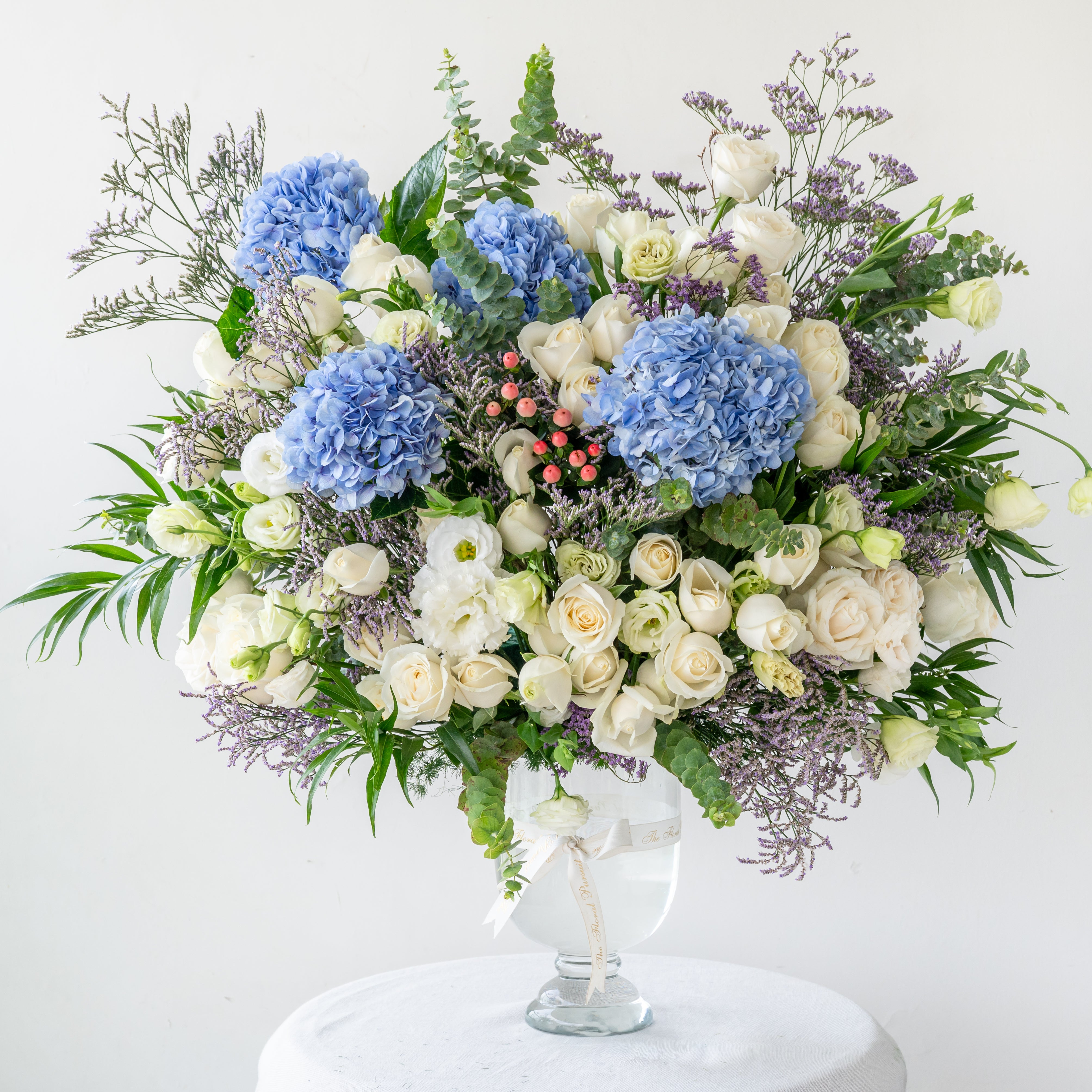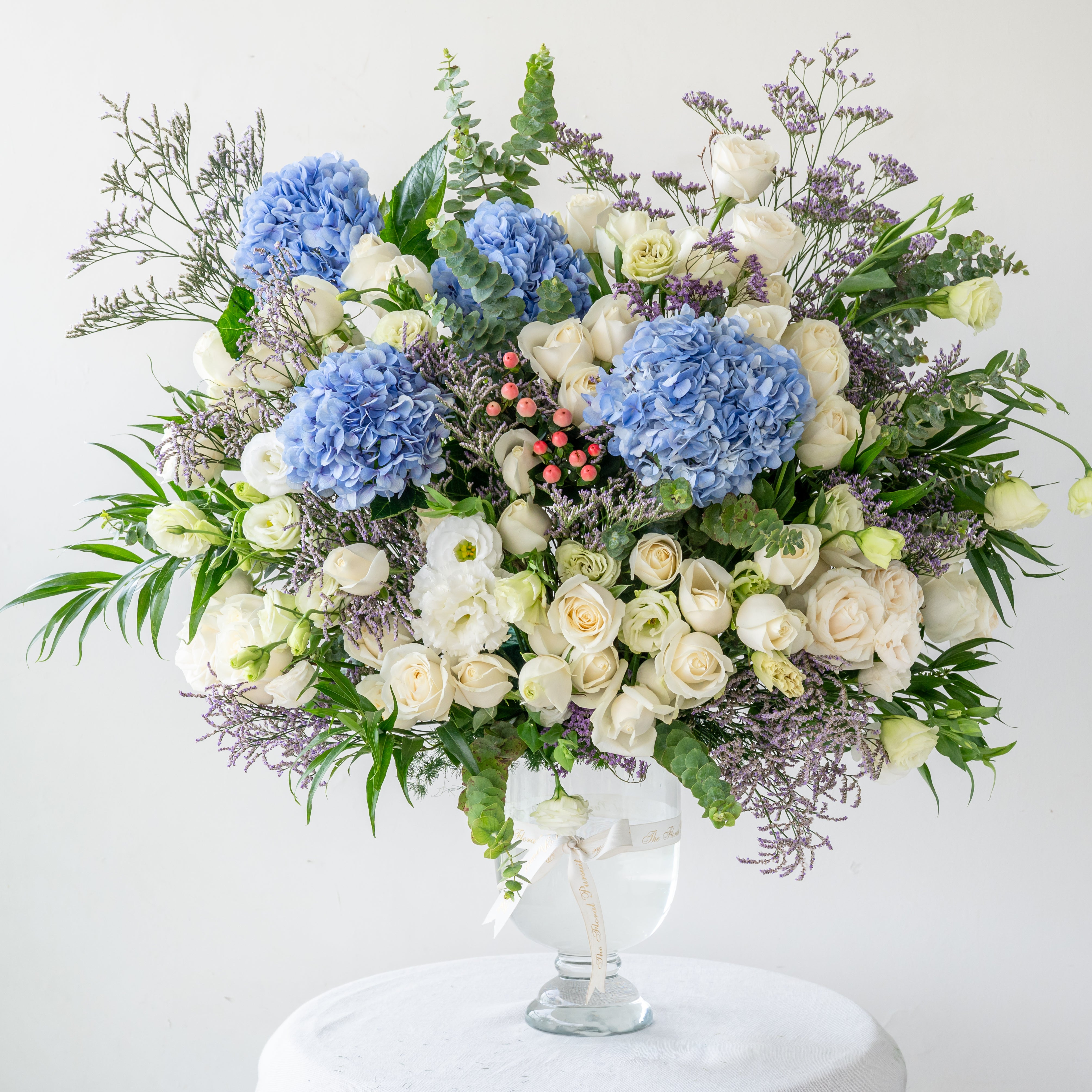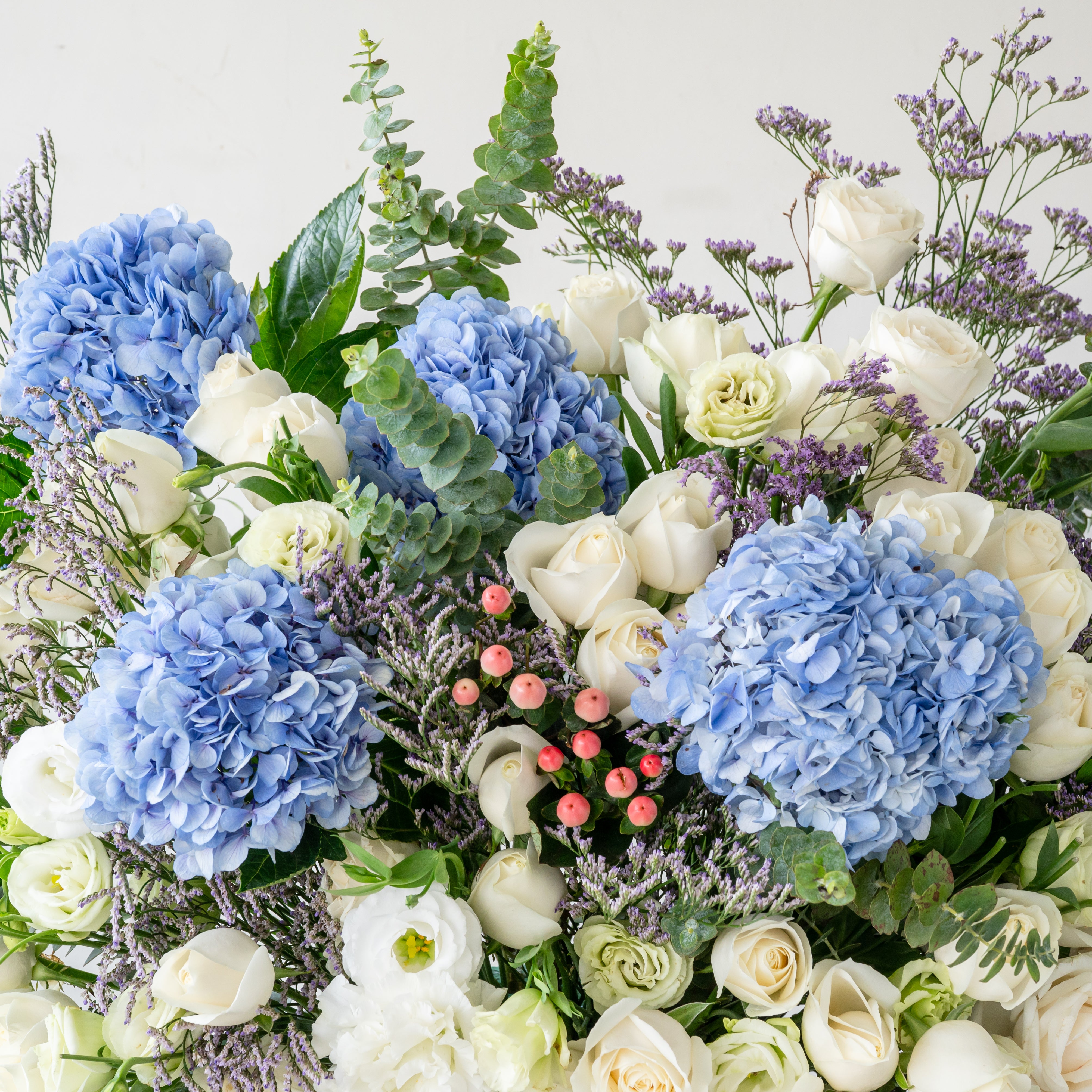 Flowers: Hydrangea, roses , Eustomas , berries , mixed leaves