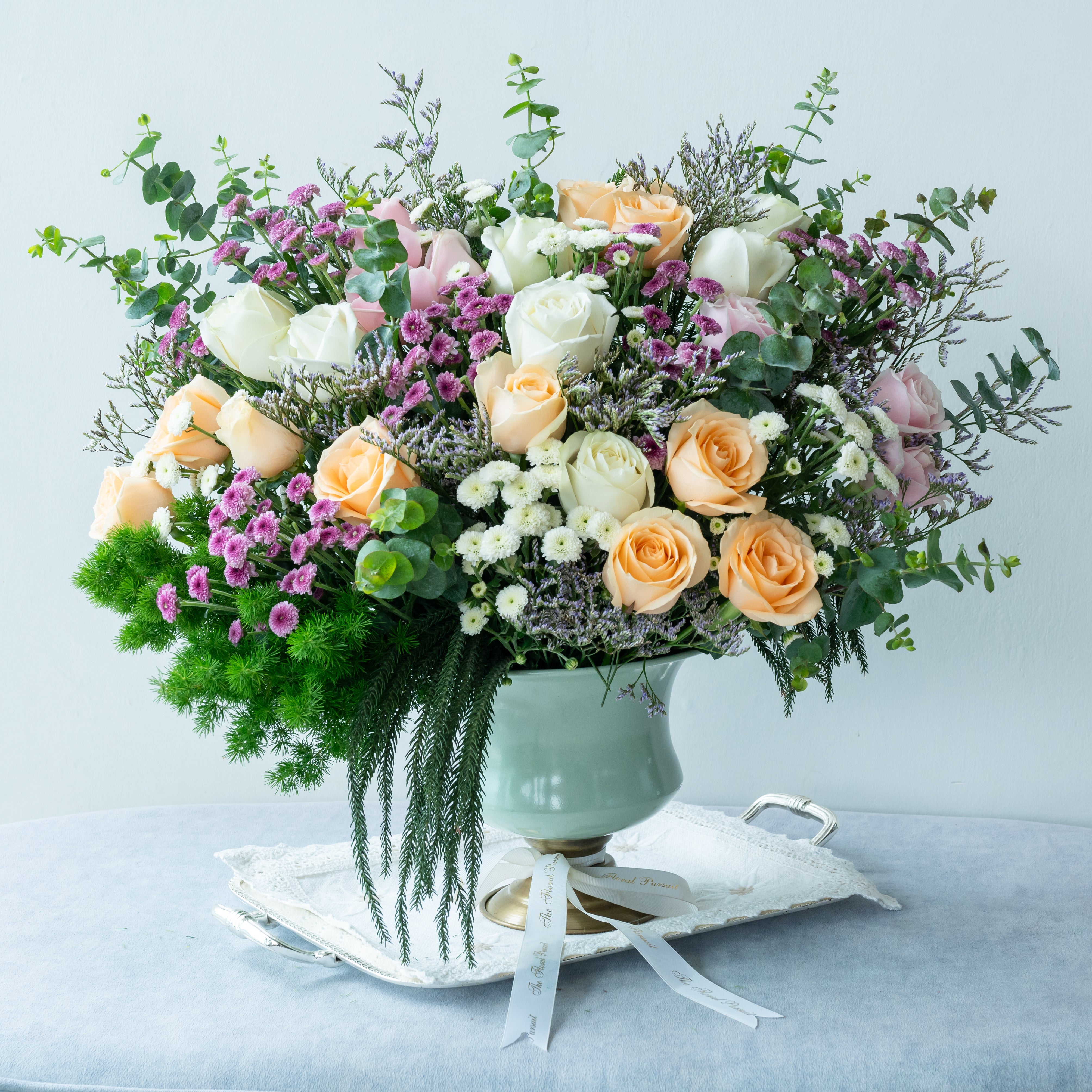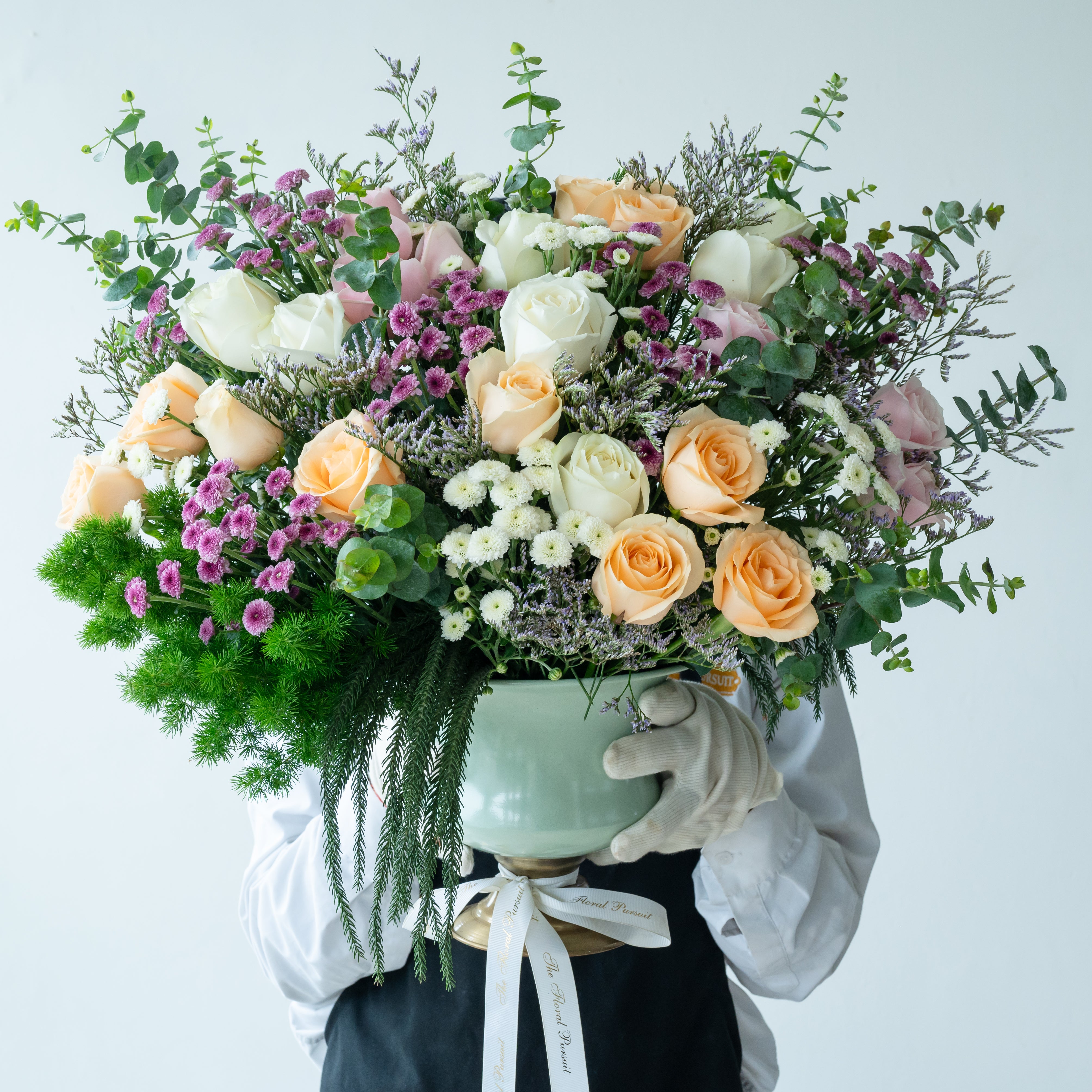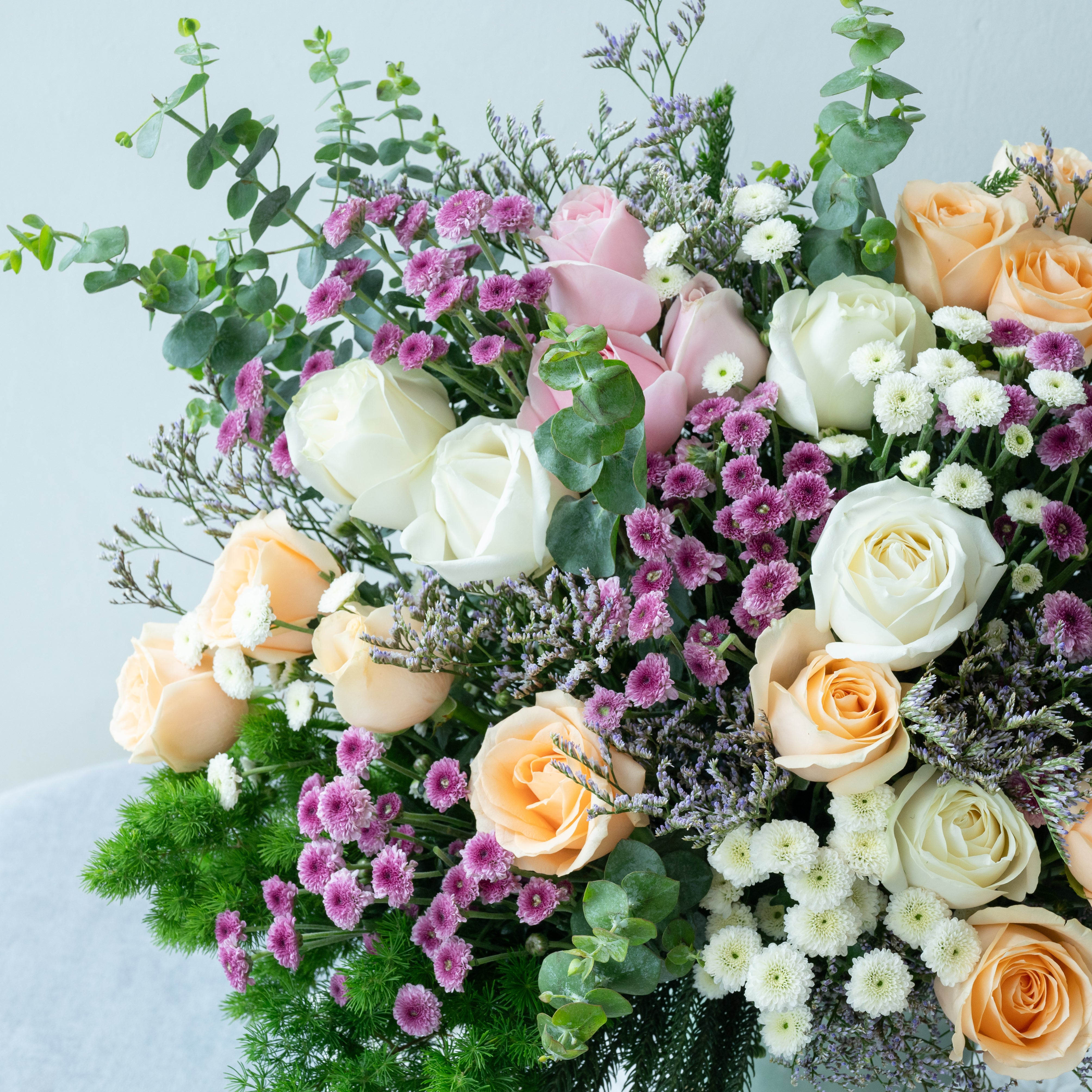 Flowers: Peach Rose, White Rose, Sweet Pink Rose, White Daisy Button , Pink Daisy Button, Ping Pong, Limonium & Eucalyptus