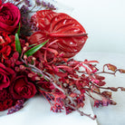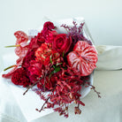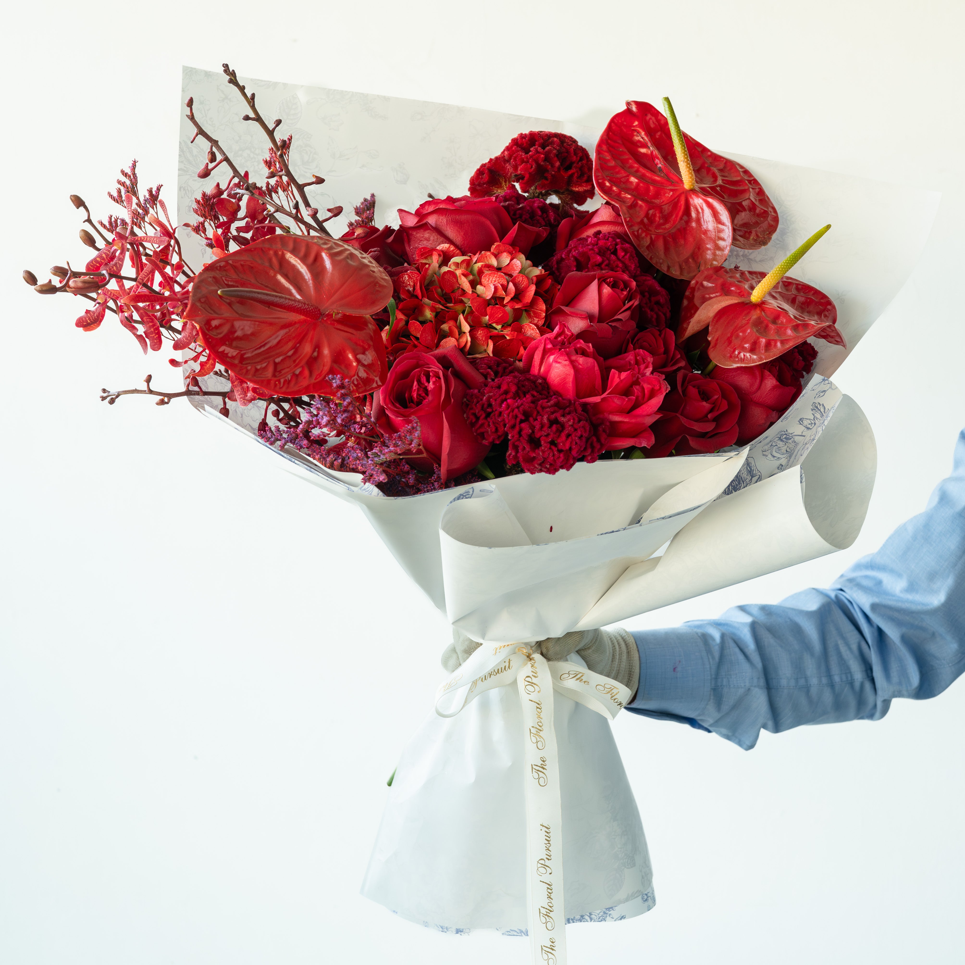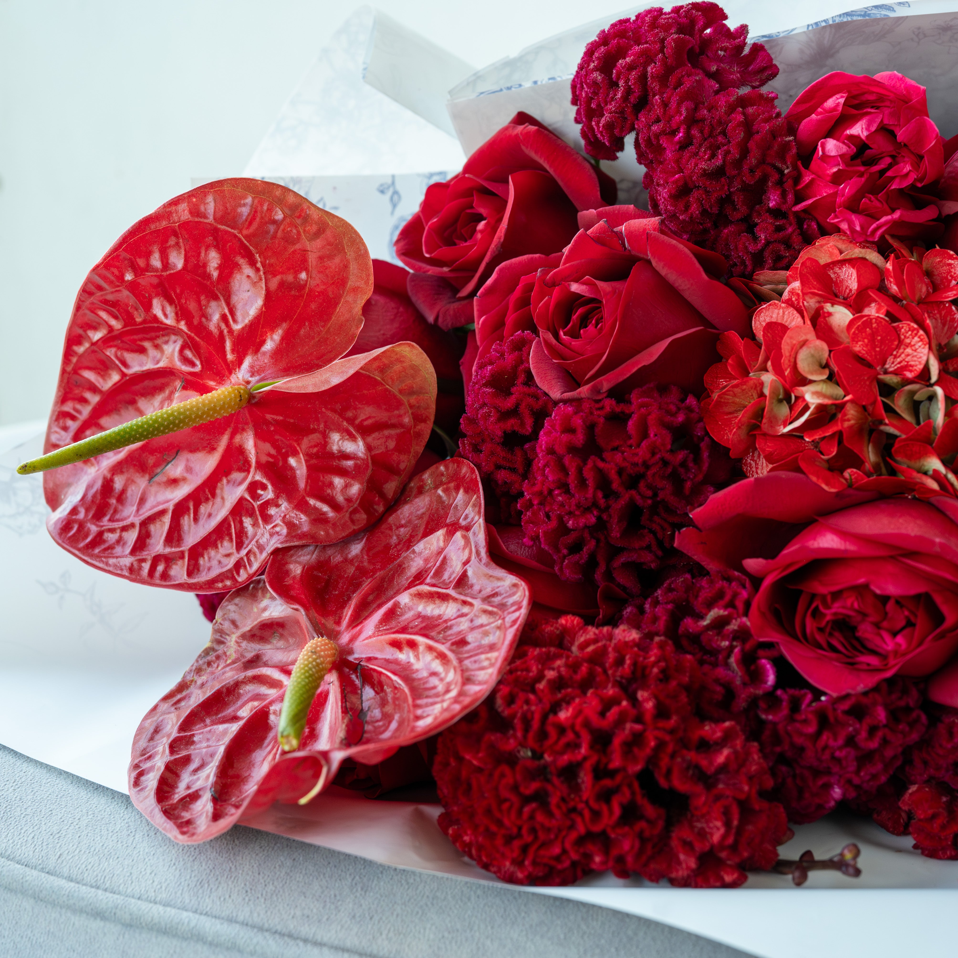 Flowers: Red Cockscomb, Red Hydrangea, Red Roses, Red Antthurium, Red Spider Orchids & Limonium