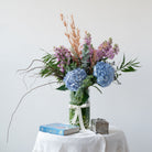 Flowers: Blue Hydrangea, Pink Stock, Mixed Leaves & Twigs.
