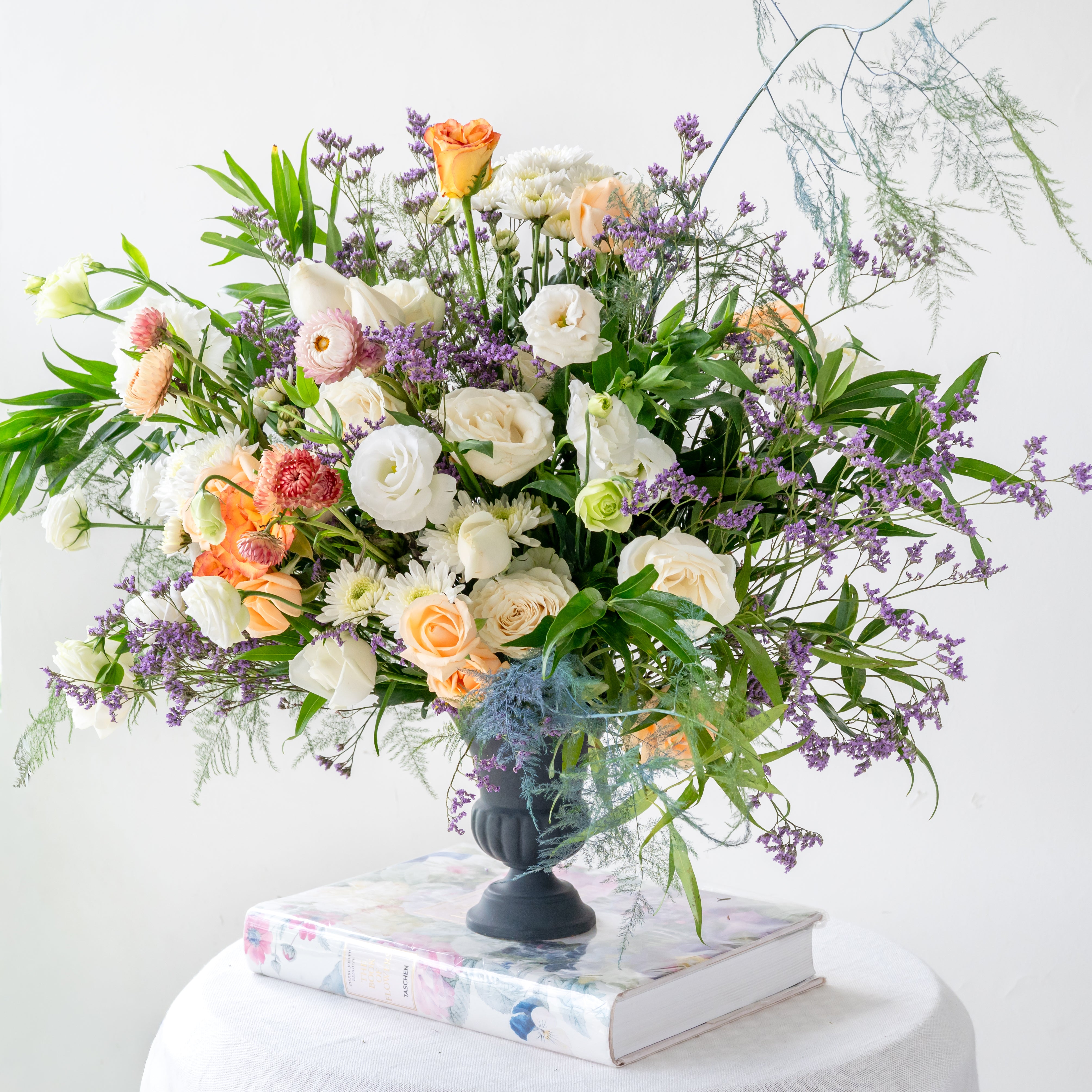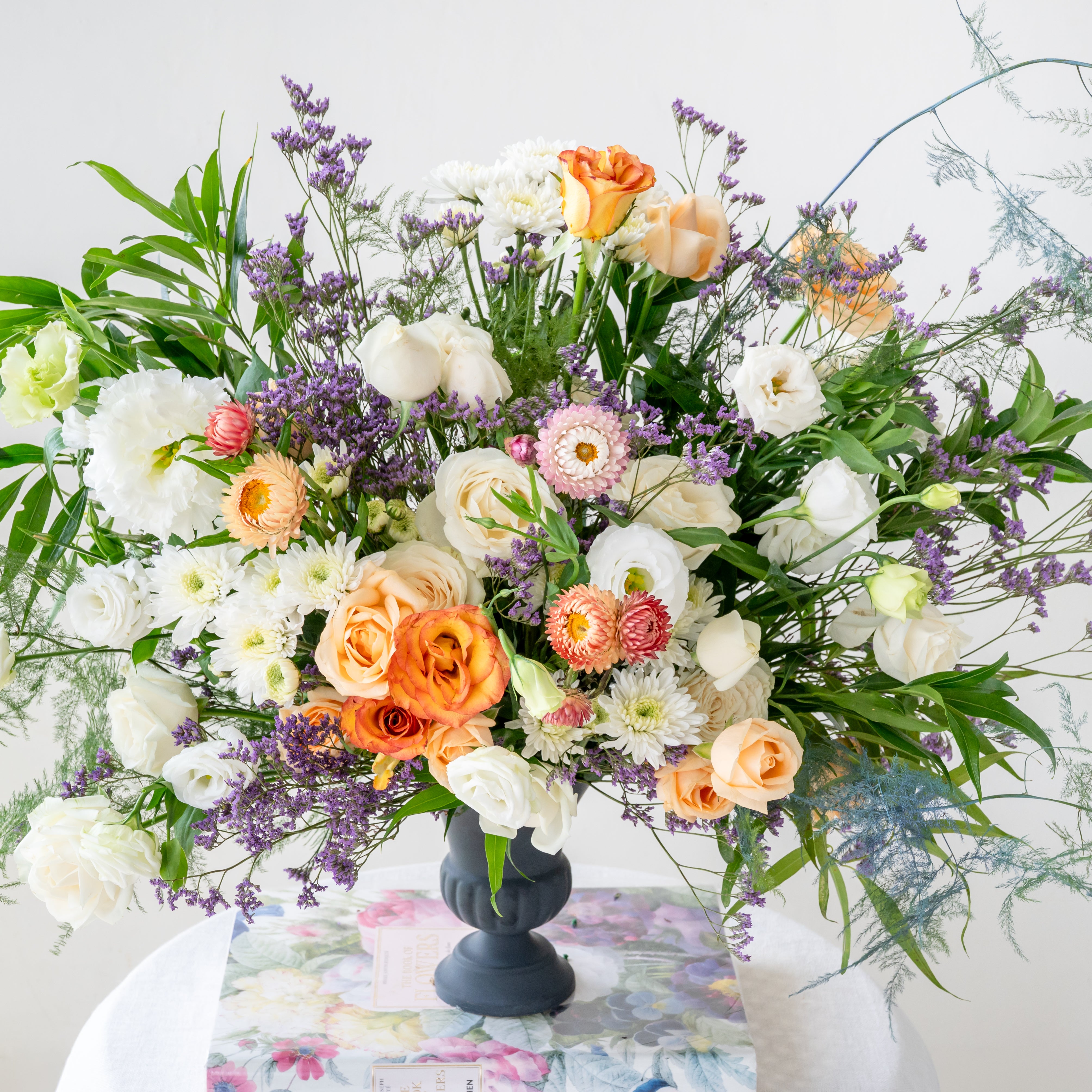 Flowers: Roses, Eustoma, paper flowers, Button Daisies, Mixed leaves & Limonium.