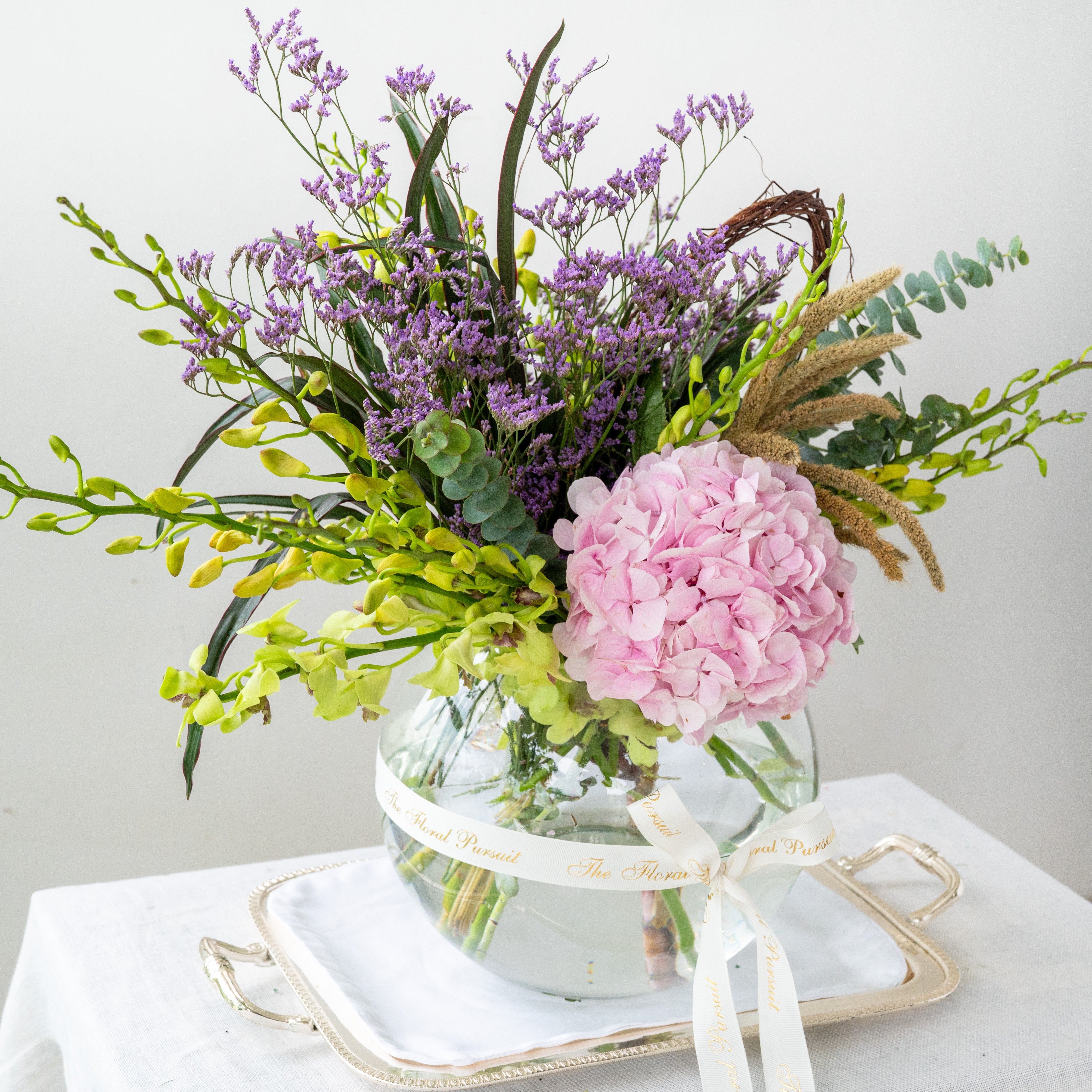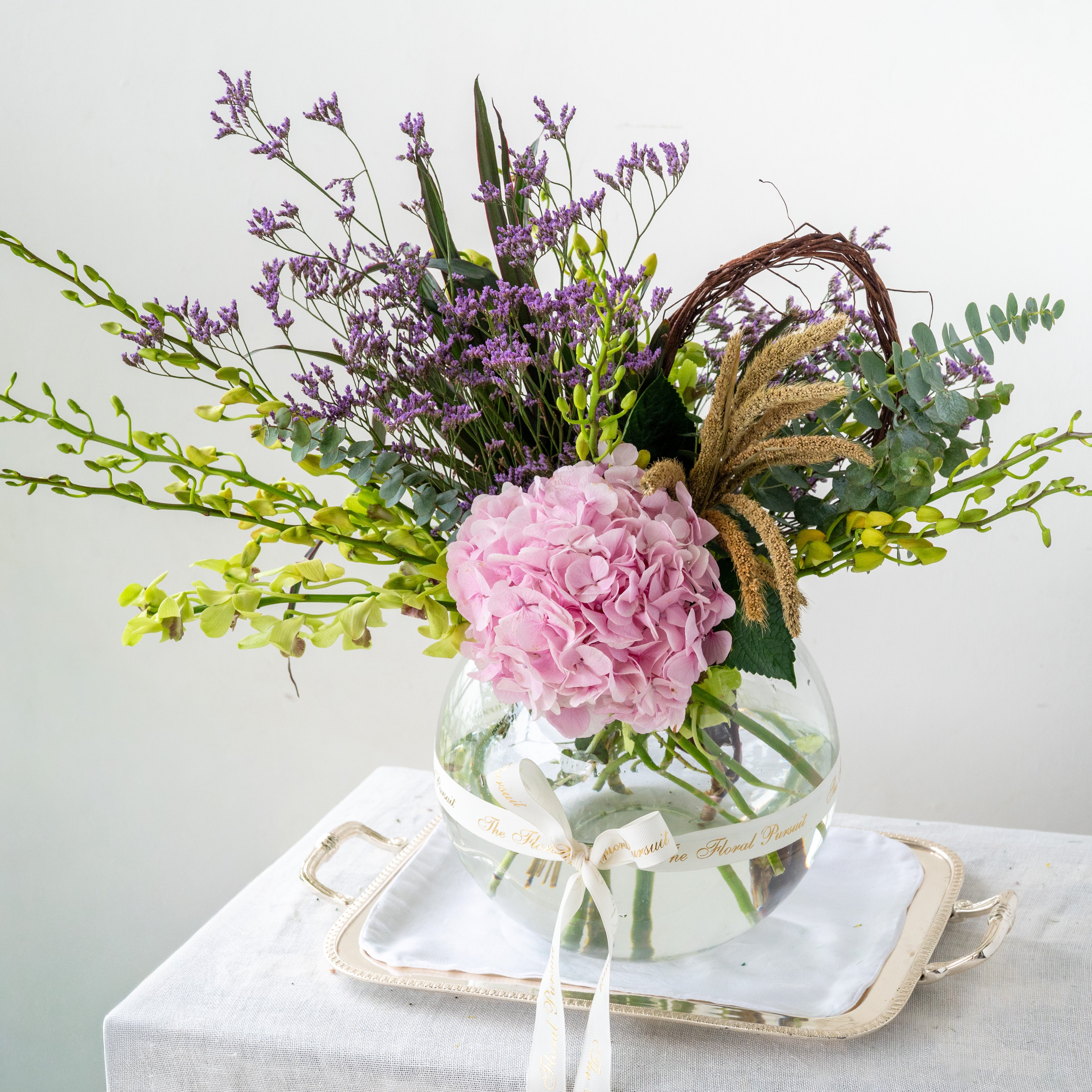 Flowers: Hydrangea, Green Mukara Orchid, Limonium, Eucalytpus, Twigs, Dry Flowers