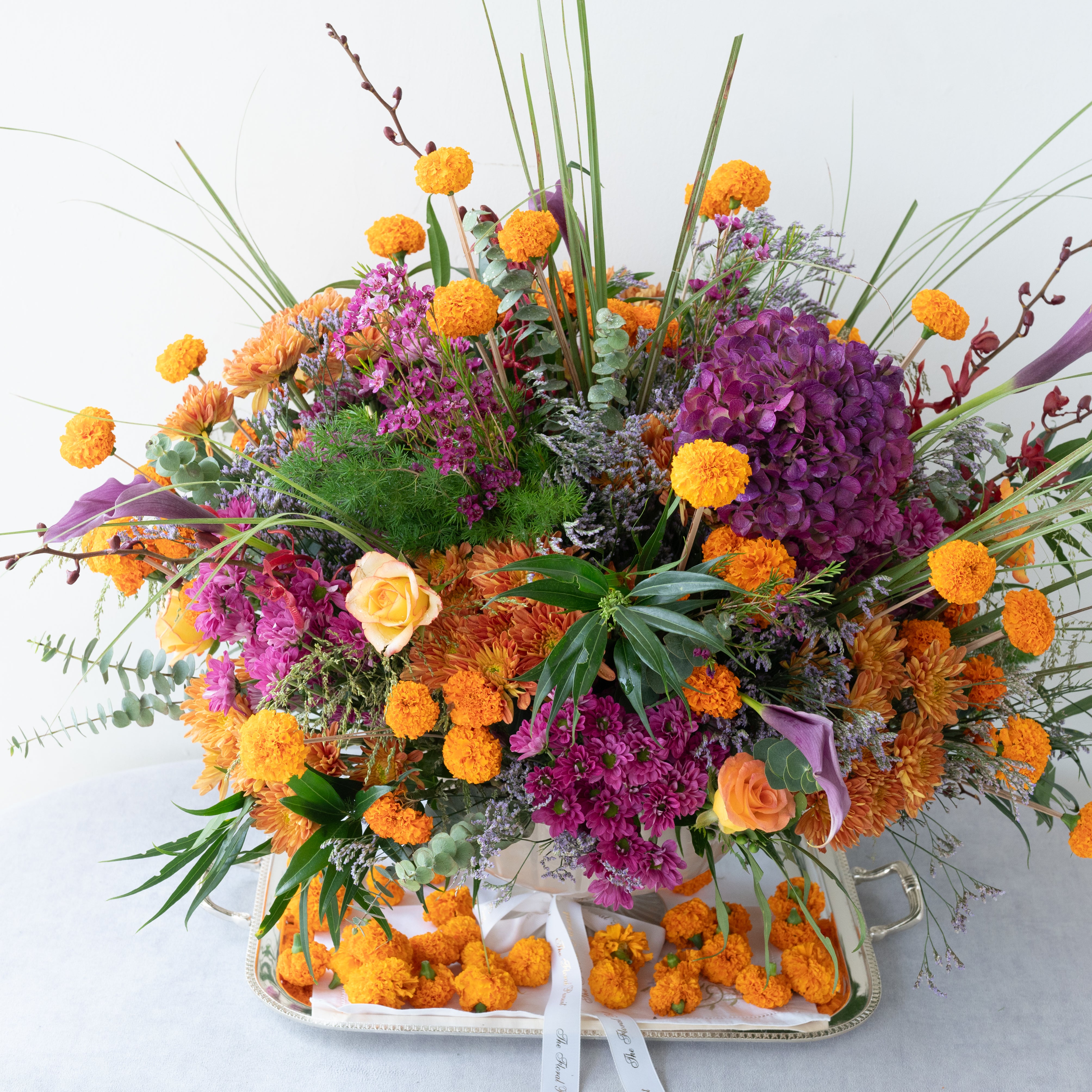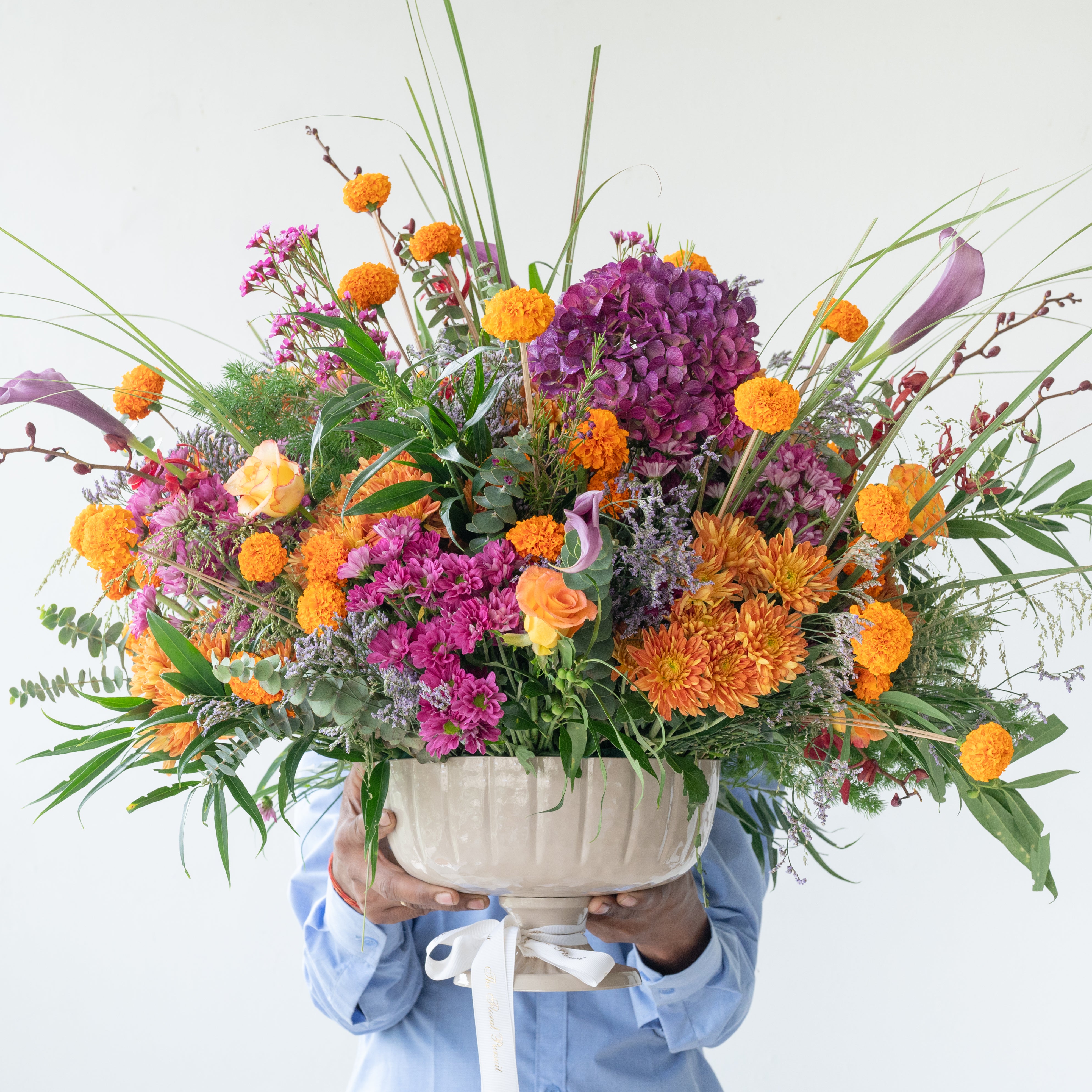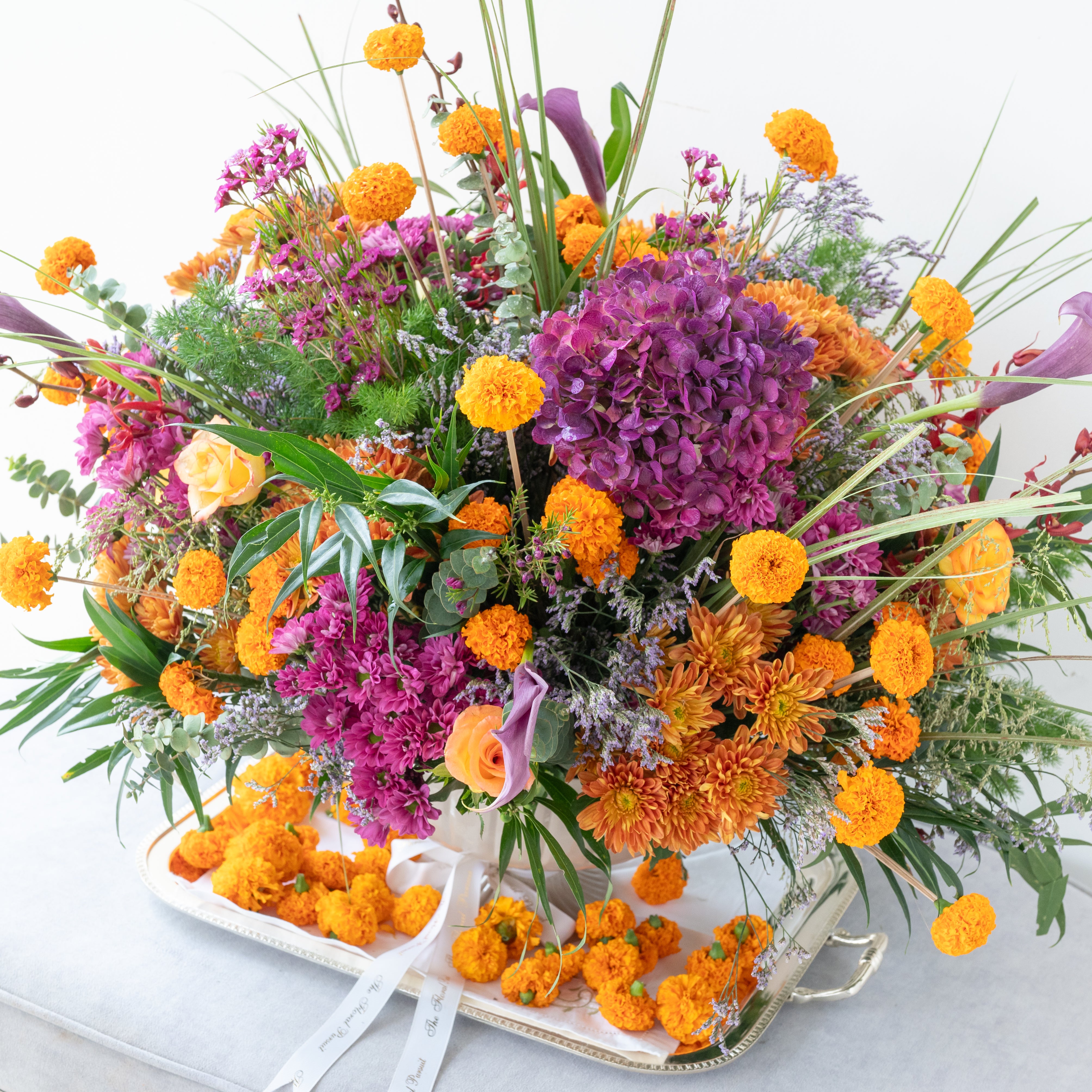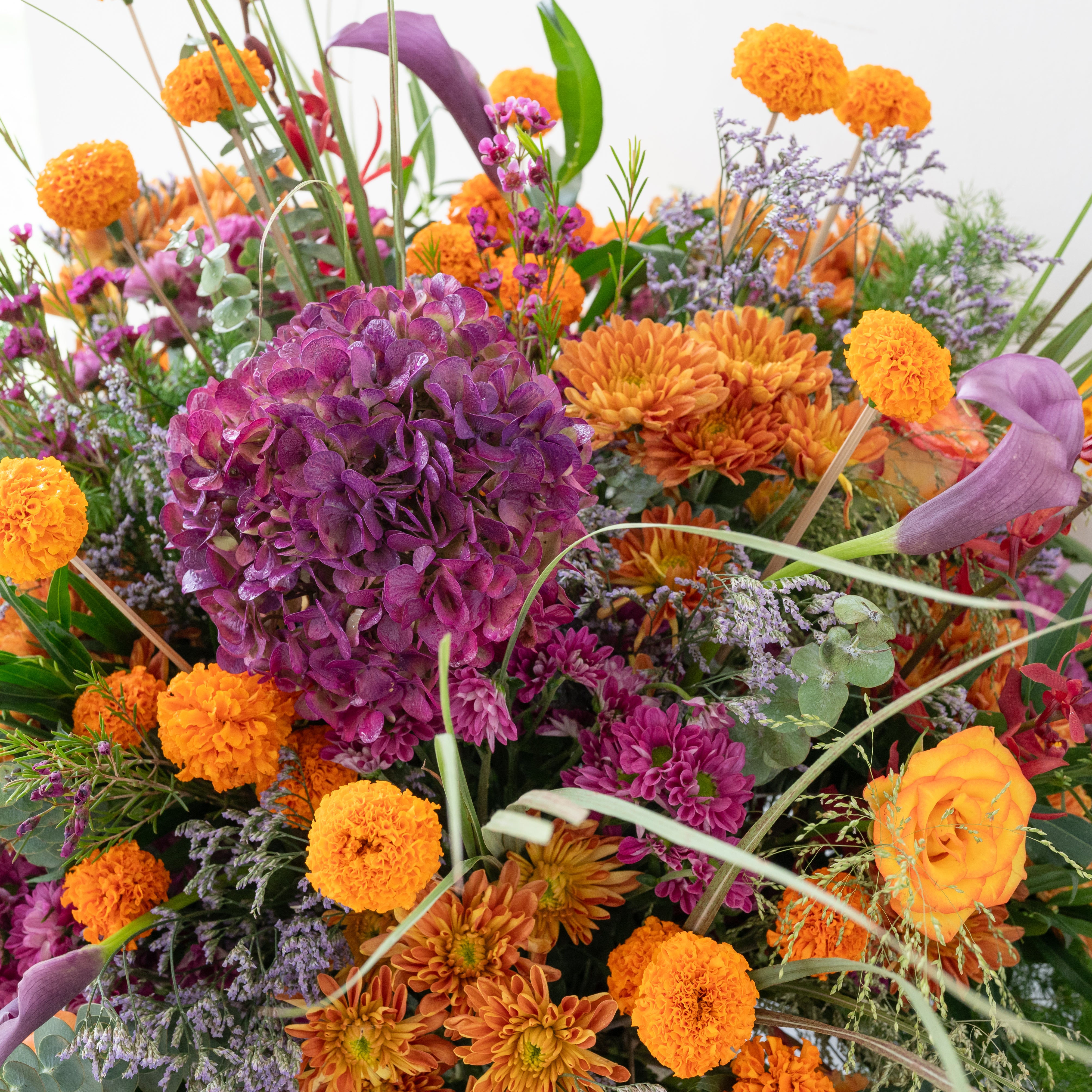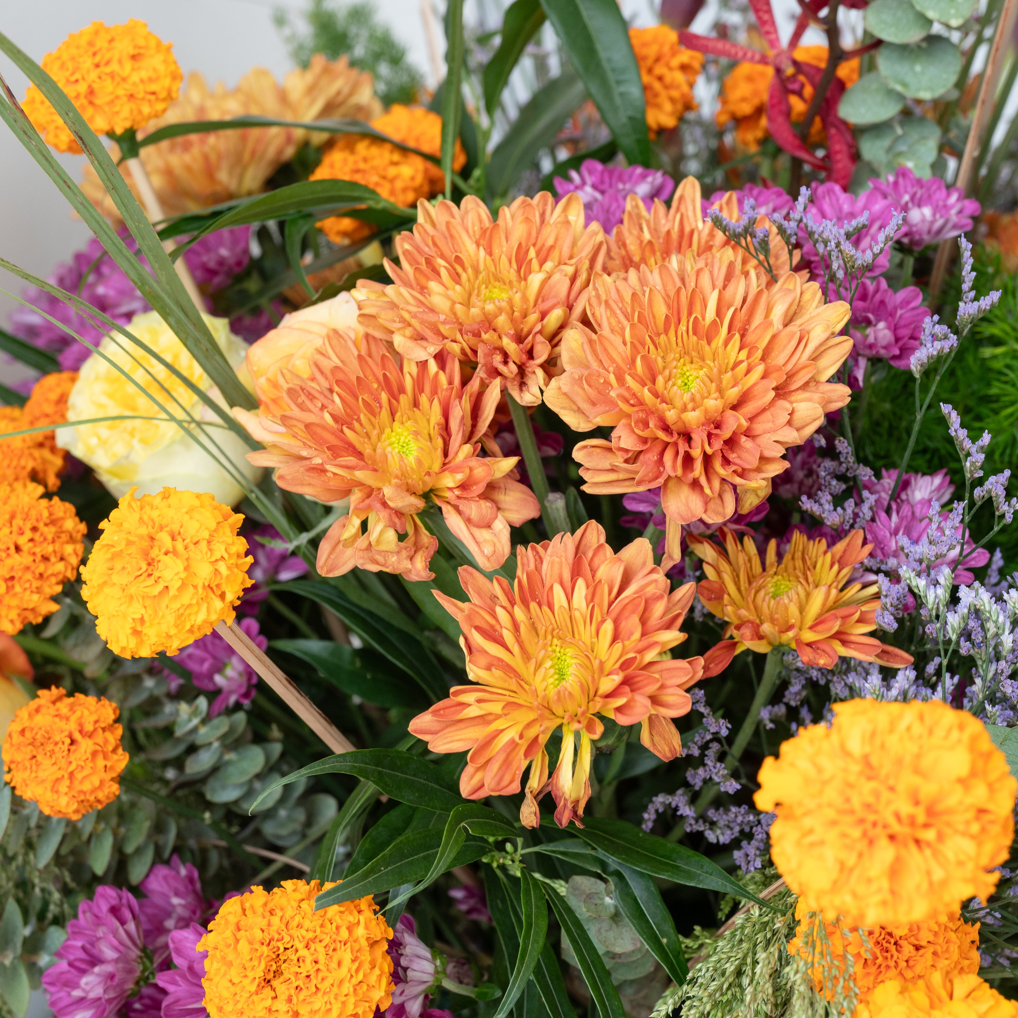 Flowers: Dark Pink with Green Centre Daisy, Orange Daisy, Orange Marigold, Pink Wax, Eucalyptus, Dark Pink Hydrangea & Mixed Greens