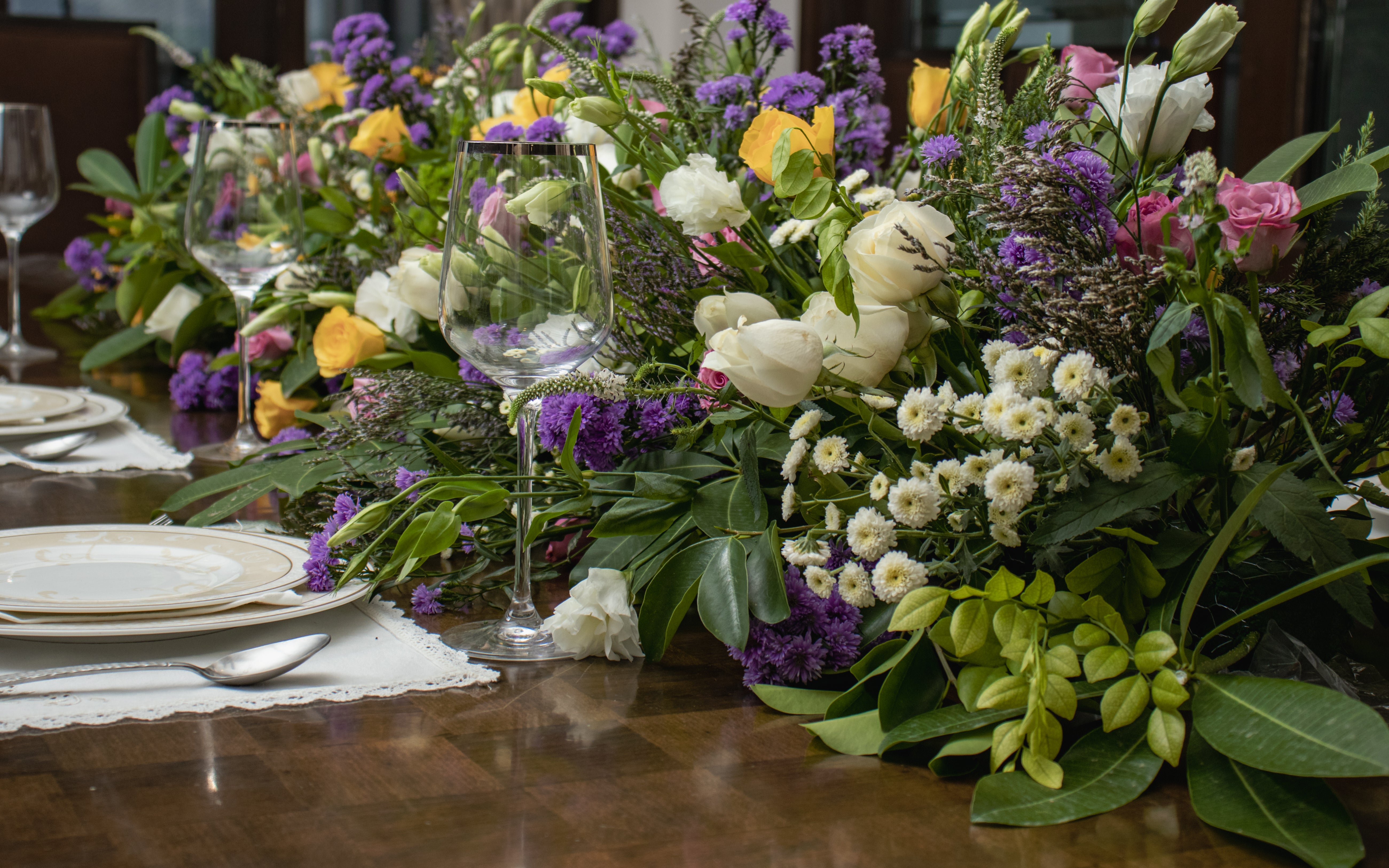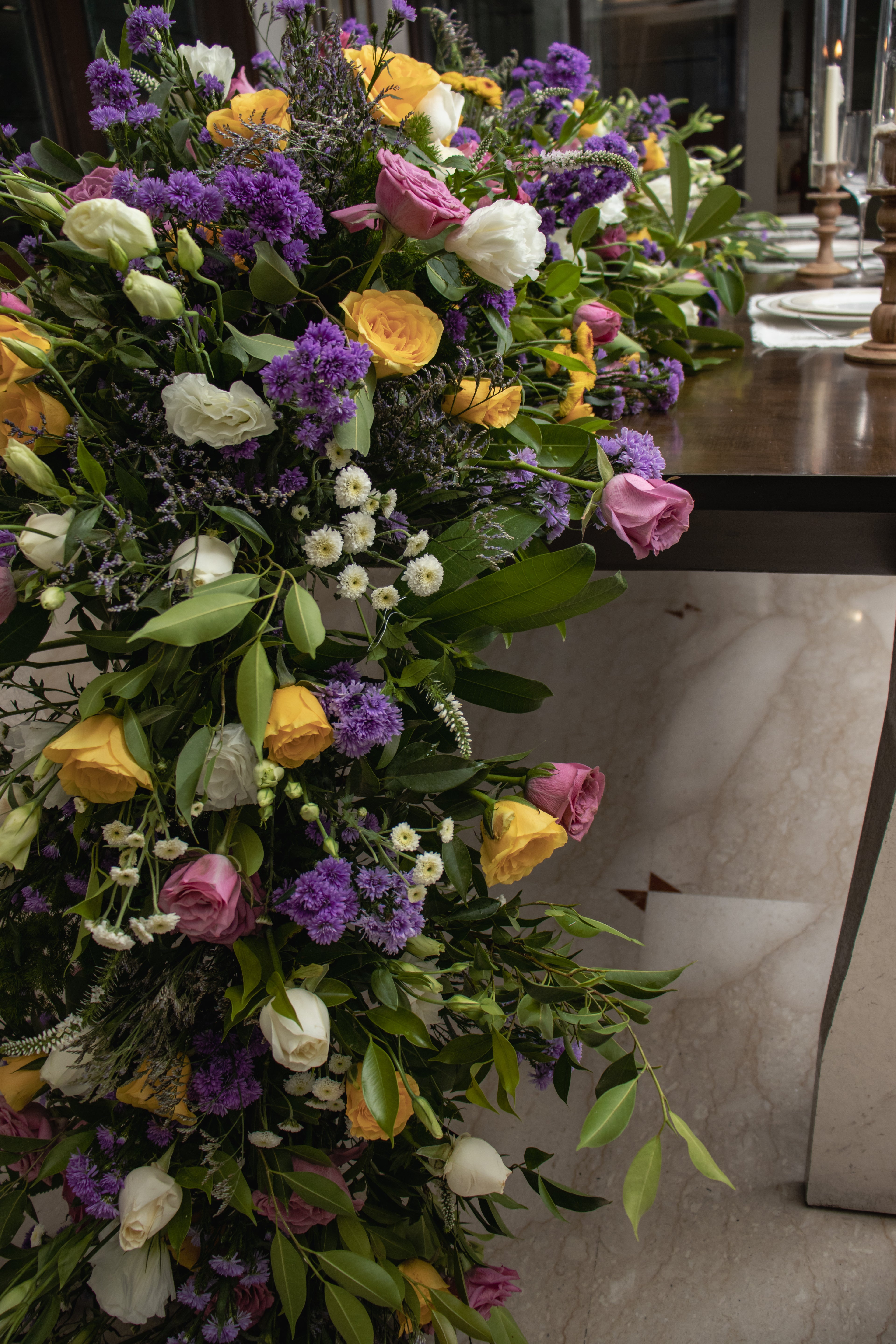 Flowers: Purple Roses, Yellow Roses, White Roses, White Eustomas, Yellow Daisy Buttons, White Daisy Buttons, White Veronica, Asters, Purple Limonium & Mixed Greens