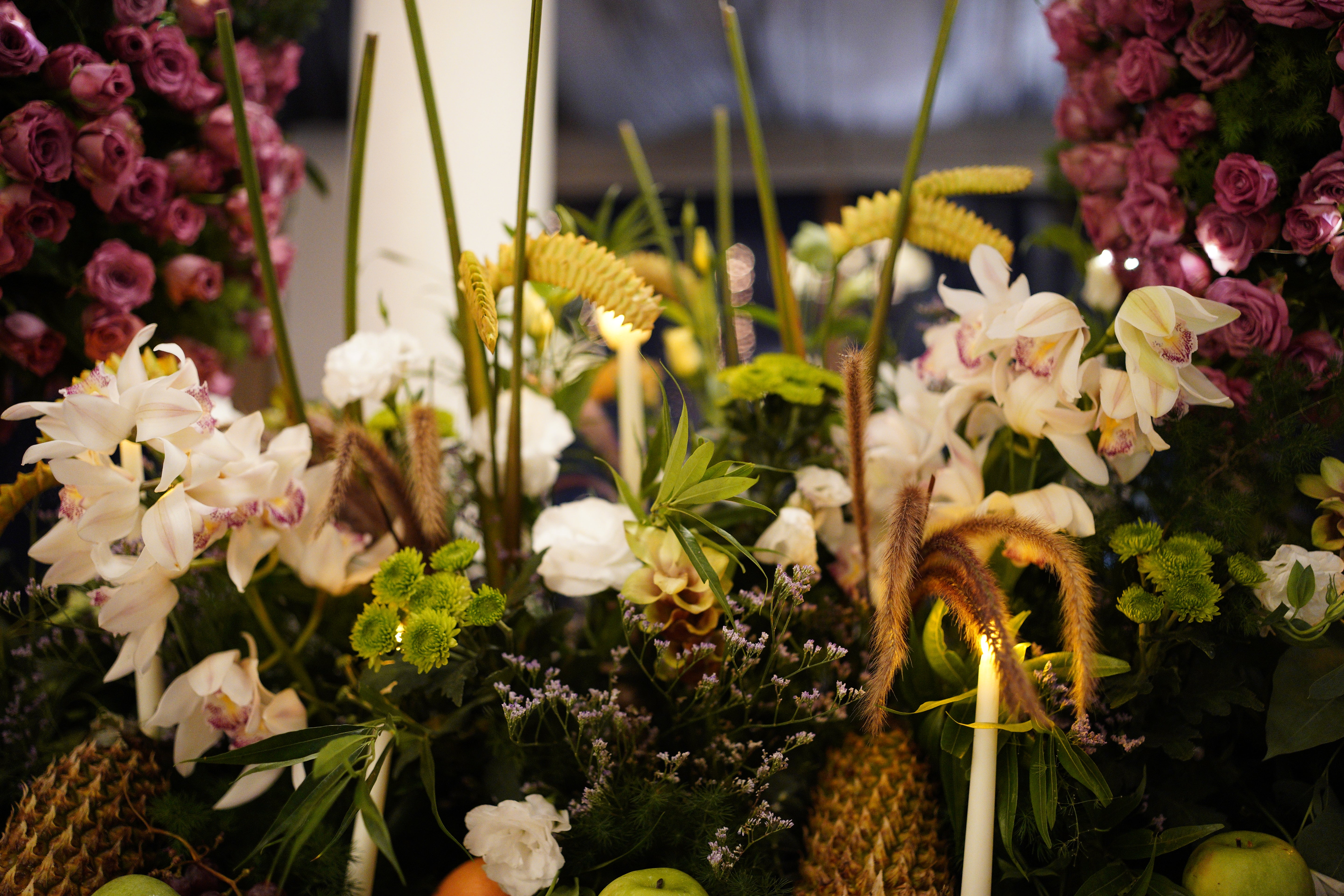 Flowers: Purple Roses, White Cymbidium, White Eustoma, Green Daisy Button, Eucalyptus, Mixed greens & Fillers.