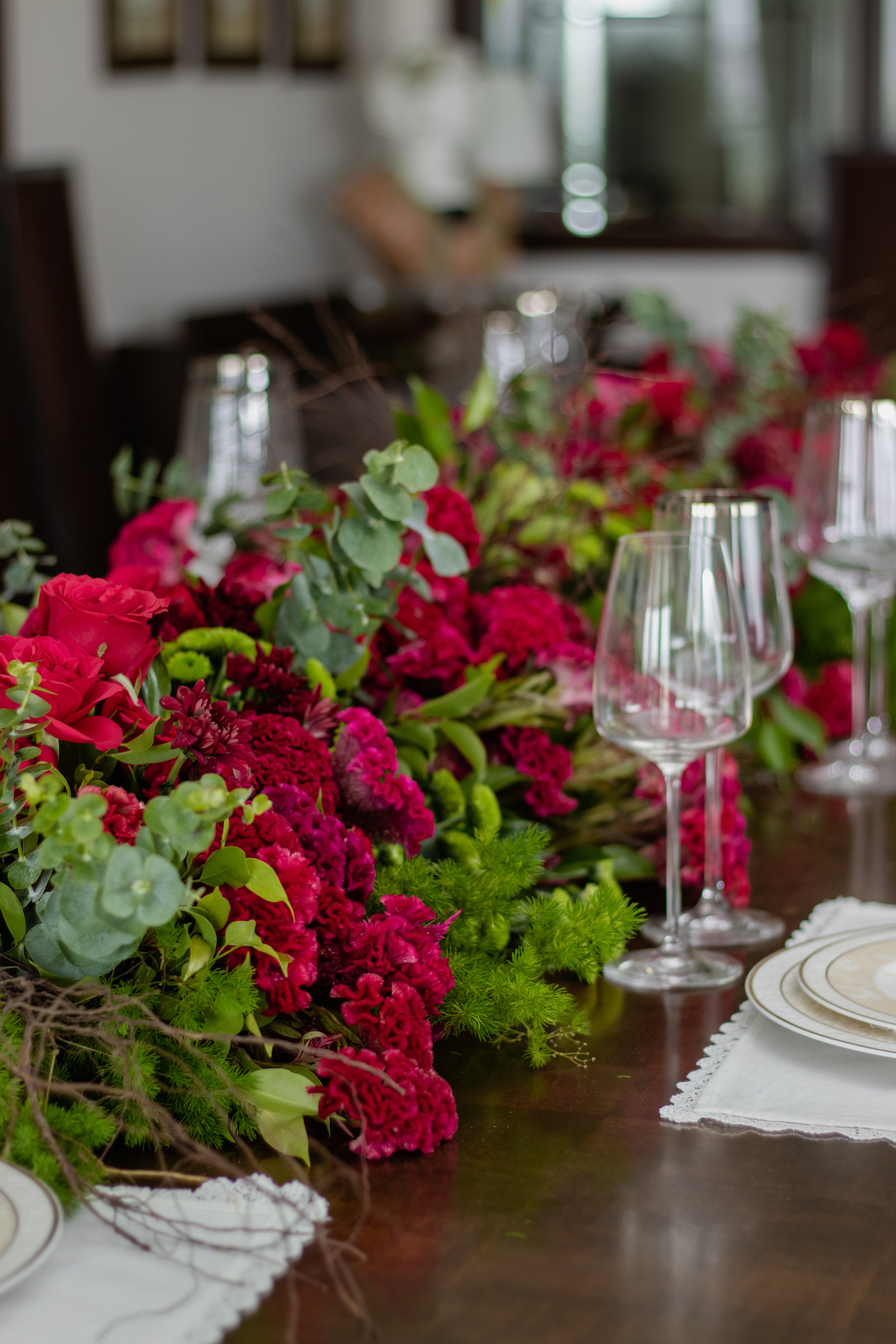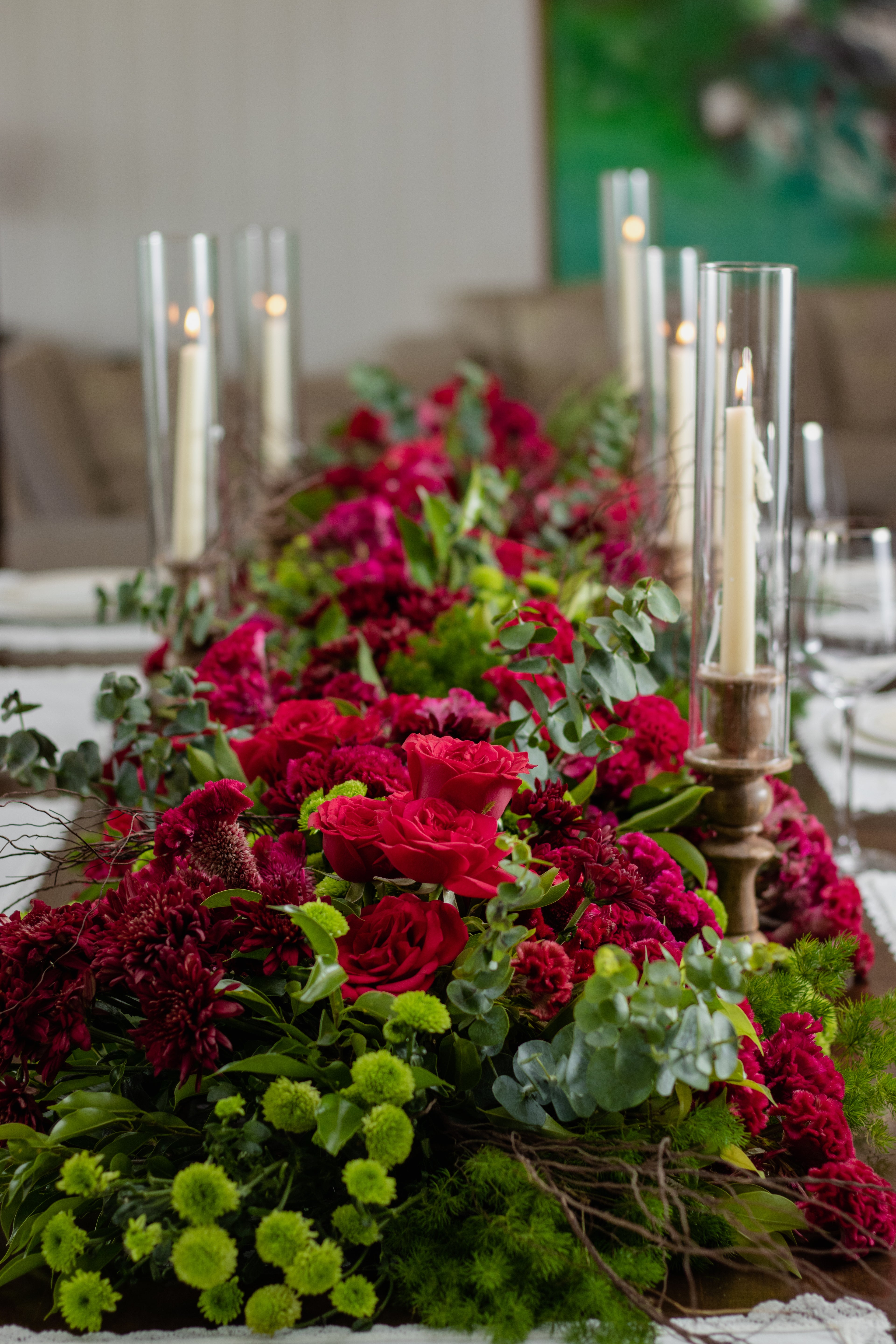 Flowers: Red Roses, Red Daisy, Red Cockscomb, Green Daisy Buttons, Eucalyptus & Mixed Greens
