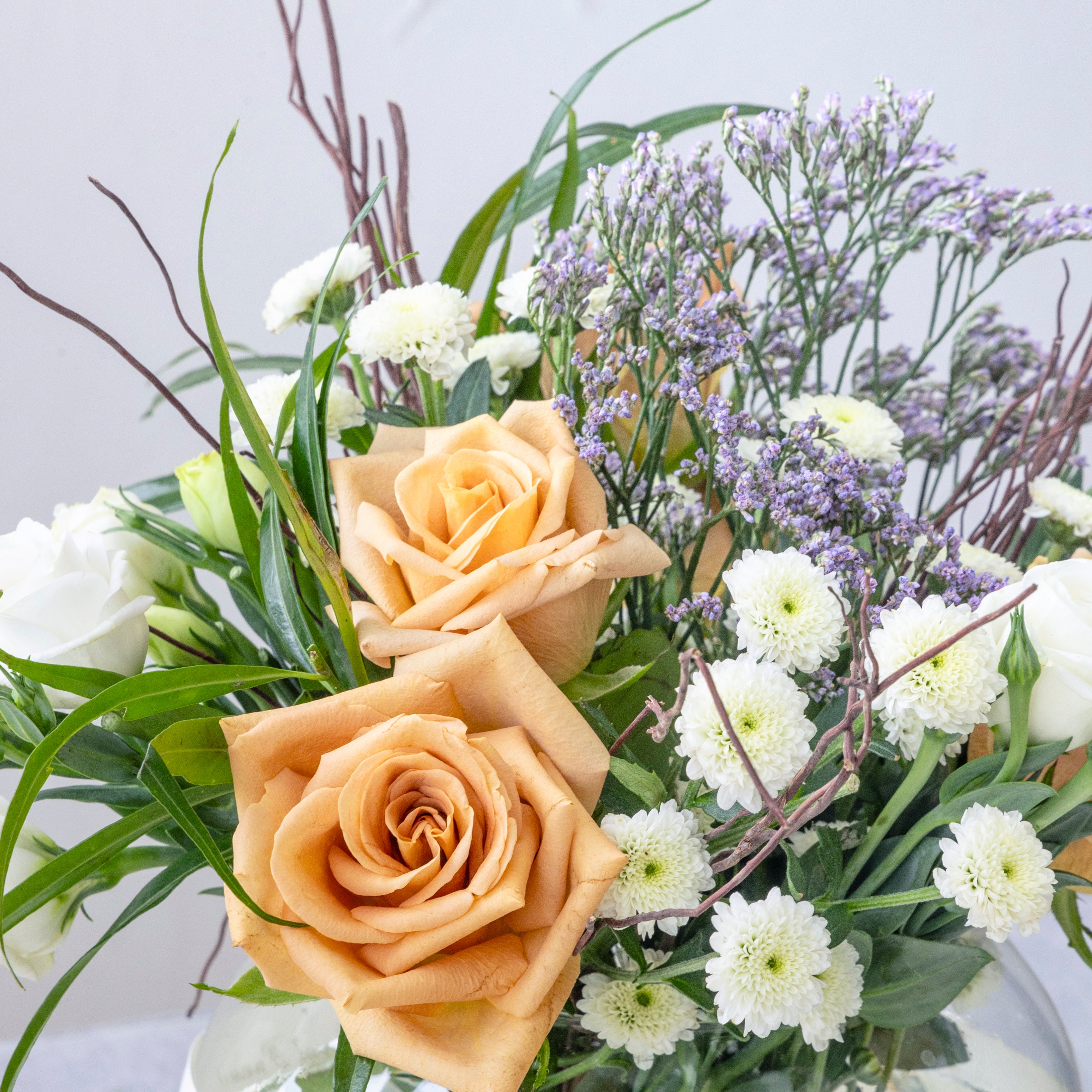 Flowers: Coffee Roses, White Daisy, White Eustomas, Purple Limonium & Chilli Leaves