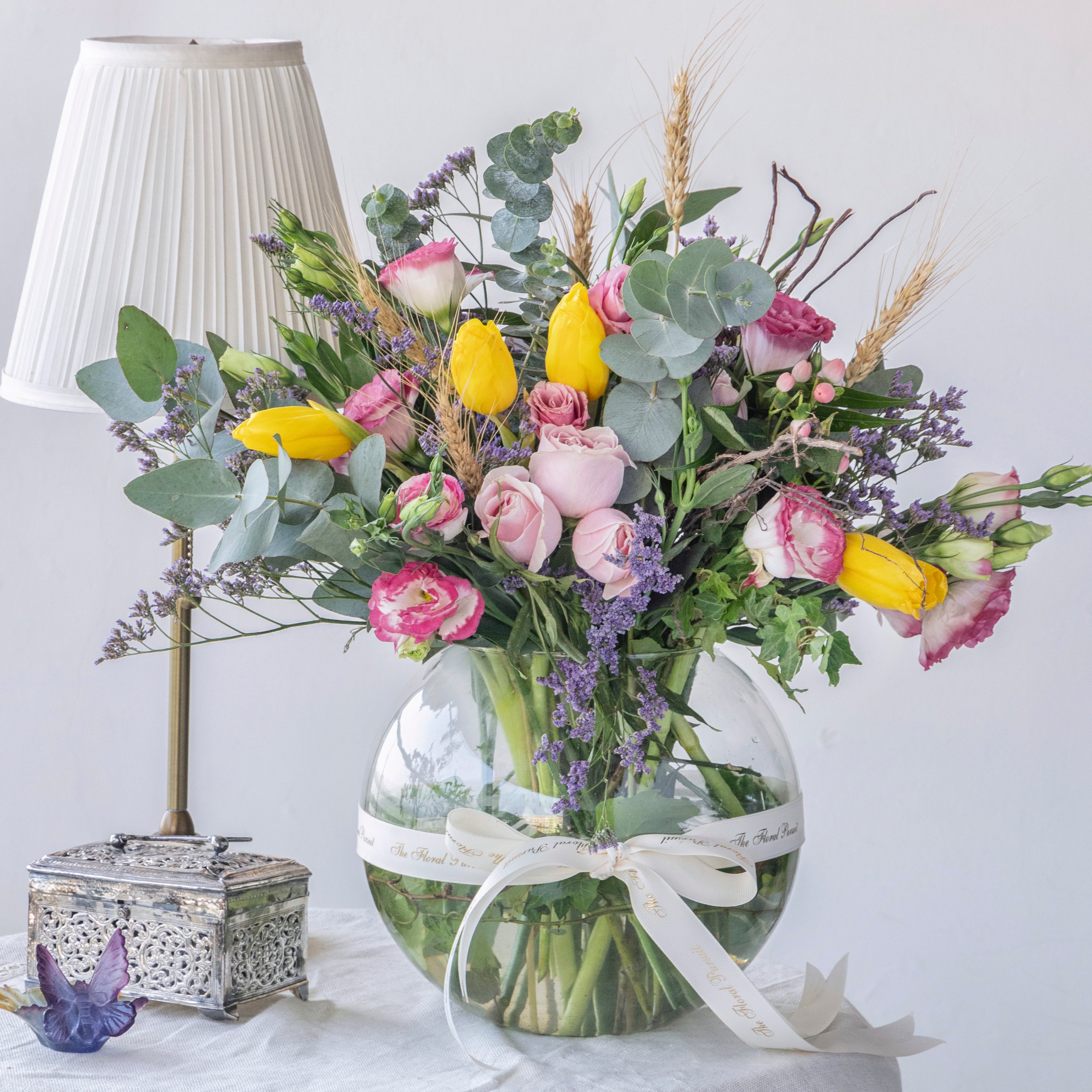 Flowers: Sweet Avalanchee Roses, Pink Eustomas, Yellow Tulips, Pink Hypericum Berries, Purple Limonium, Eucalyptus, Mixed Greens, Dry Wheat Sticks