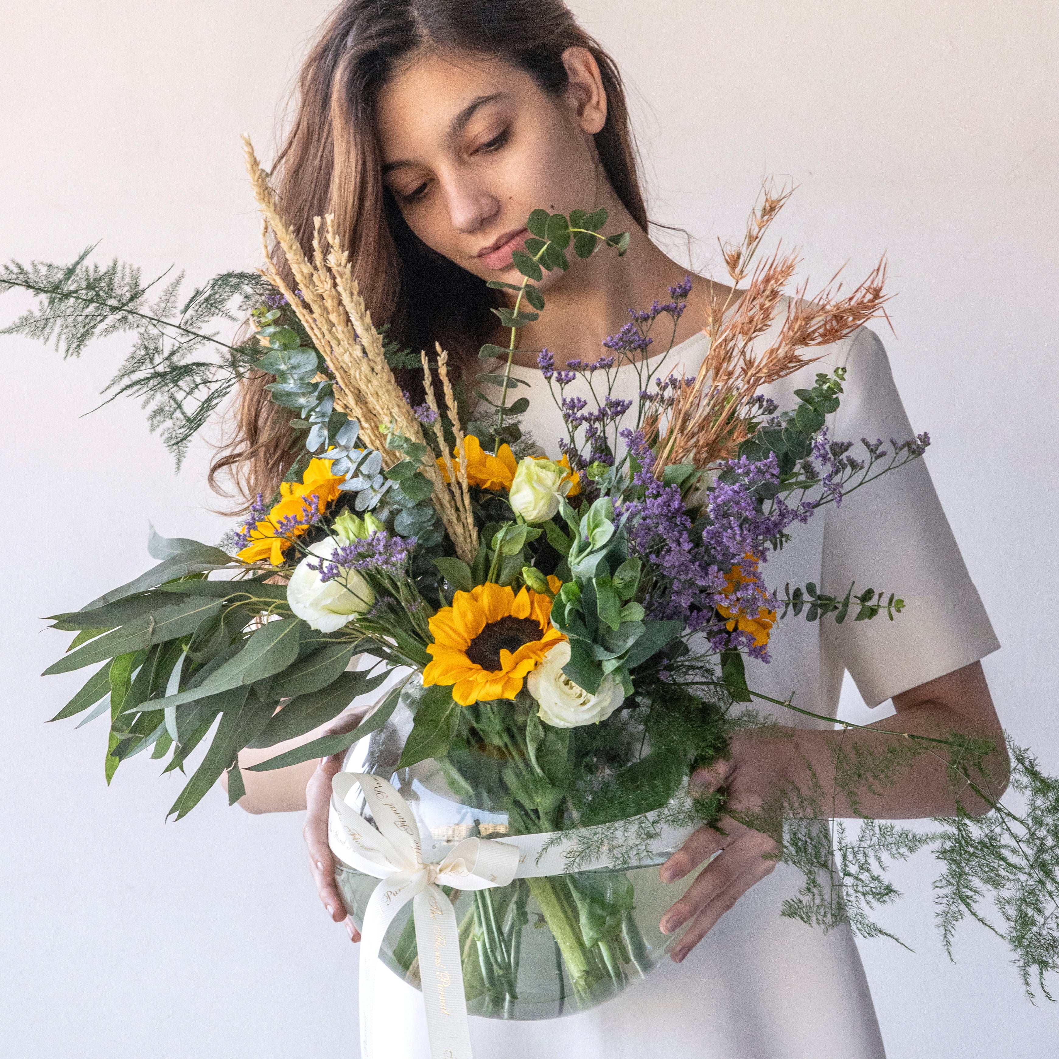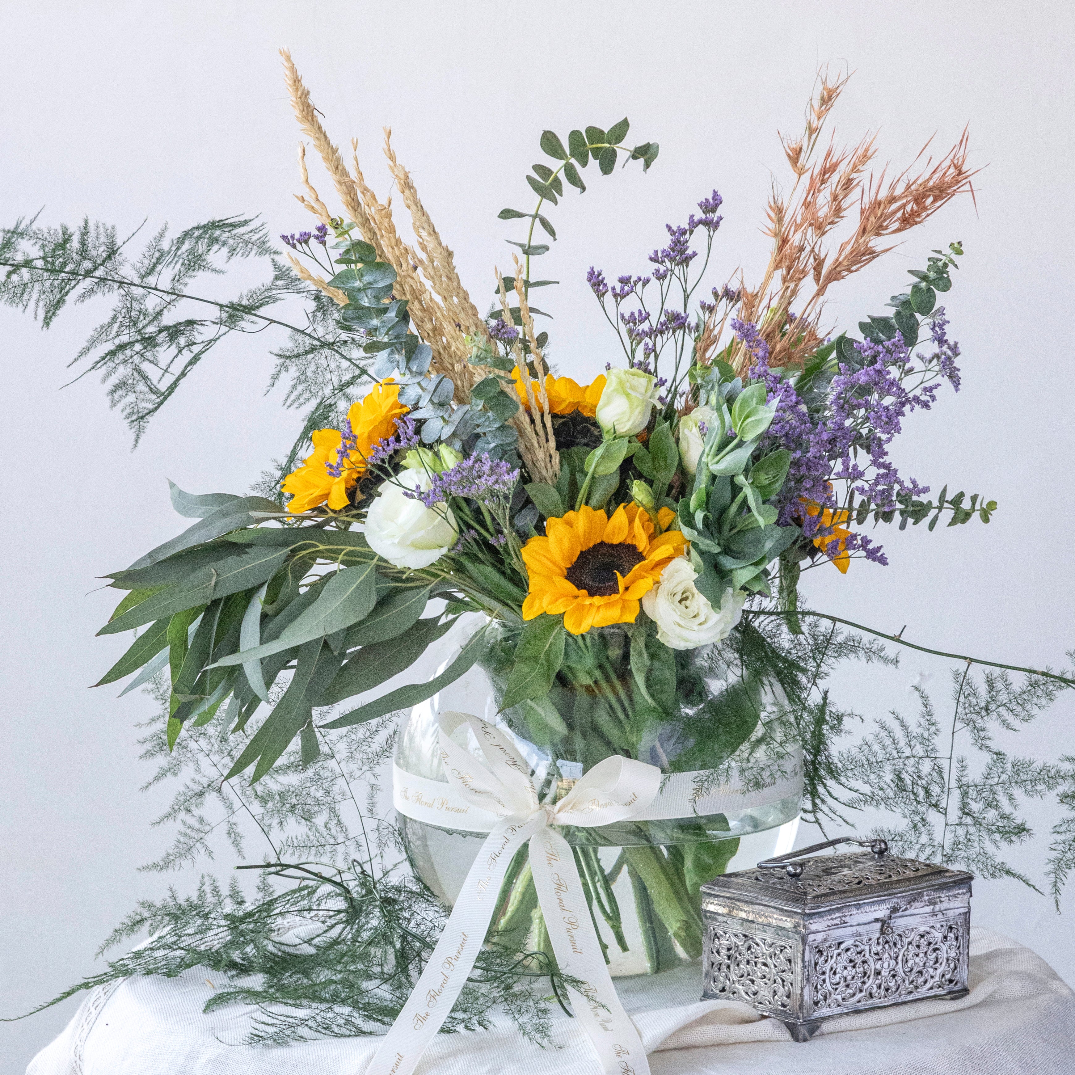 Flowers: Sunflower, White Lisianthus, Purple Limonium, Eucalyptus, Mixed Greens, Mixed Drys
