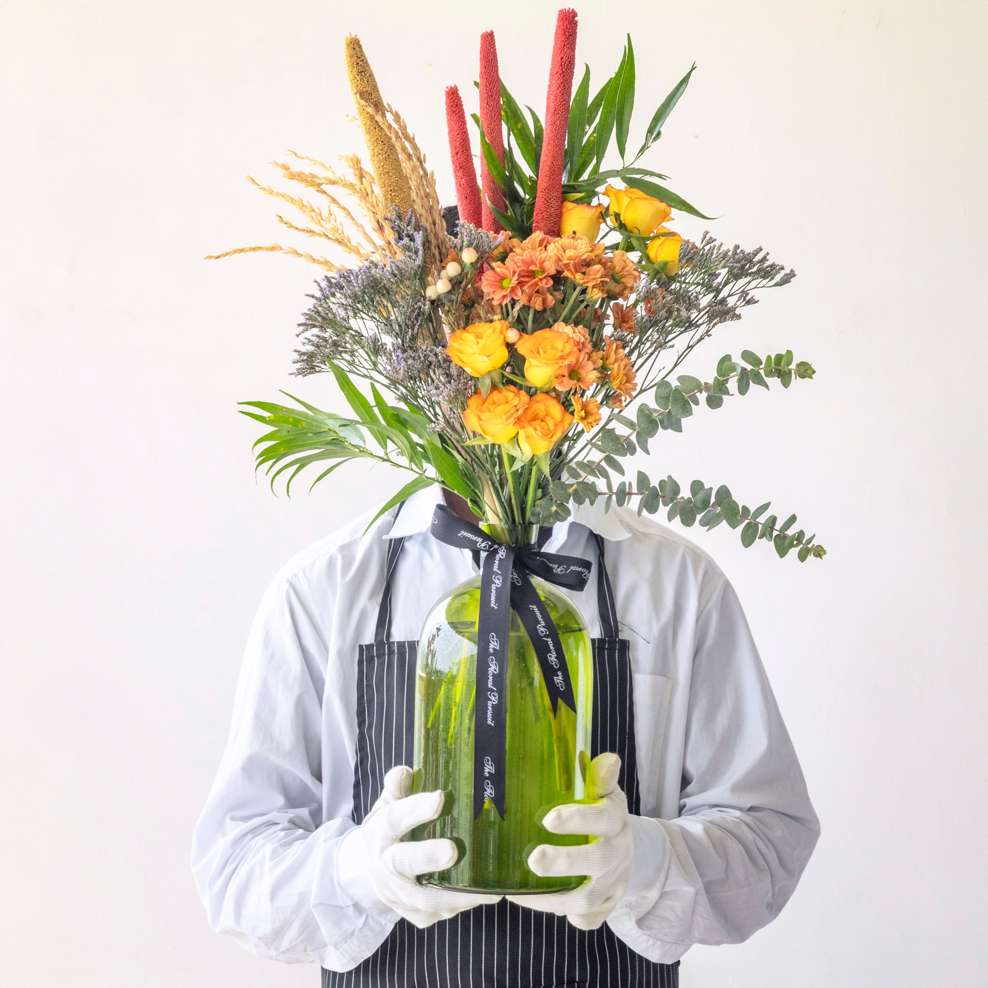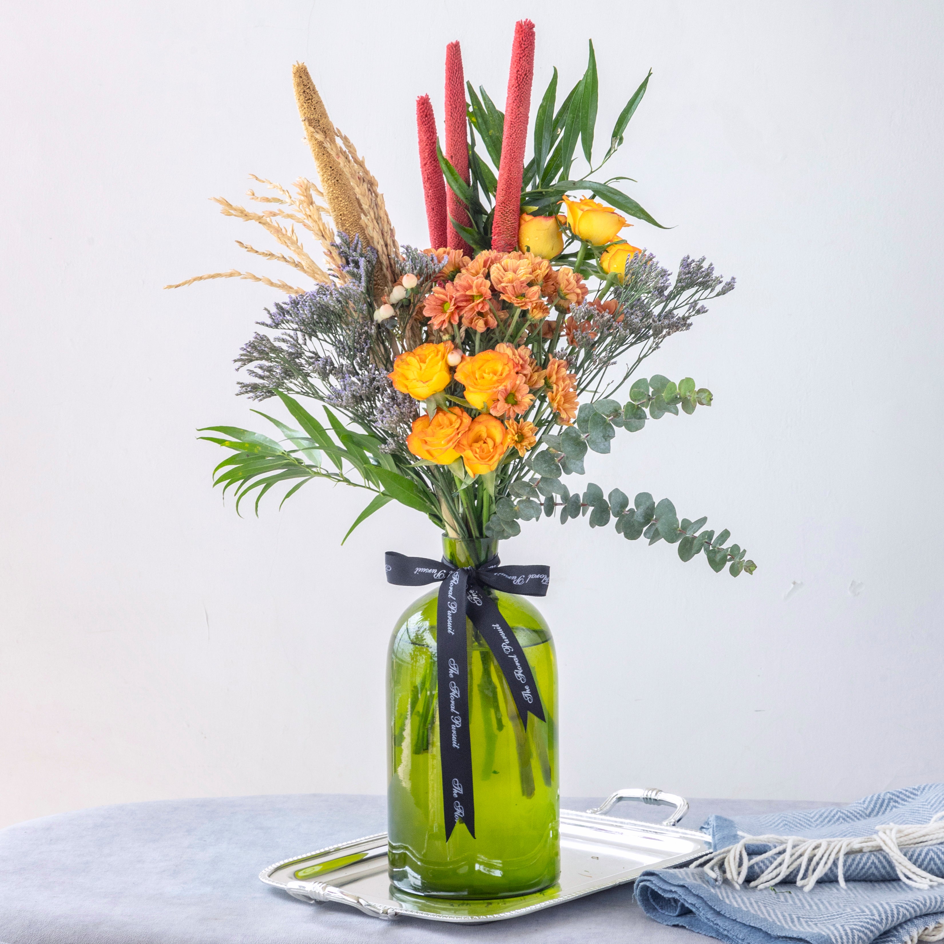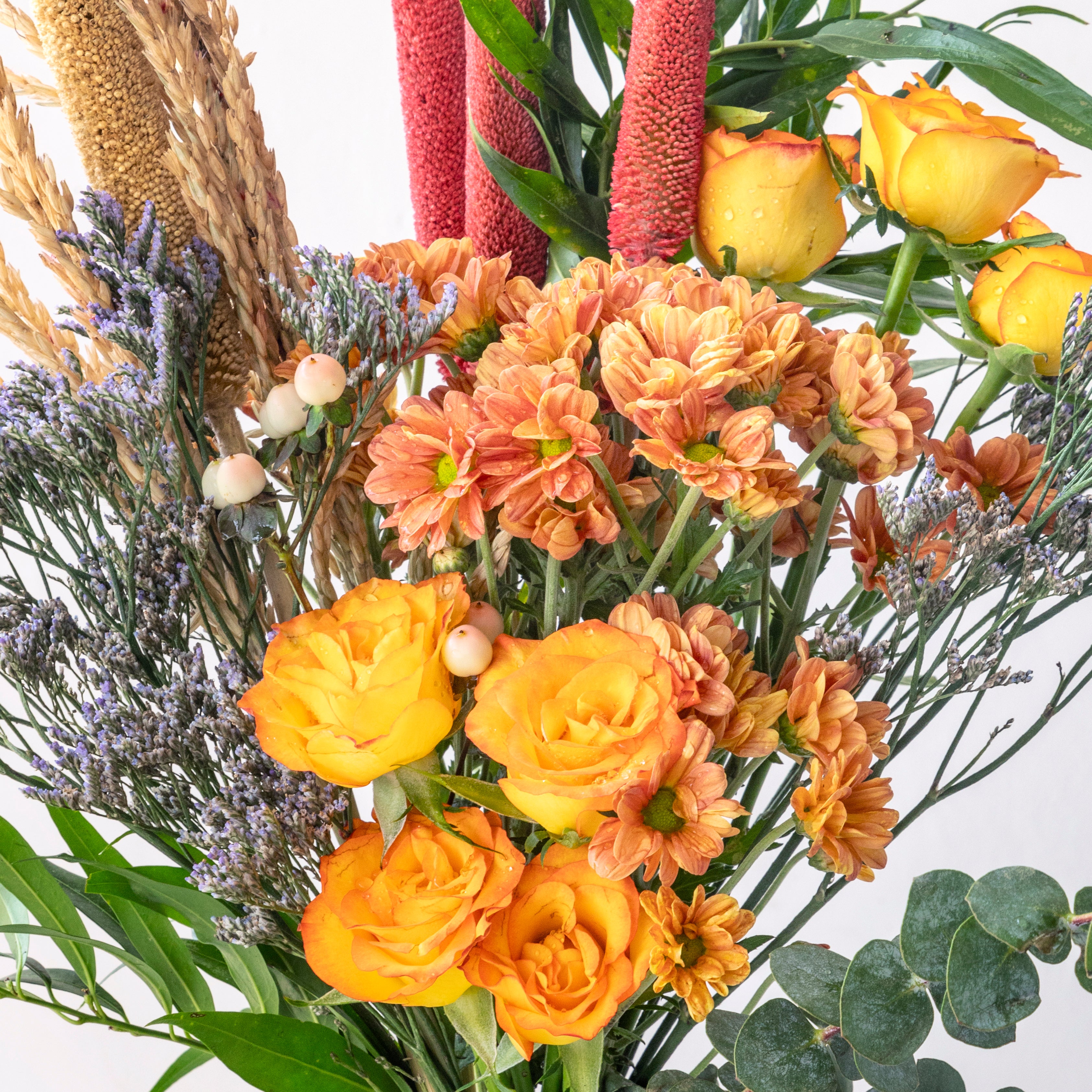 Flowers: Double Shaded Orange Roses, Orange Daisies, Dried Bajra, Dried Wheat, Eucalyptus, Pink Hypericum Berries, Eucalyptus, Purple Limonium & Mixed Greens
