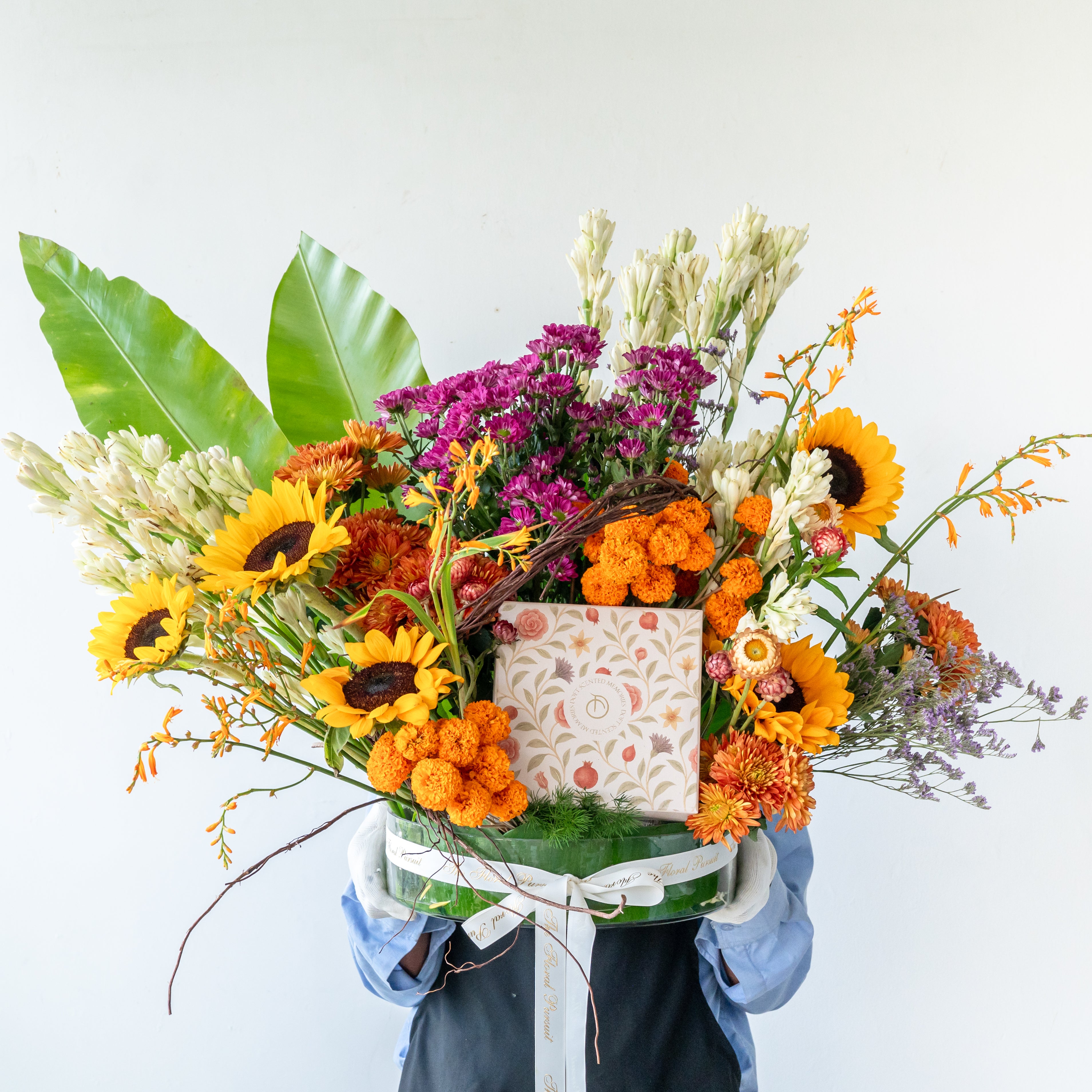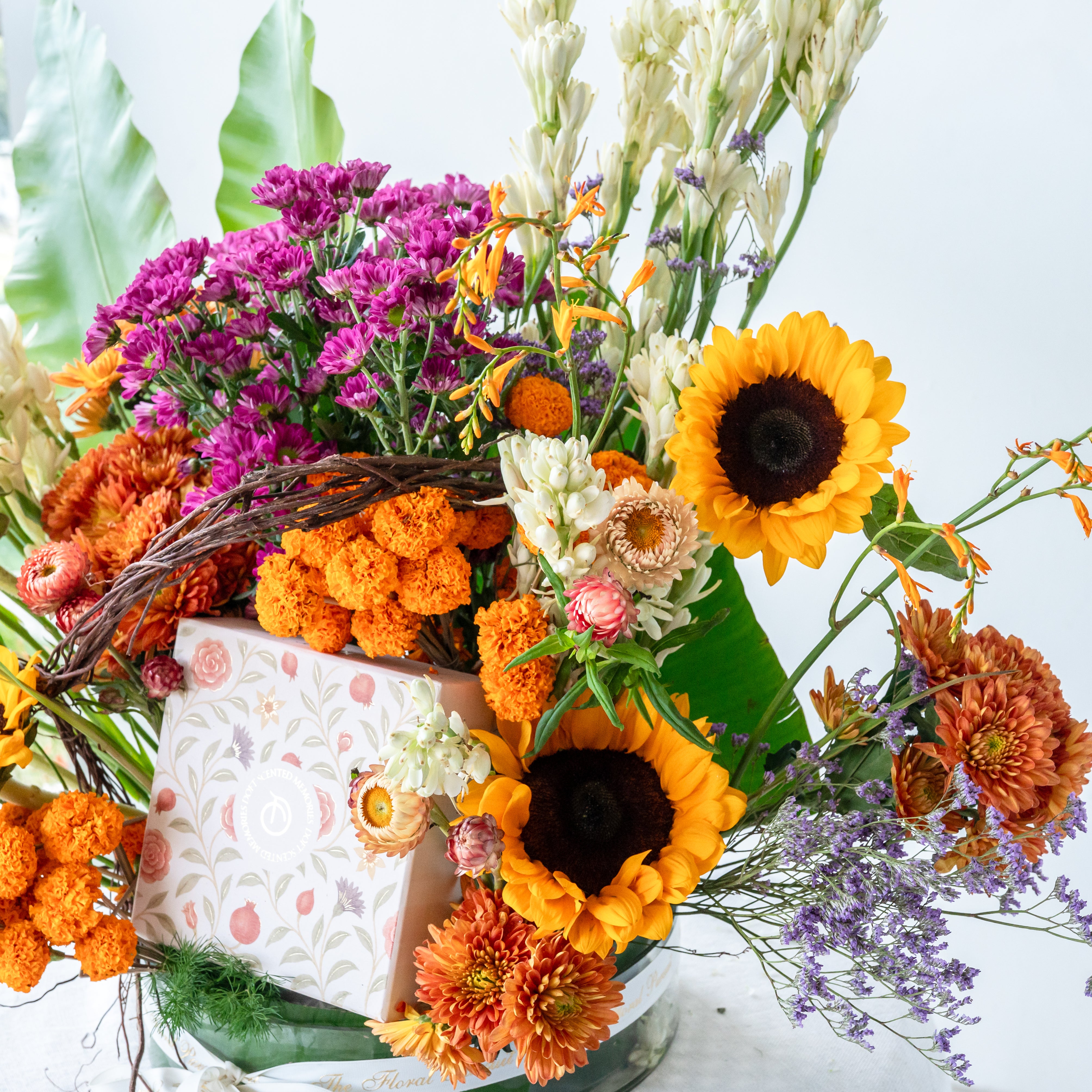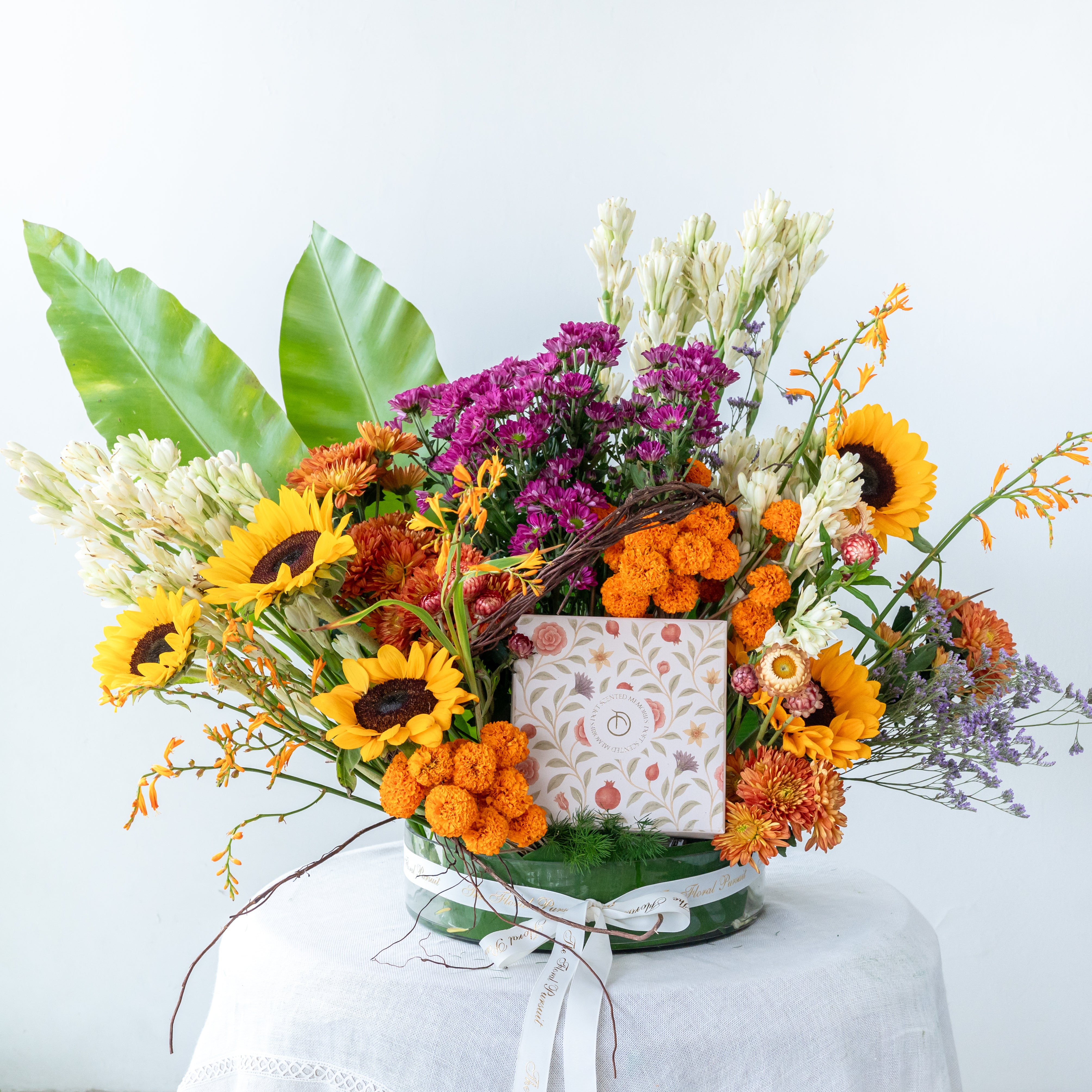 Flowers: Paper Flowers, Sunflowers, Pink Shaded Daisy, Orange Daisy, Rajnigandha, Montbretia, Marigold, Limonium, Twigs, Pingpong, Long Leaves