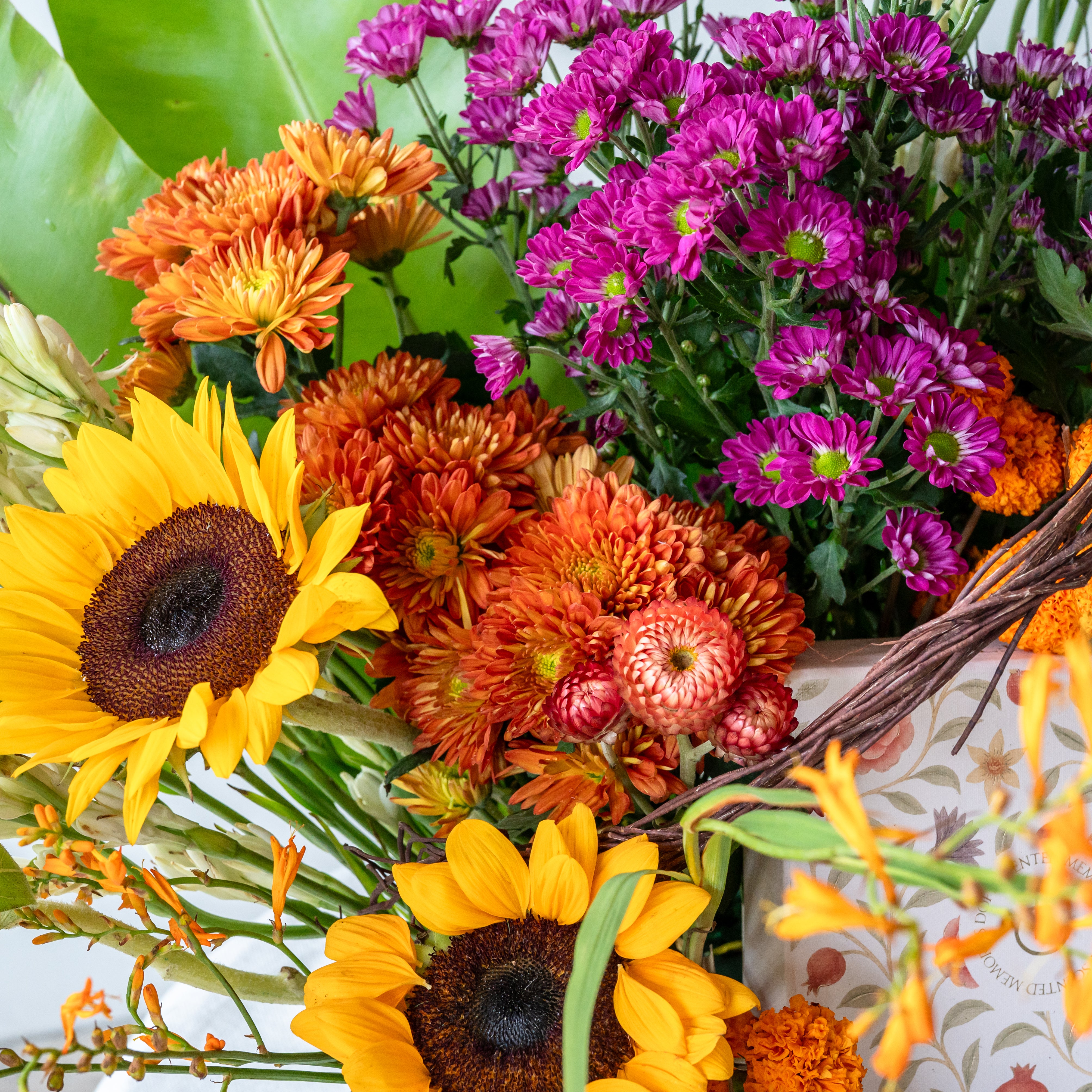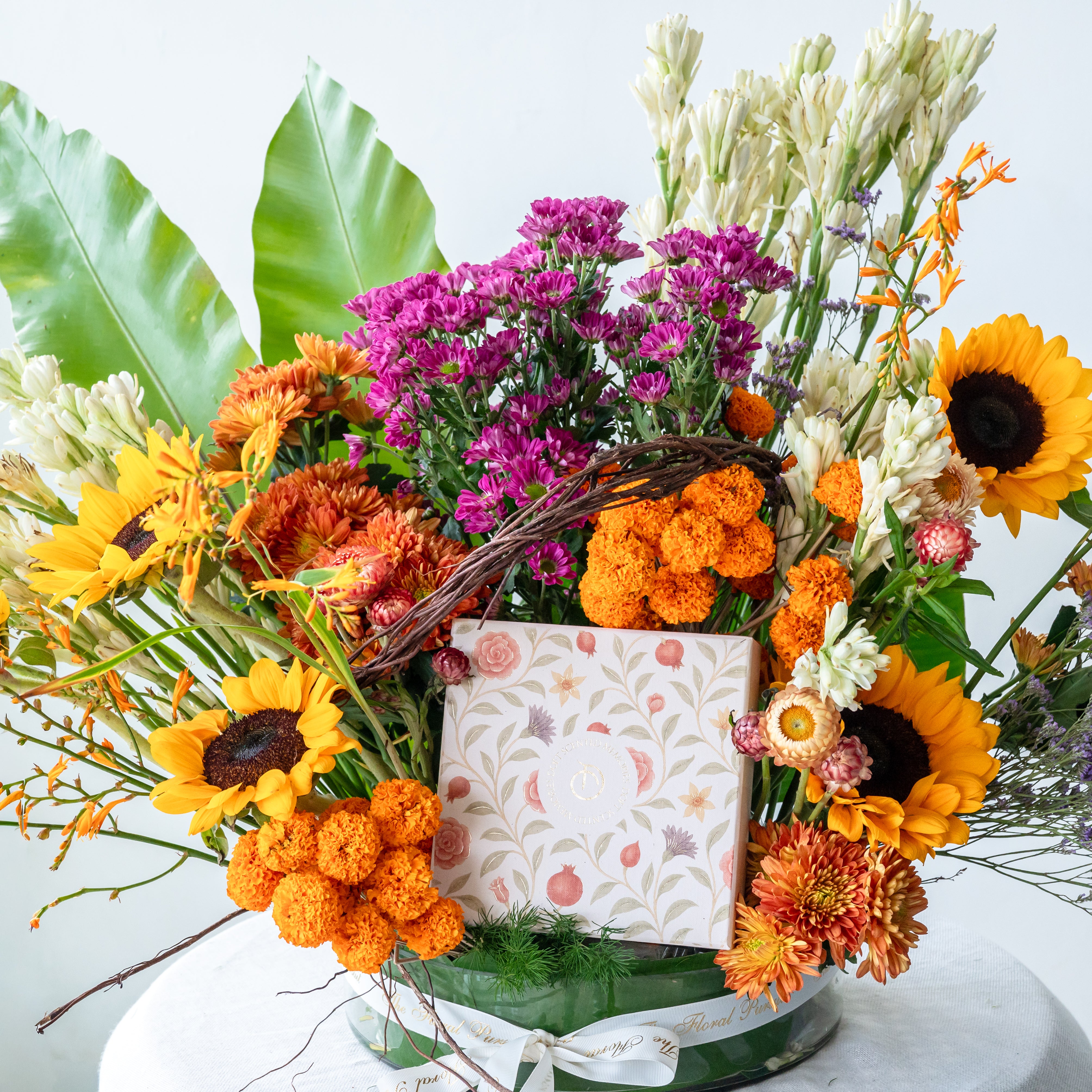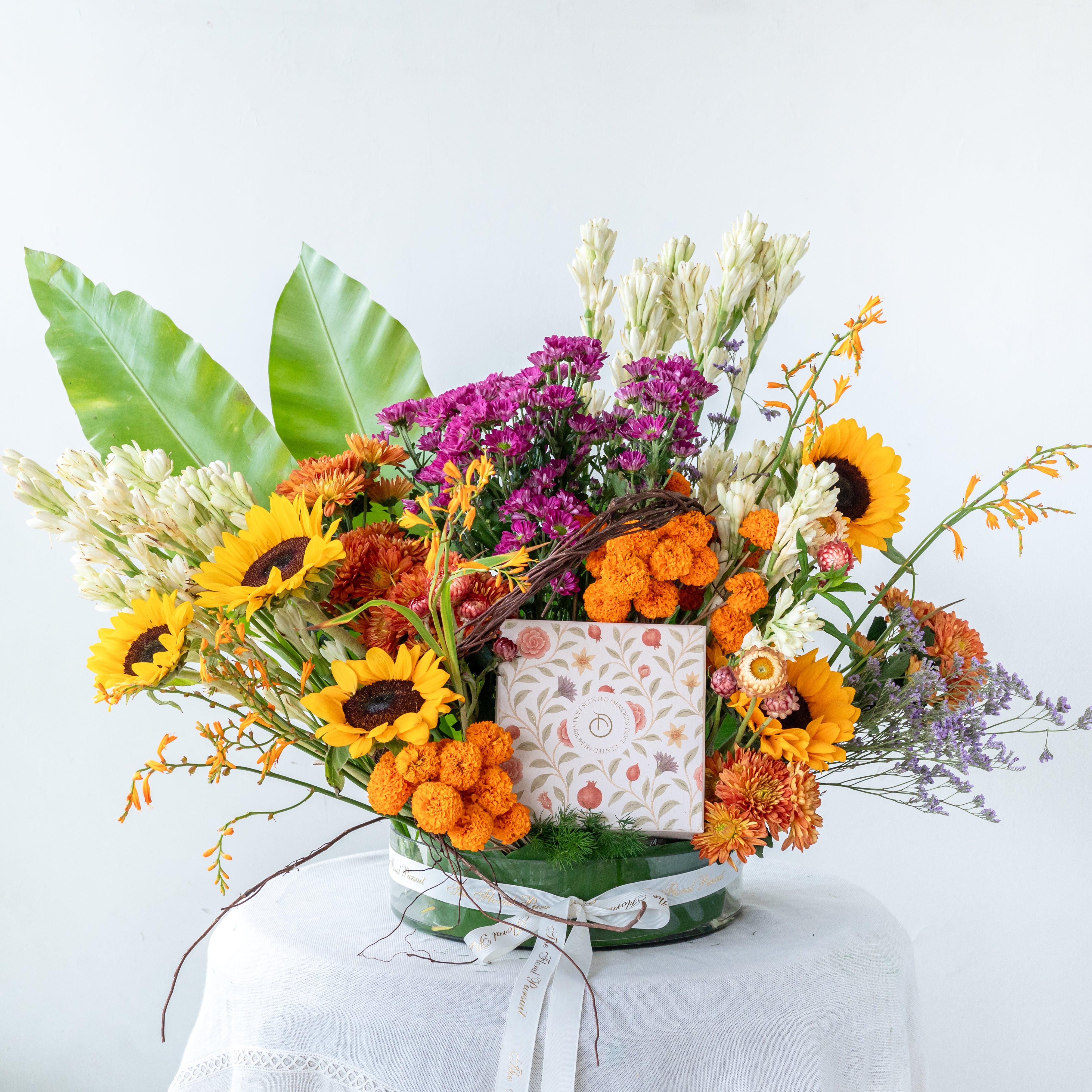 Flowers: Paper Flowers, Sunflowers, Pink Shaded Daisy, Orange Daisy, Rajnigandha, Montbretia, Marigold, Limonium, Twigs, Pingpong, Long Leaves