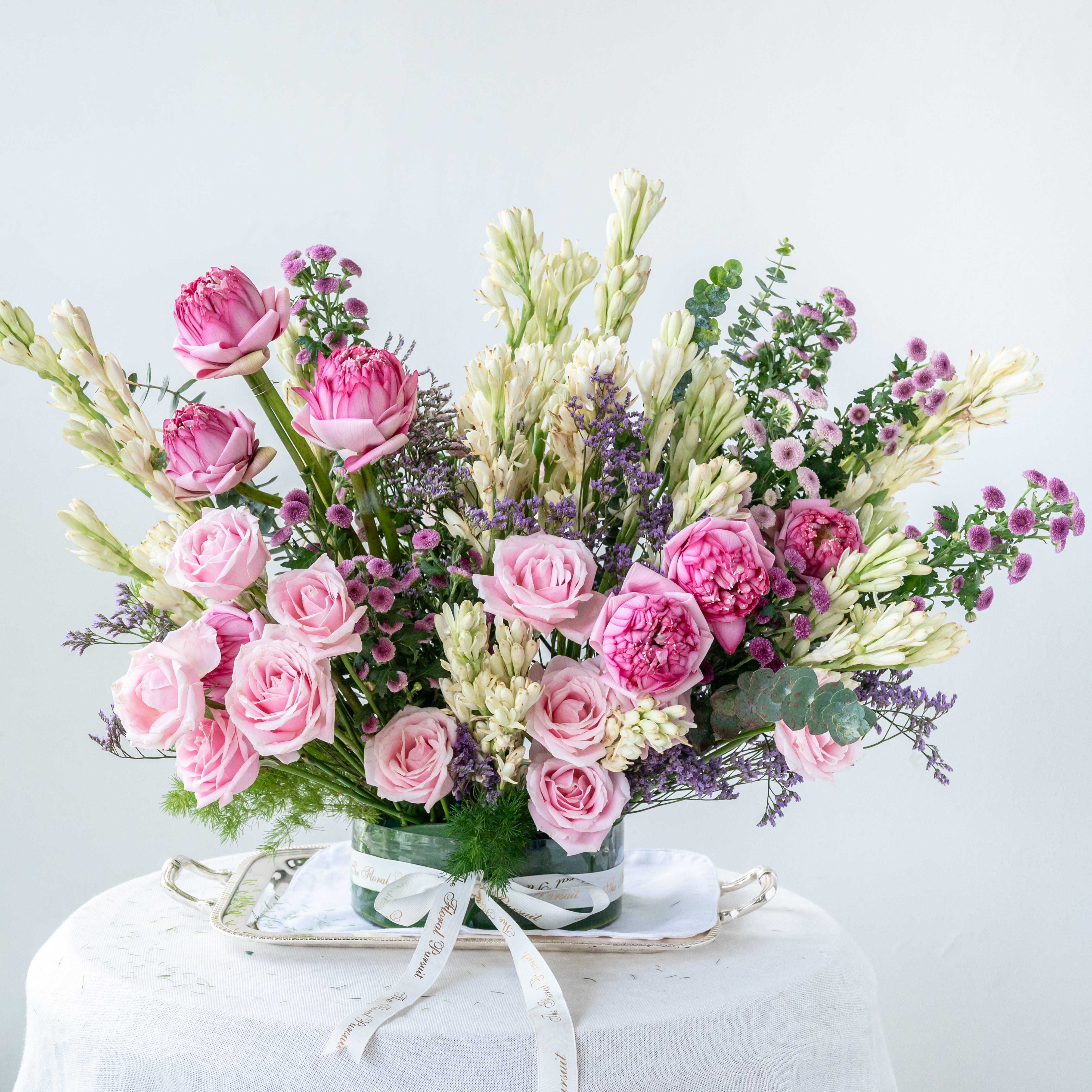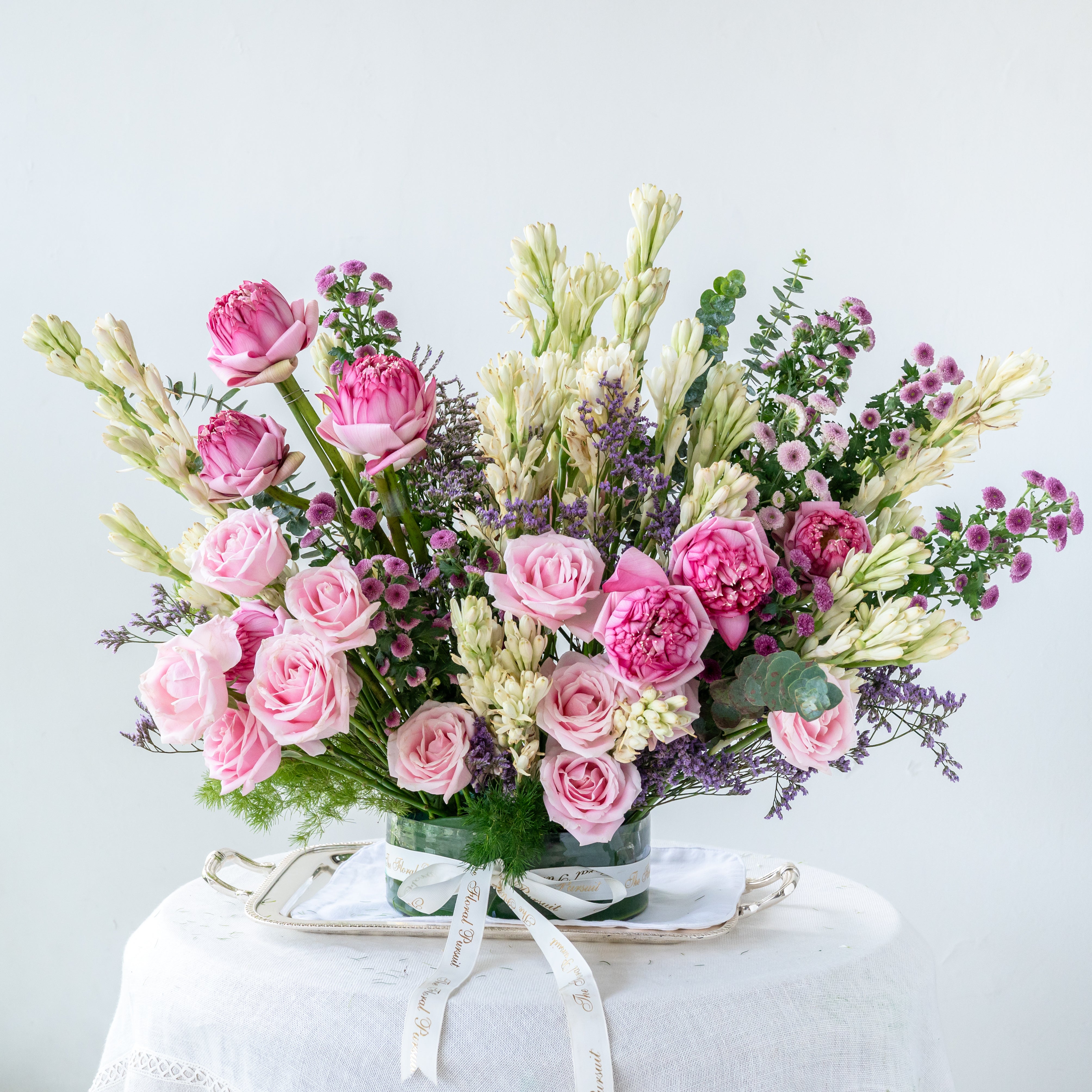 Console Arrangement: A console arrangement is a three-sided arrangement and has green foliage at the back. It is ideal to be displayed on a console table or a coffee table against a wall.