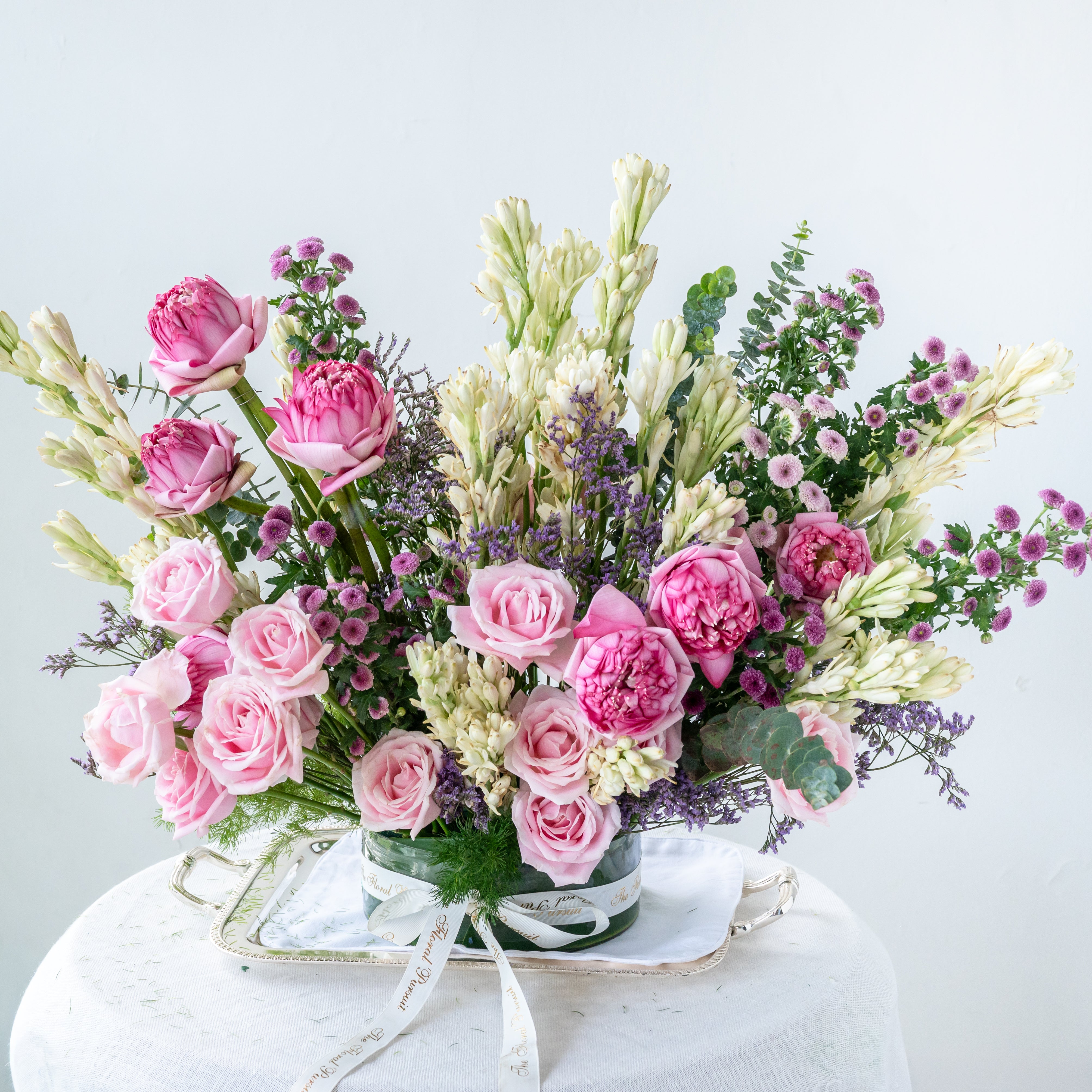 Flowers: Lotus, Pink Roses, Pink Button Daisy, Rajnigandha, Pinpong, Limonium, Eucalyptus