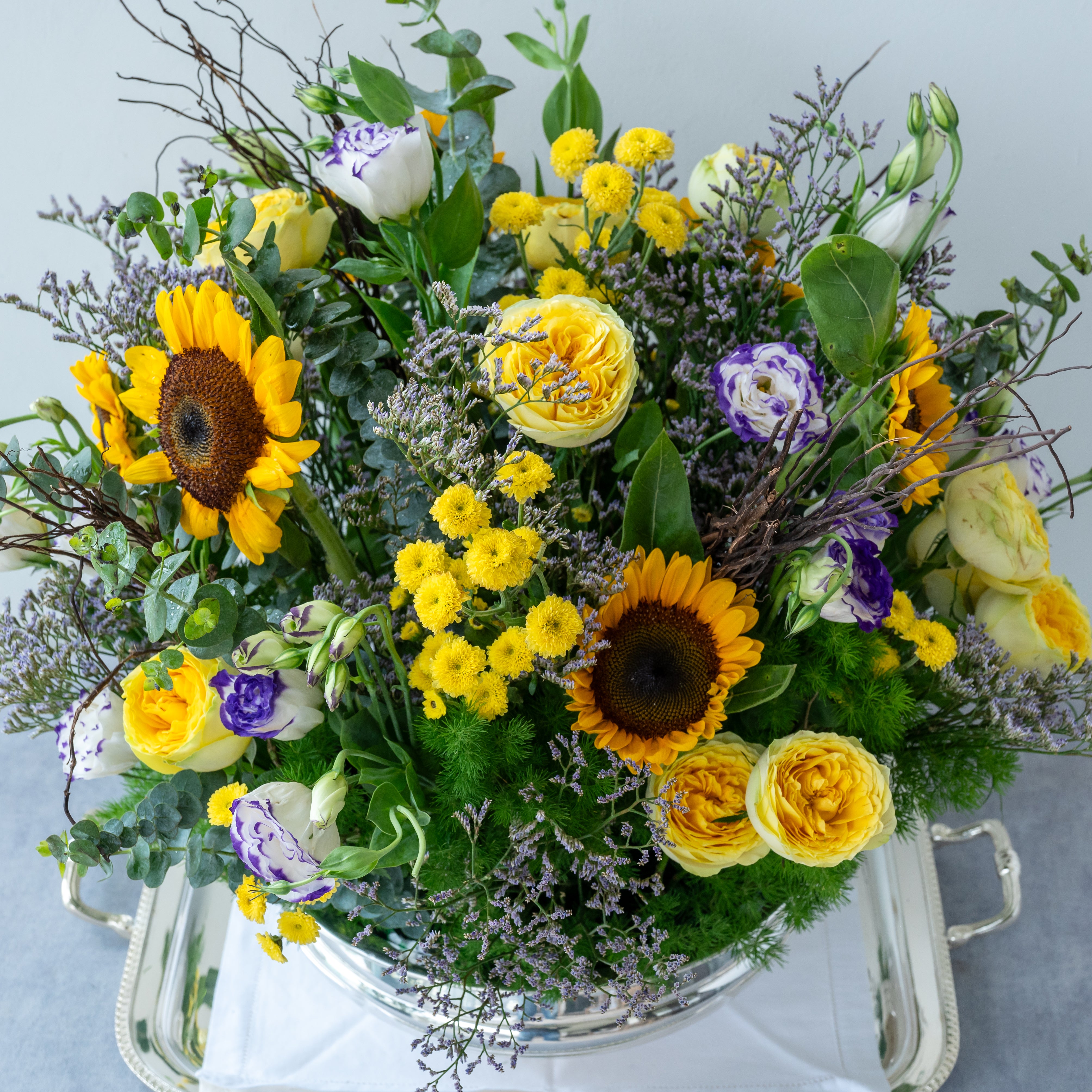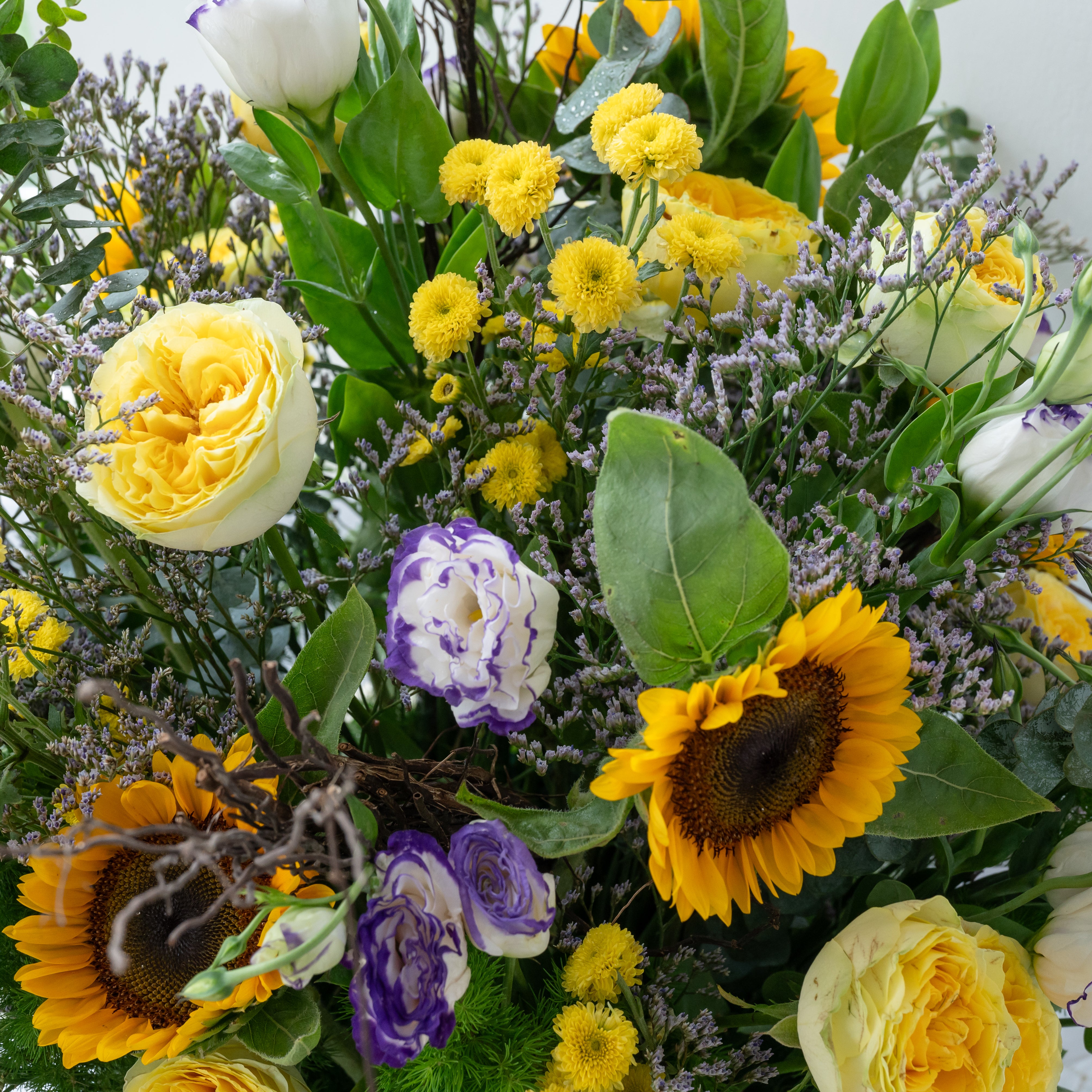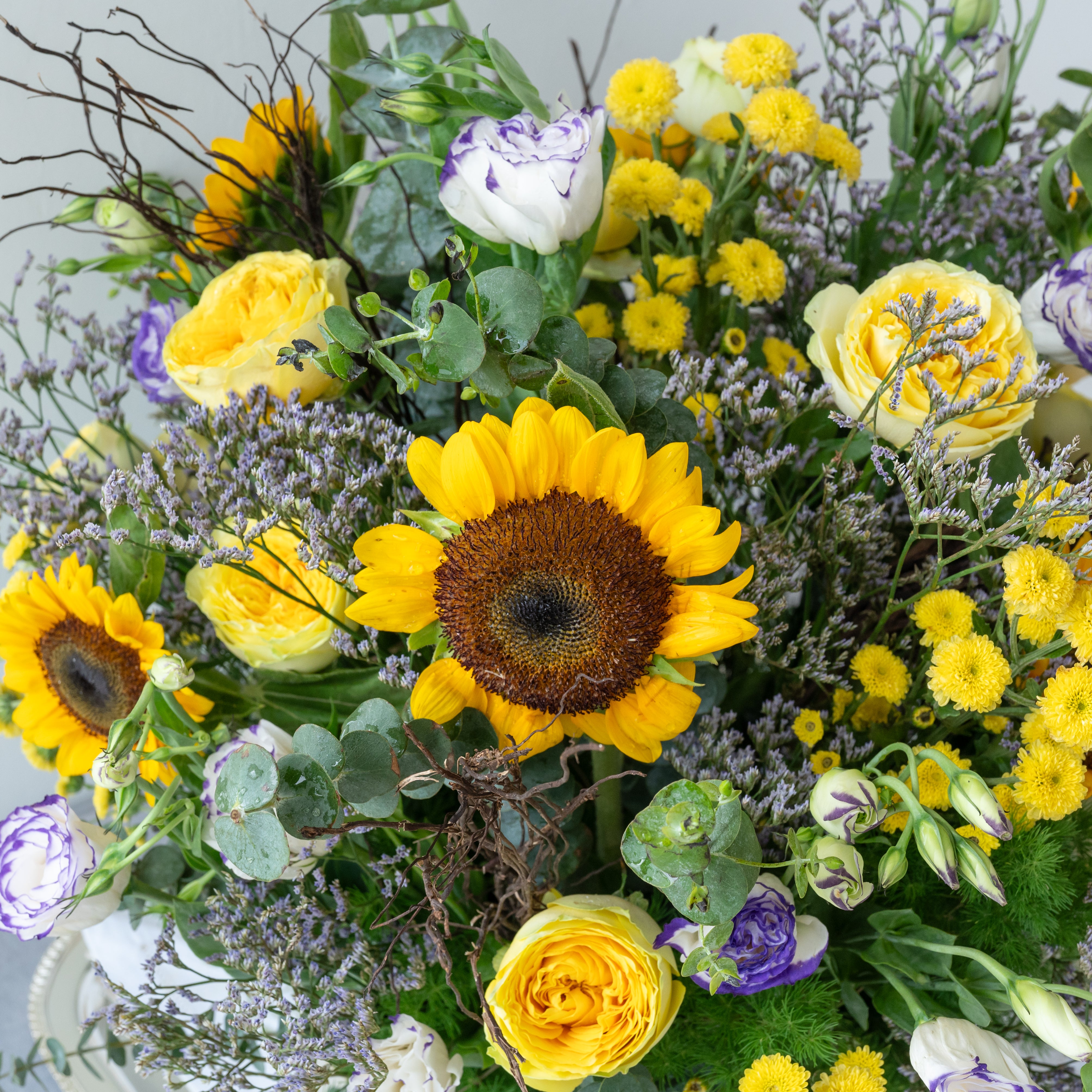 Flowers: Sunflower, Yellow Button Daisy, Double Shaded Purple Eustomas, Yellow Cabbage Roses, Euacalyptus, Limonium & Mixed Greens