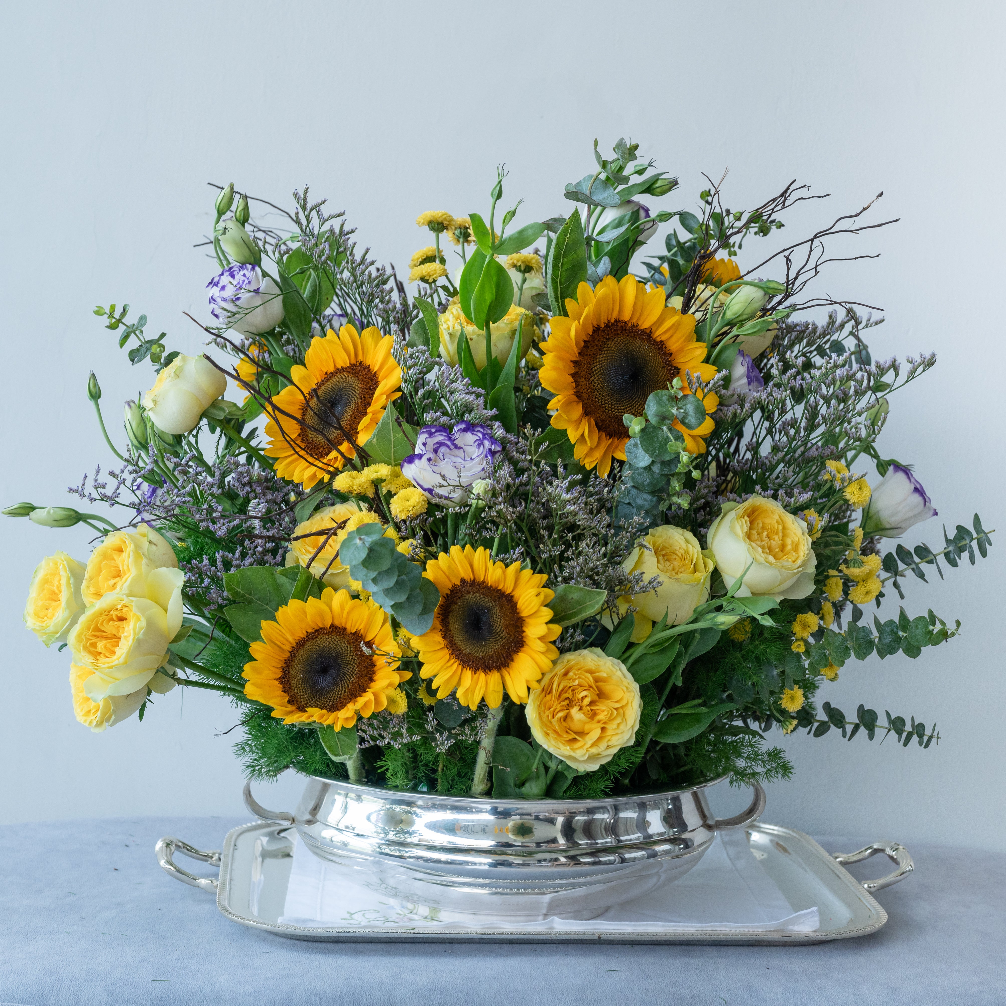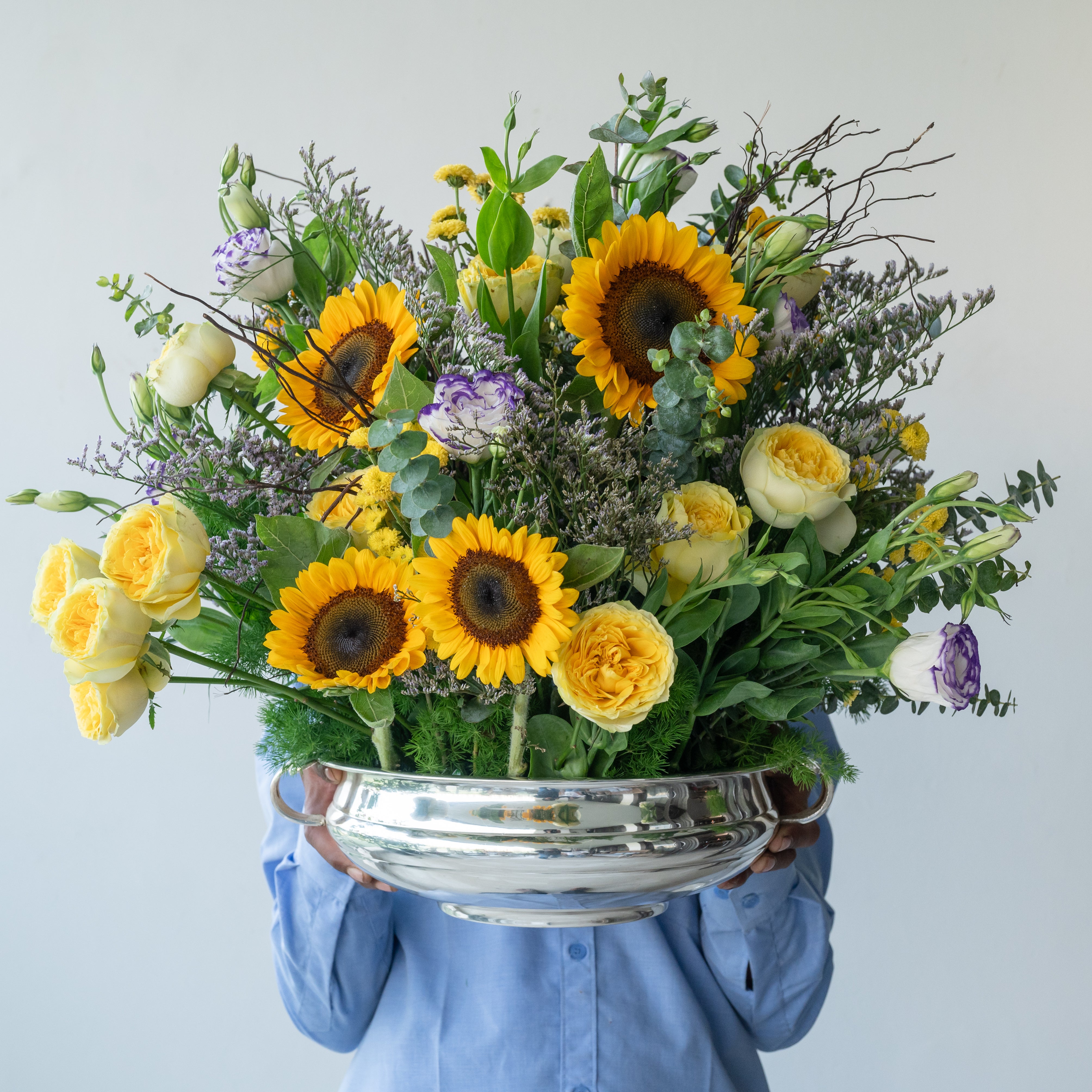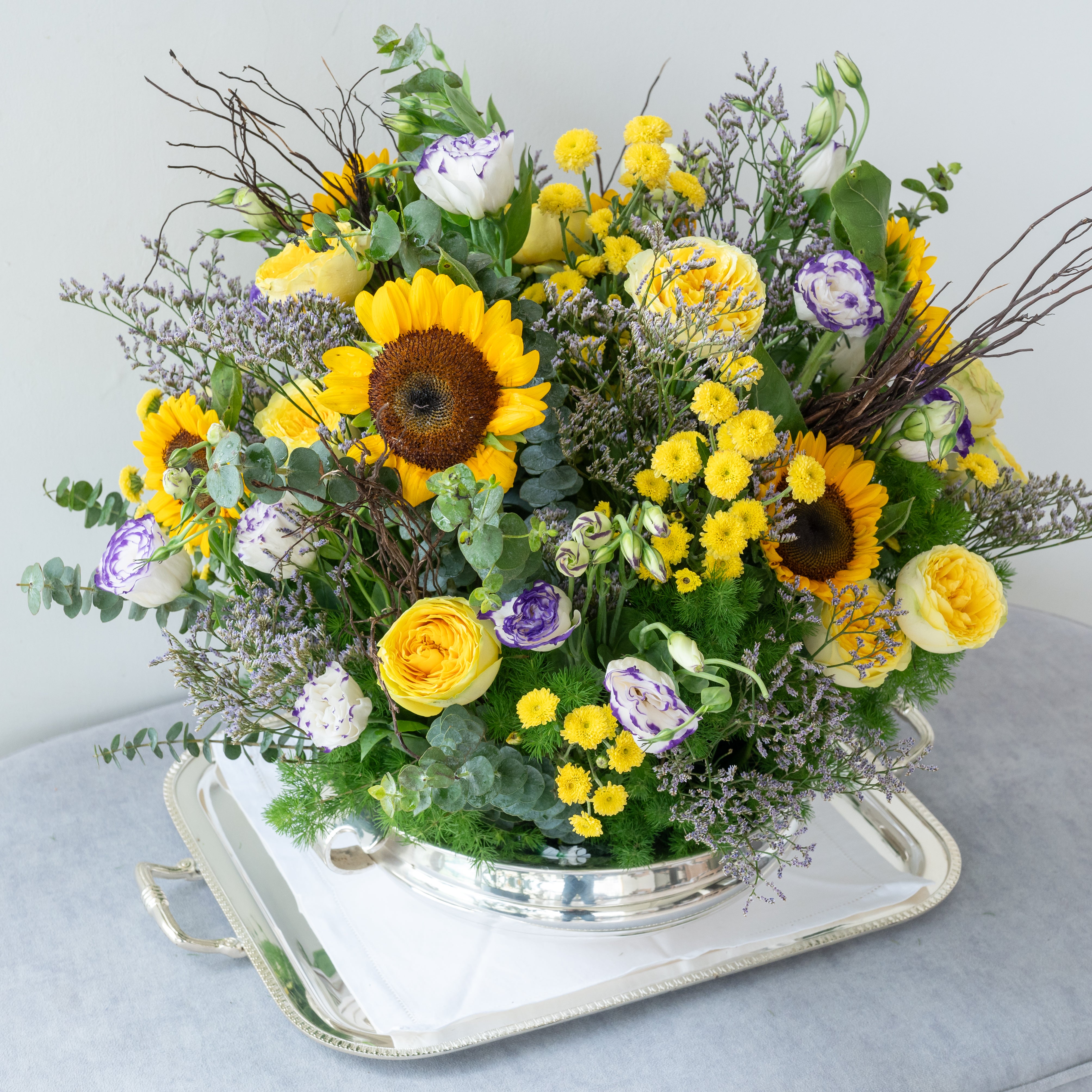 Flowers: Sunflower, Yellow Button Daisy, Double Shaded Purple Eustomas, Yellow Cabbage Roses, Euacalyptus, Limonium & Mixed Greens