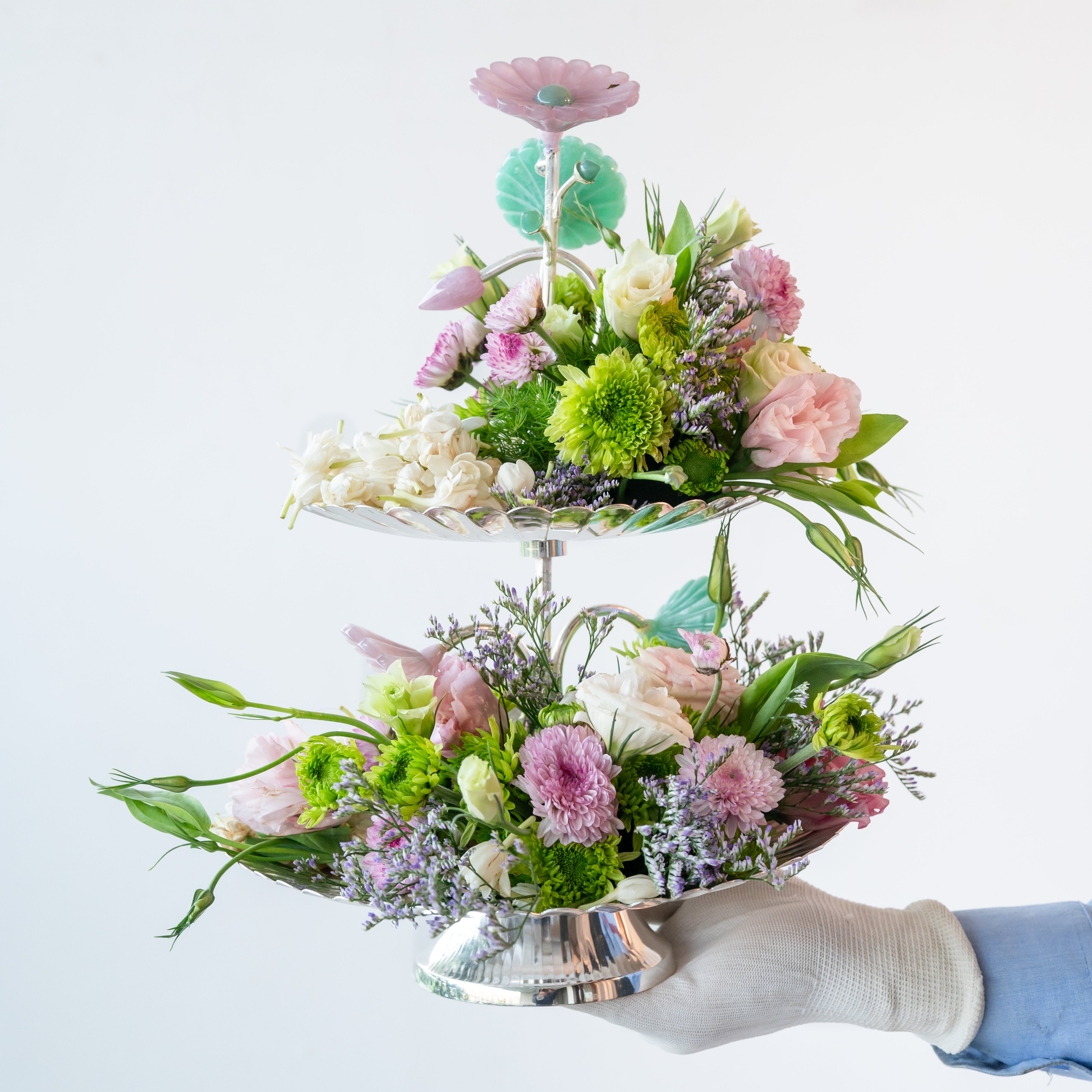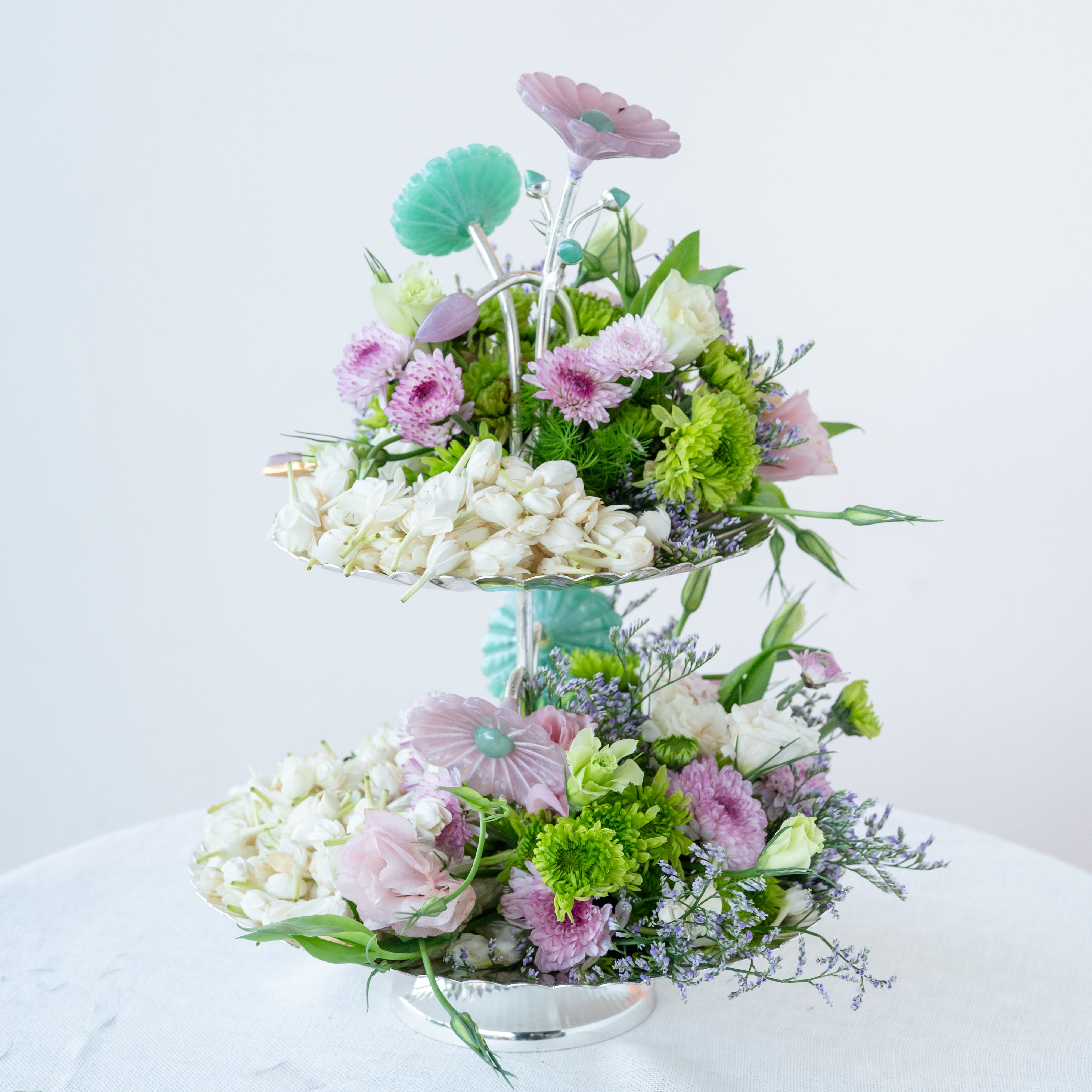 A stunning two-tier cake stand transformed into a breathtaking floral arrangement — an elegant blend of freshness and creativity. Adorned with delicate blooms in soft pastel shades of pink, white, green, and lavender, this piece beautifully combines charm and sophistication.
